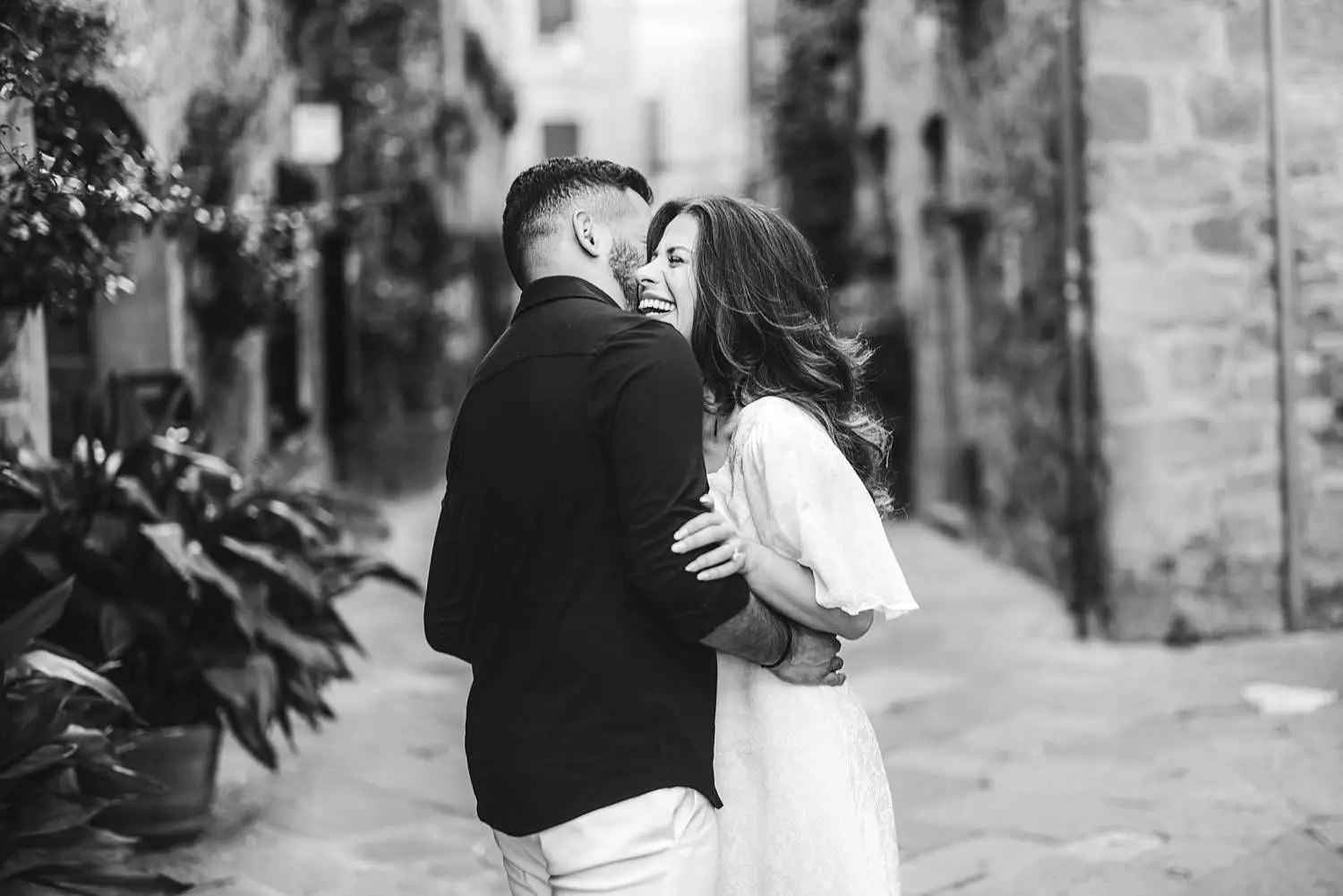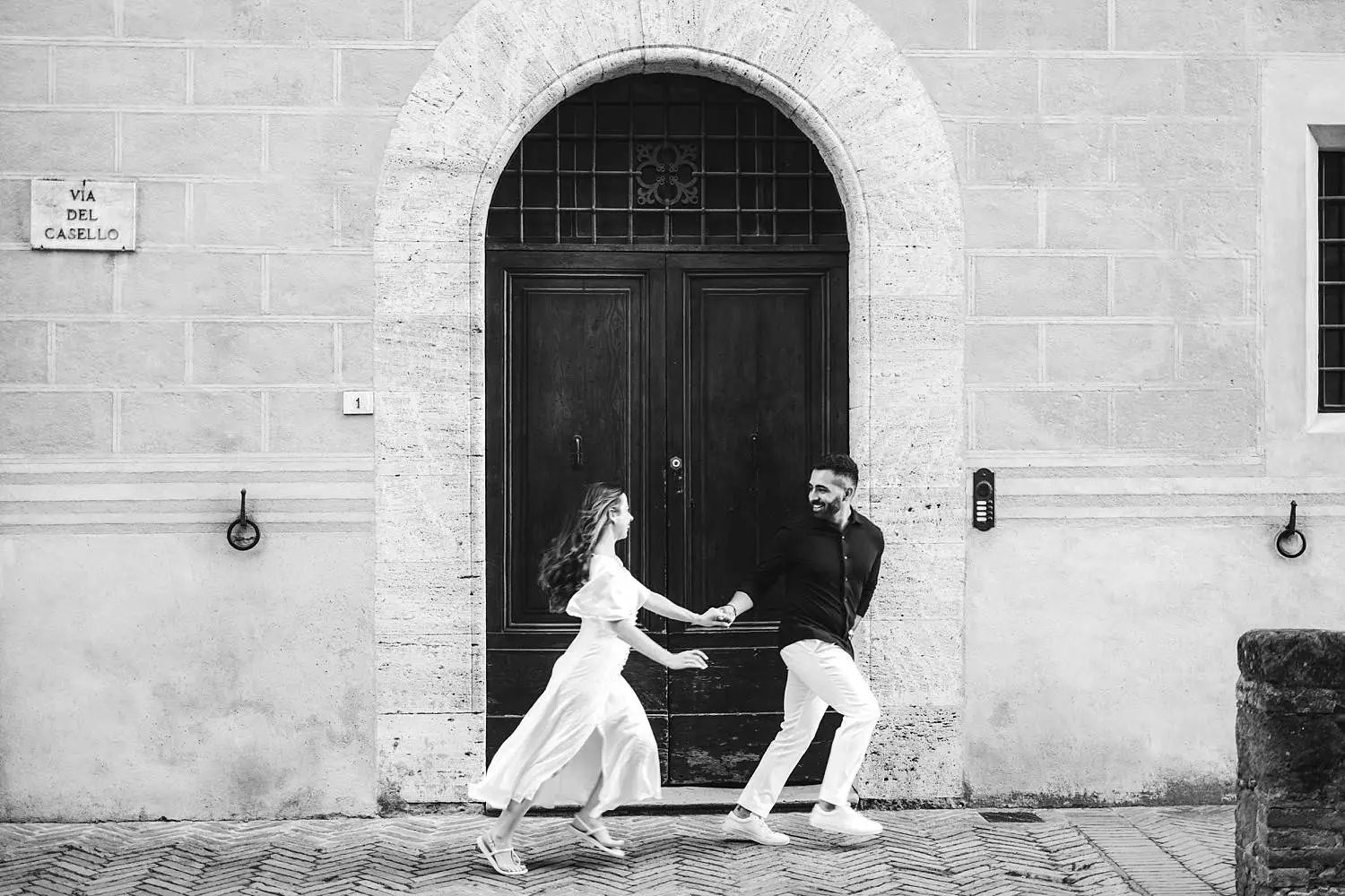 Genuine and spontaneous couple photo shoot in the heart of Pienza. Photo by the Italian elegant engagement photographer in Tuscany Gabriele Fani