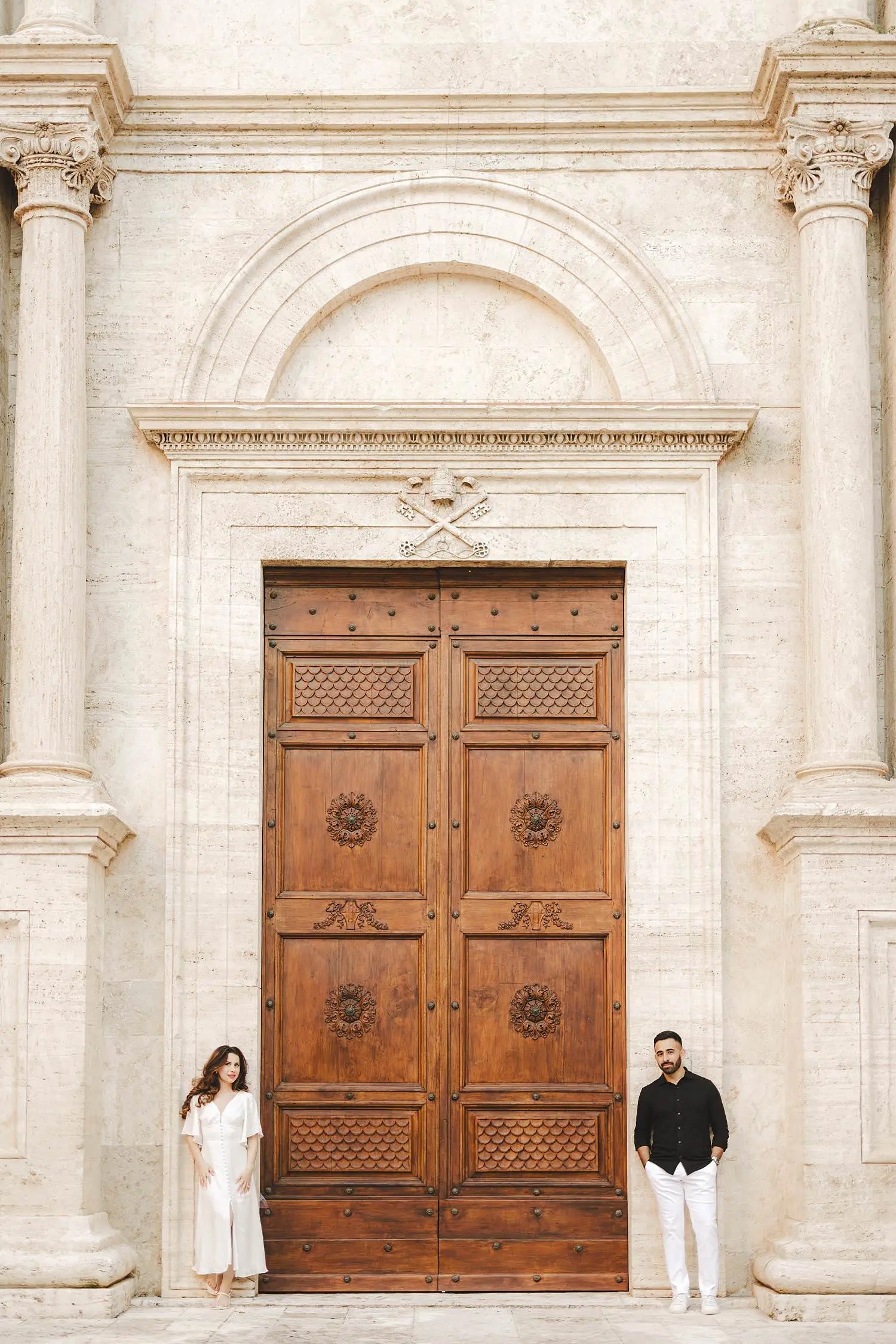 Lovely couple photo shoot in the historic center of Pienza featuring an ancient door of the town. Photo by the Italian elegant engagement photographer in Tuscany Gabriele Fani