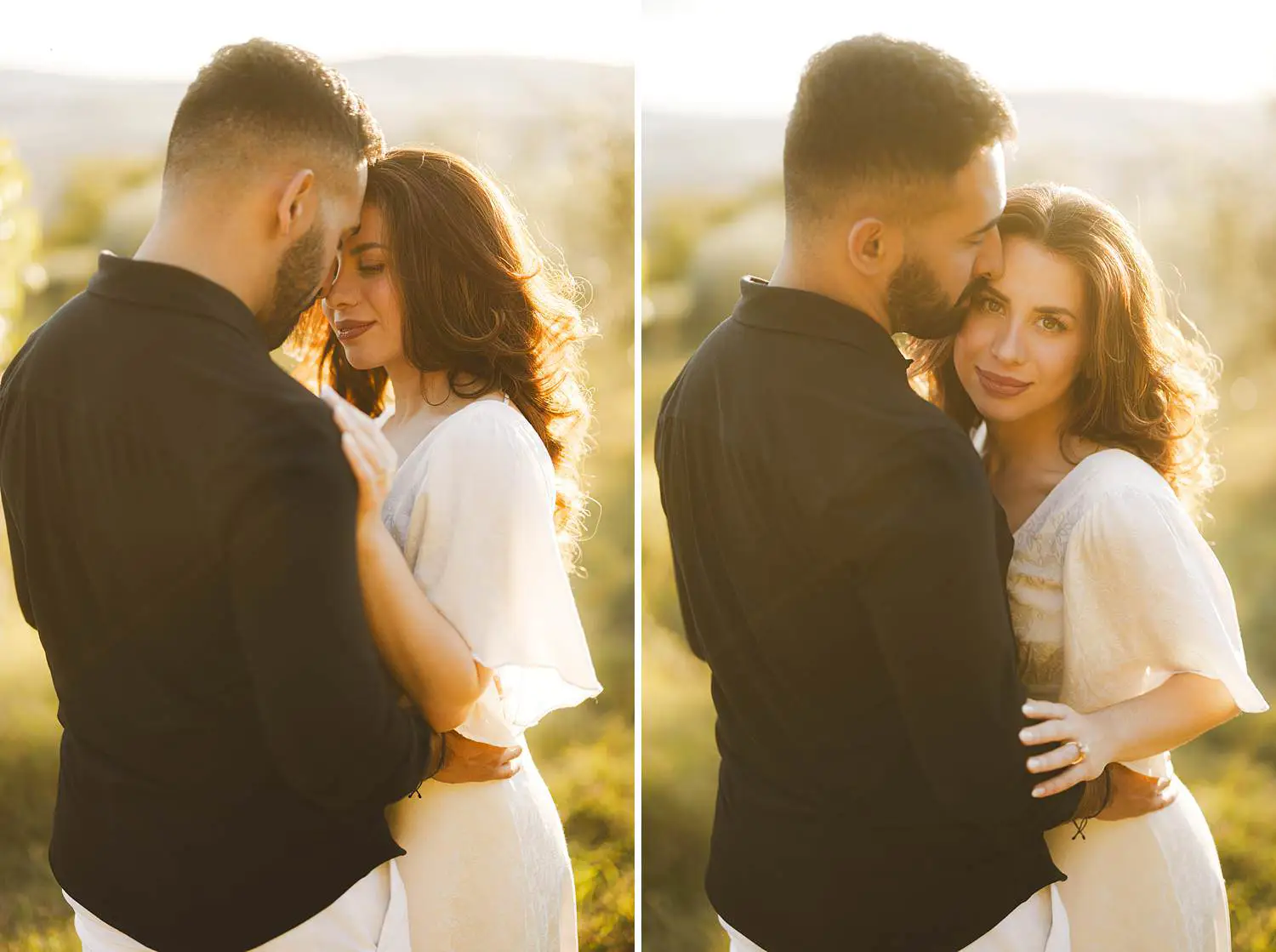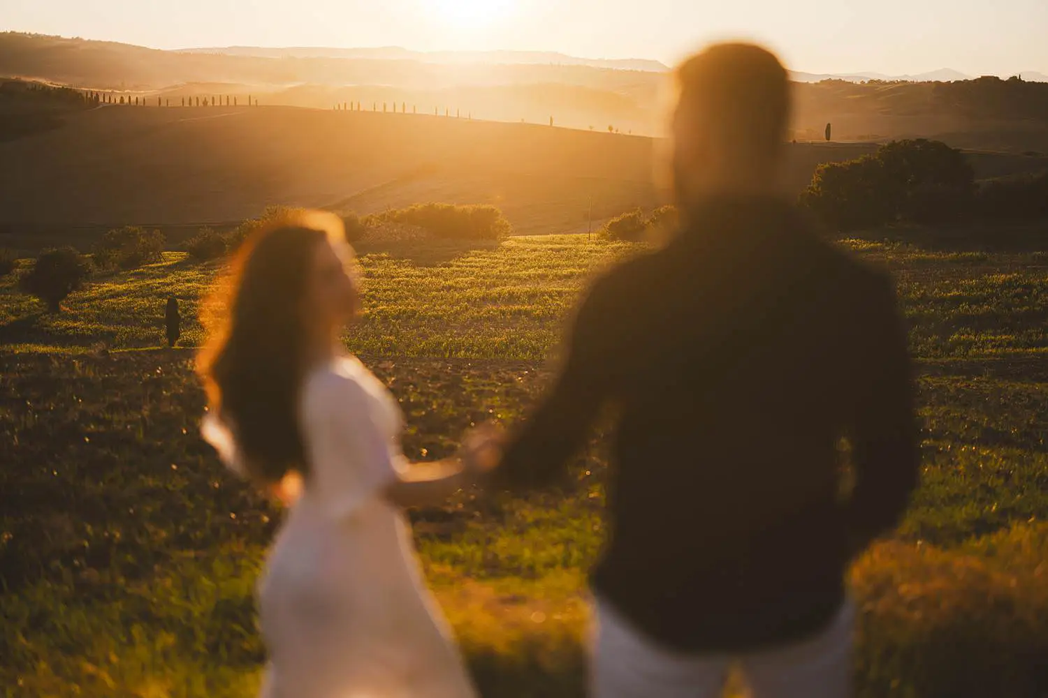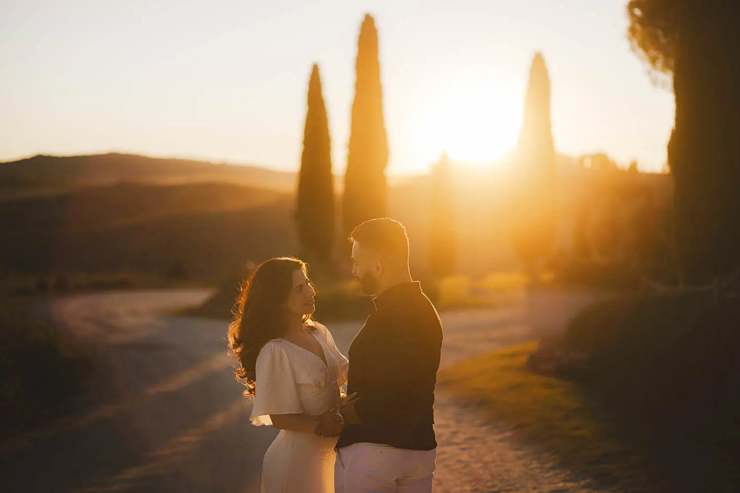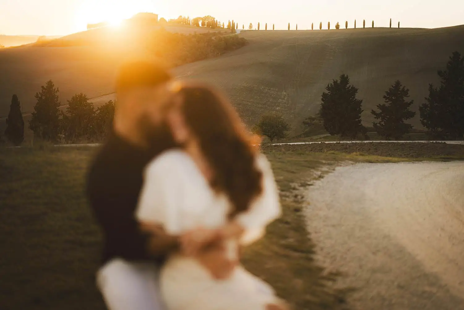 Romantic couple photo shoot under golden light in the heart of Val d’Orcia near Pienza. Photo by the Italian elegant engagement photographer in Tuscany Gabriele Fani