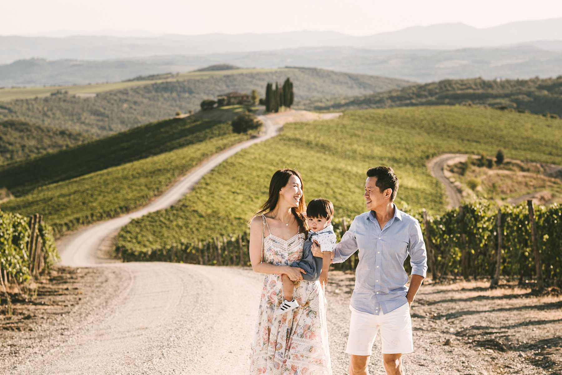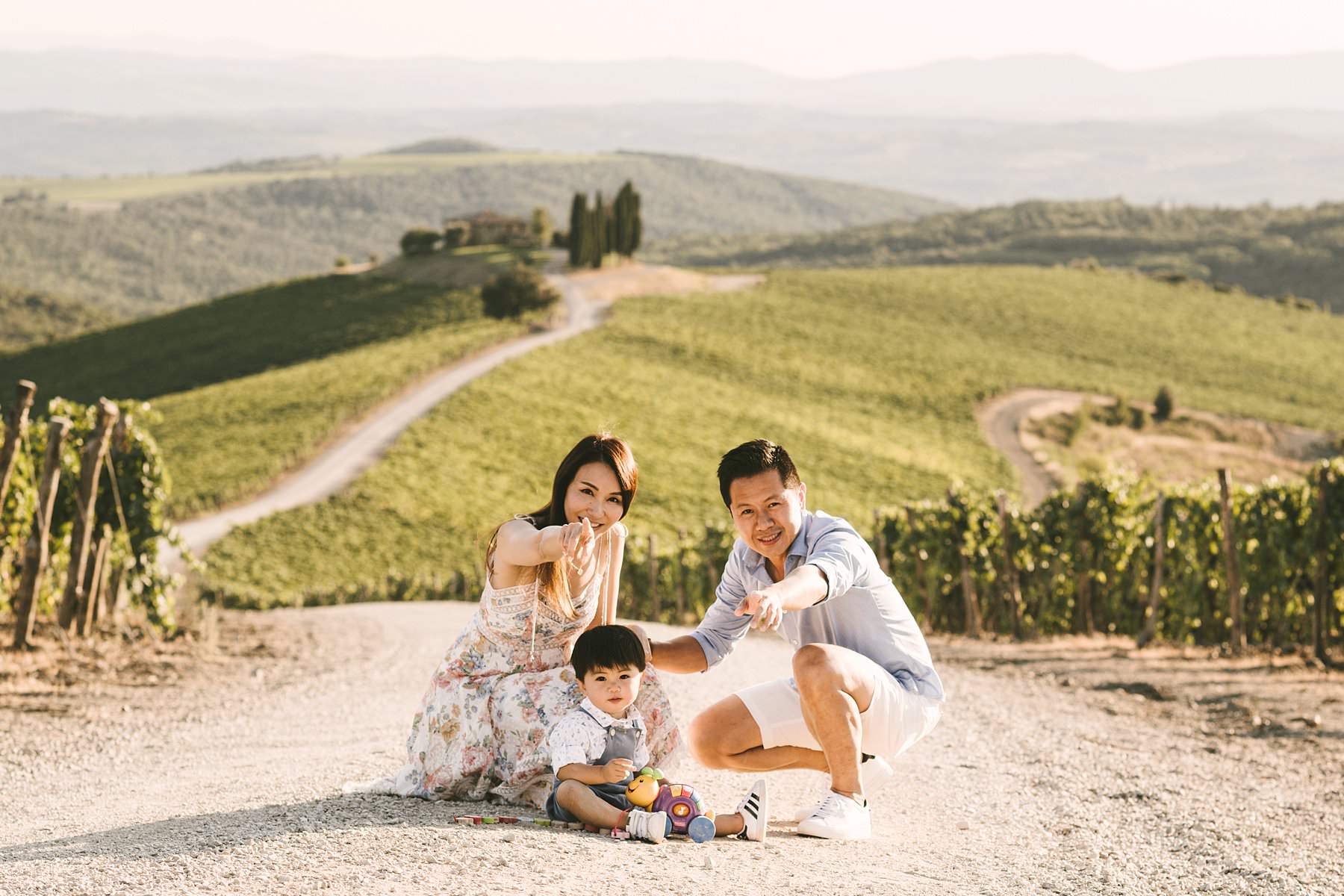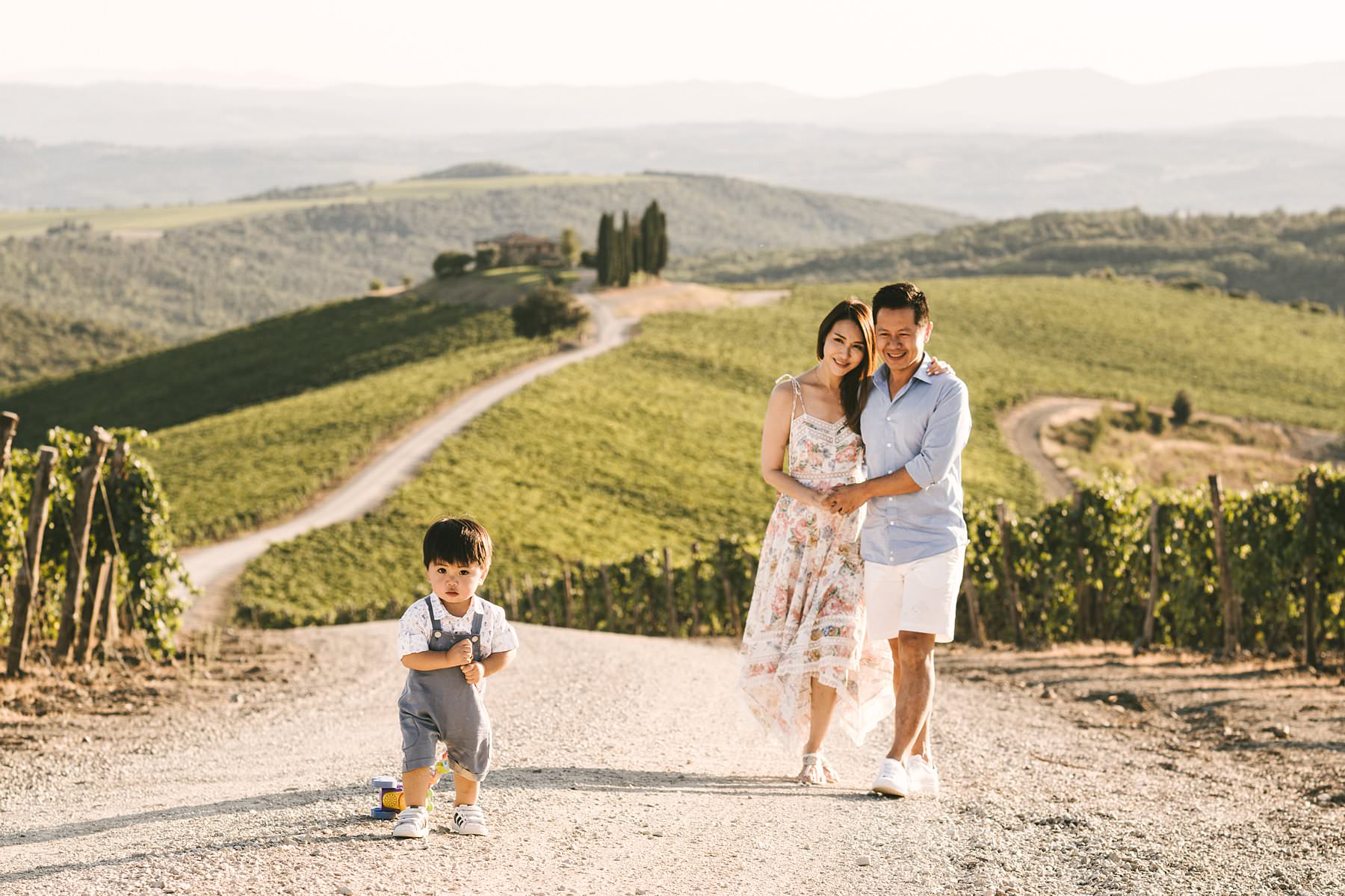 Sweet family holiday photoshoot in the wonderful Tuscan countryside. Serena and Kelvin, wife and husband from Singapore, chose Tuscany as the destination of a relaxing holiday with their littlest love: their son. Since he was so young, they decided to contact me for a family holiday photoshoot so that the memory of those days would live forever – for all of them. Italy offers a ton of incredibly beautiful places to visit on your next vacation, and Tuscany provides some of the most splendid settings for an emotional family holiday photoshoot. Rosewood Castiglion del Bosco is definitely one of those: with its 5000-acre estate tucked in the heart of Val d’Orcia, this ancient and perfectly preserved hamlet will make you live a one-of-a-kind experience. When I shot Serena and Kelvin’s family photos, the owners were so kind to open their private “Capanna” vineyard for us. Imagine an endless expanse of rolling hills covered in grapevines, with a white path that guides your gaze to a little, picturesque cypress grove. The warm and golden light of the late afternoon was the finishing touch to a family holiday photoshoot that they will surely cherish forever. Photo by the Italian experienced elegant family photographer in Val d’Orcia, Tuscany based Florence Gabriele Fani