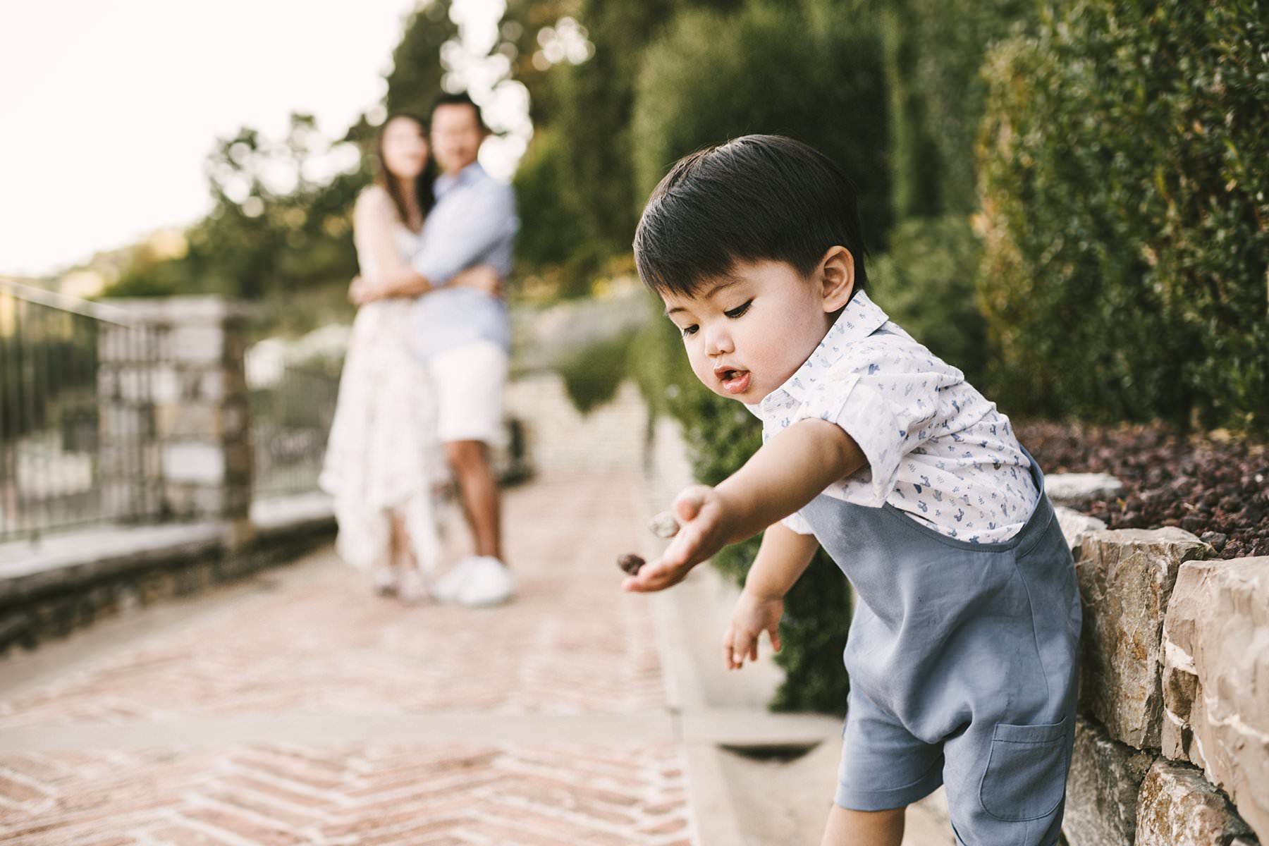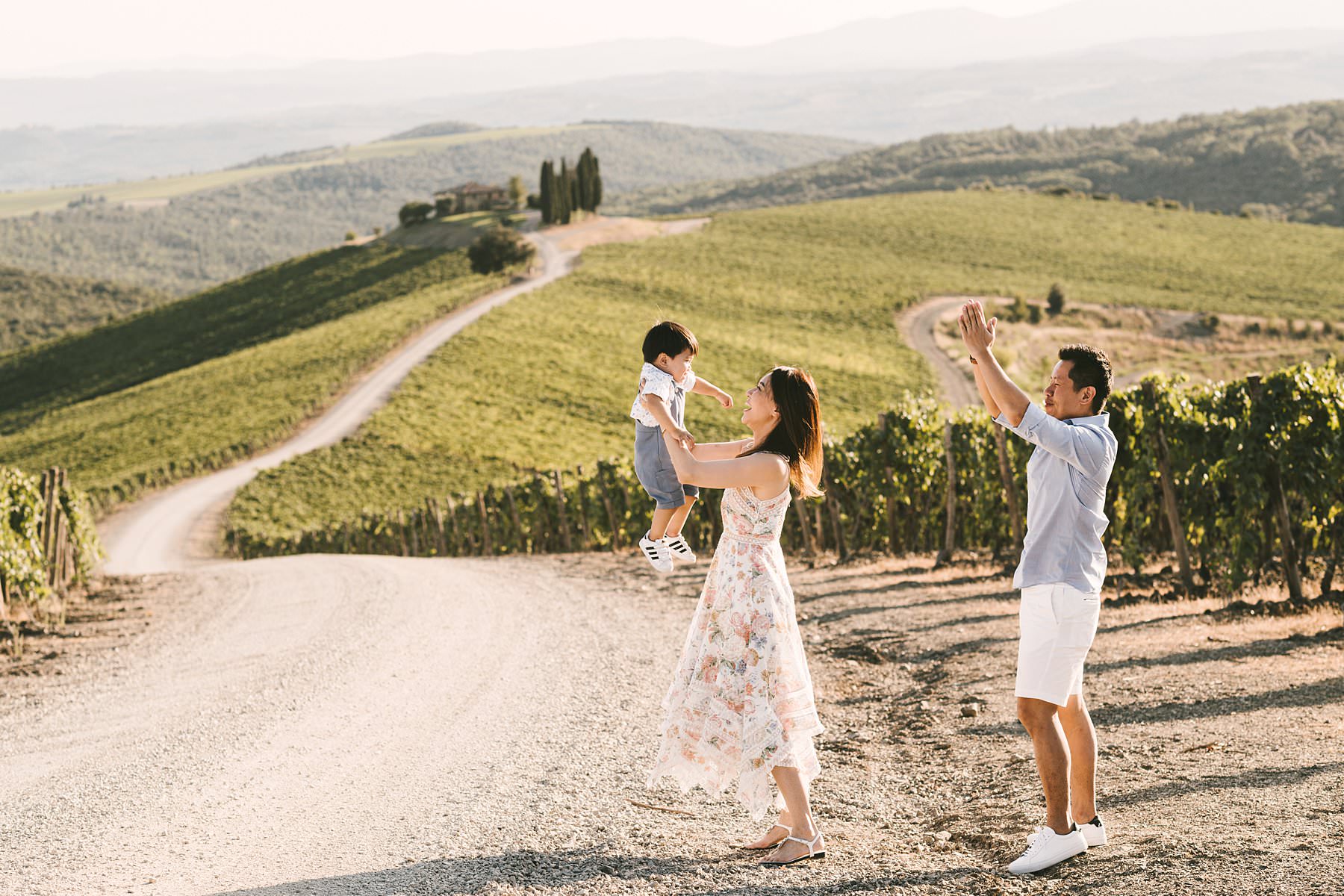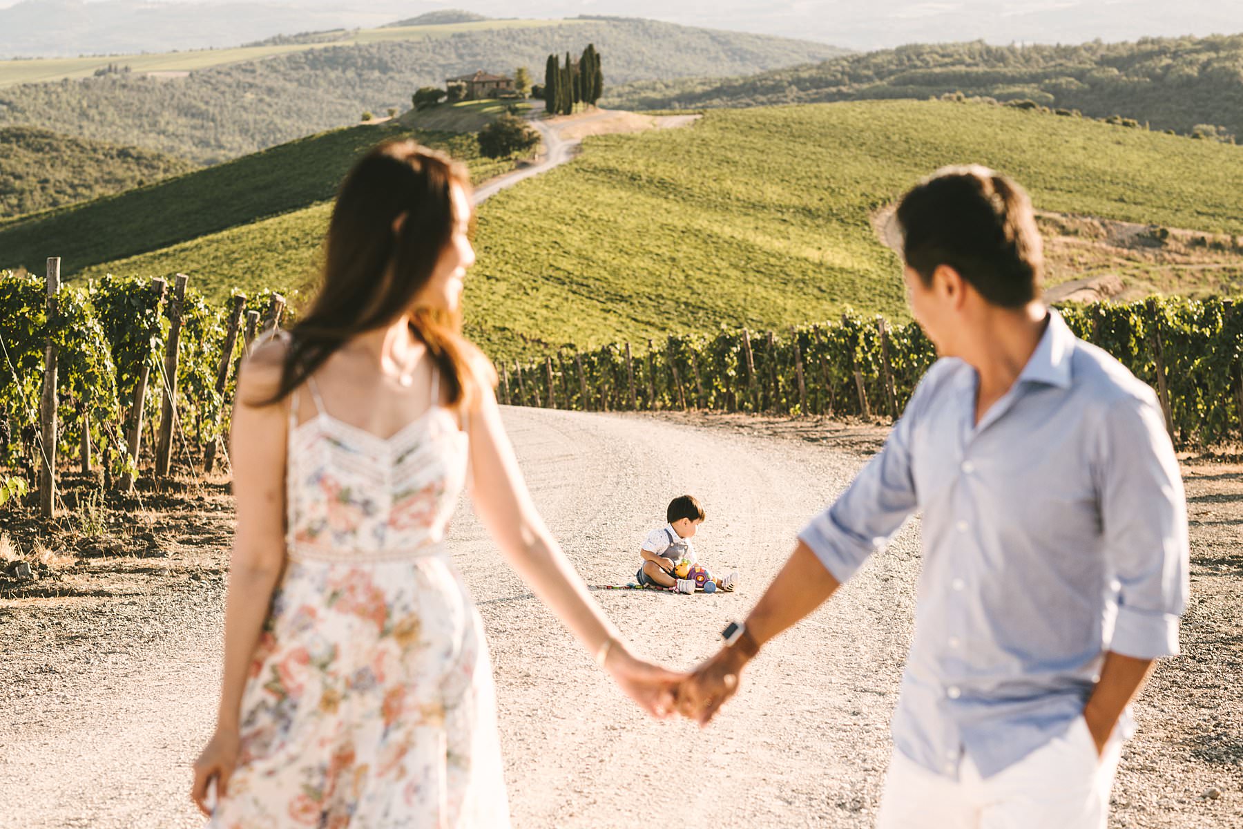 Sweet family holiday photoshoot in the wonderful Tuscan countryside. Serena and Kelvin, wife and husband from Singapore, chose Tuscany as the destination of a relaxing holiday with their littlest love: their son. Since he was so young, they decided to contact me for a family holiday photoshoot so that the memory of those days would live forever – for all of them. Italy offers a ton of incredibly beautiful places to visit on your next vacation, and Tuscany provides some of the most splendid settings for an emotional family holiday photoshoot. Rosewood Castiglion del Bosco is definitely one of those: with its 5000-acre estate tucked in the heart of Val d’Orcia, this ancient and perfectly preserved hamlet will make you live a one-of-a-kind experience. When I shot Serena and Kelvin’s family photos, the owners were so kind to open their private “Capanna” vineyard for us. Imagine an endless expanse of rolling hills covered in grapevines, with a white path that guides your gaze to a little, picturesque cypress grove. The warm and golden light of the late afternoon was the finishing touch to a family holiday photoshoot that they will surely cherish forever. Photo by the Italian experienced elegant family photographer in Val d’Orcia, Tuscany based Florence Gabriele Fani