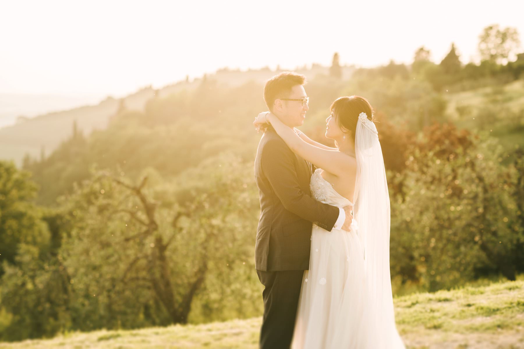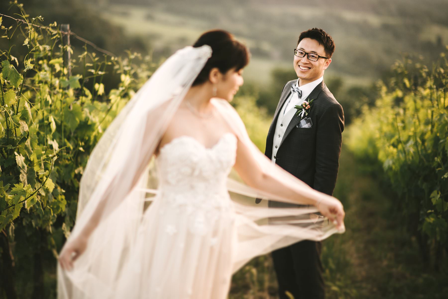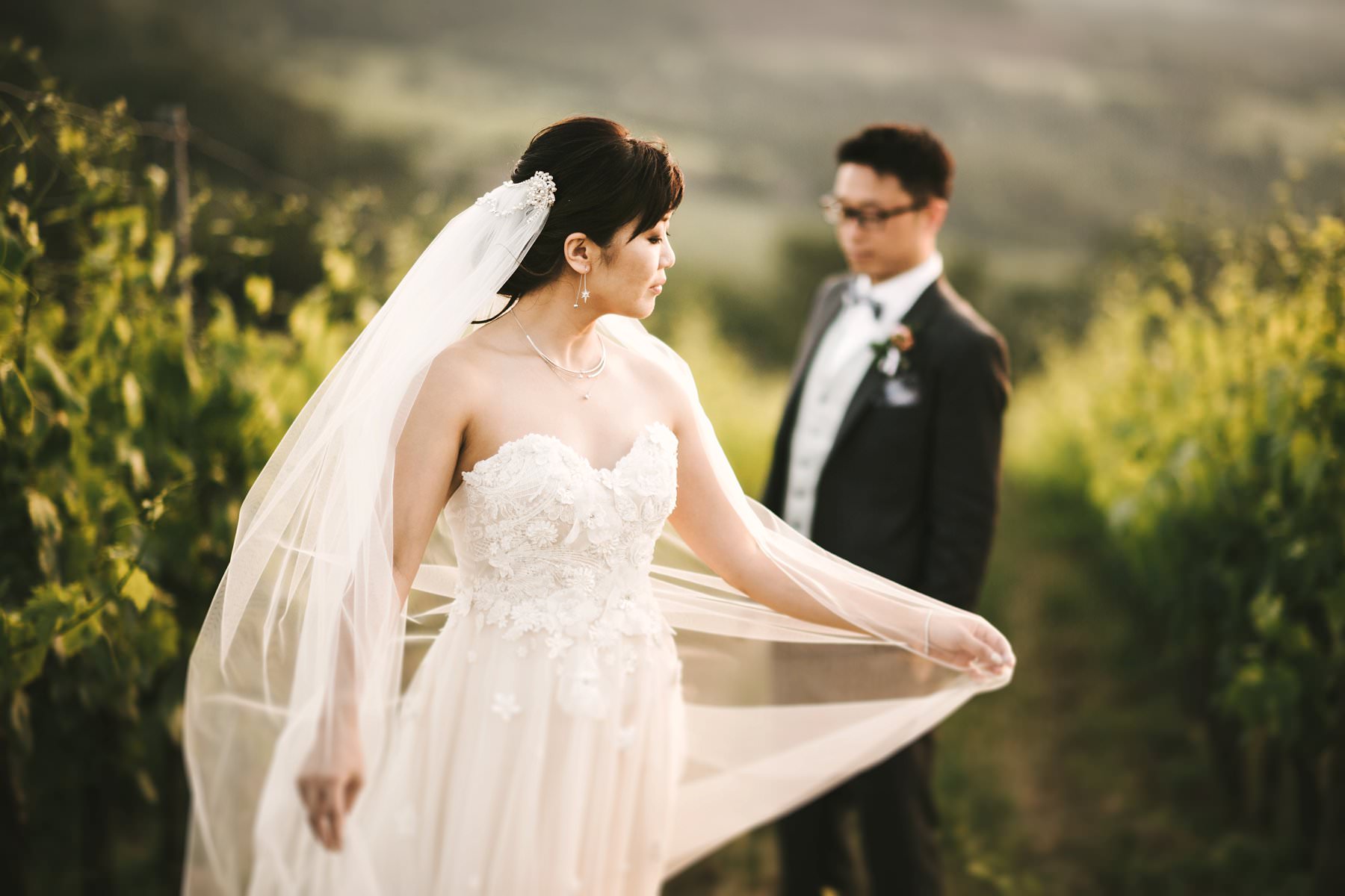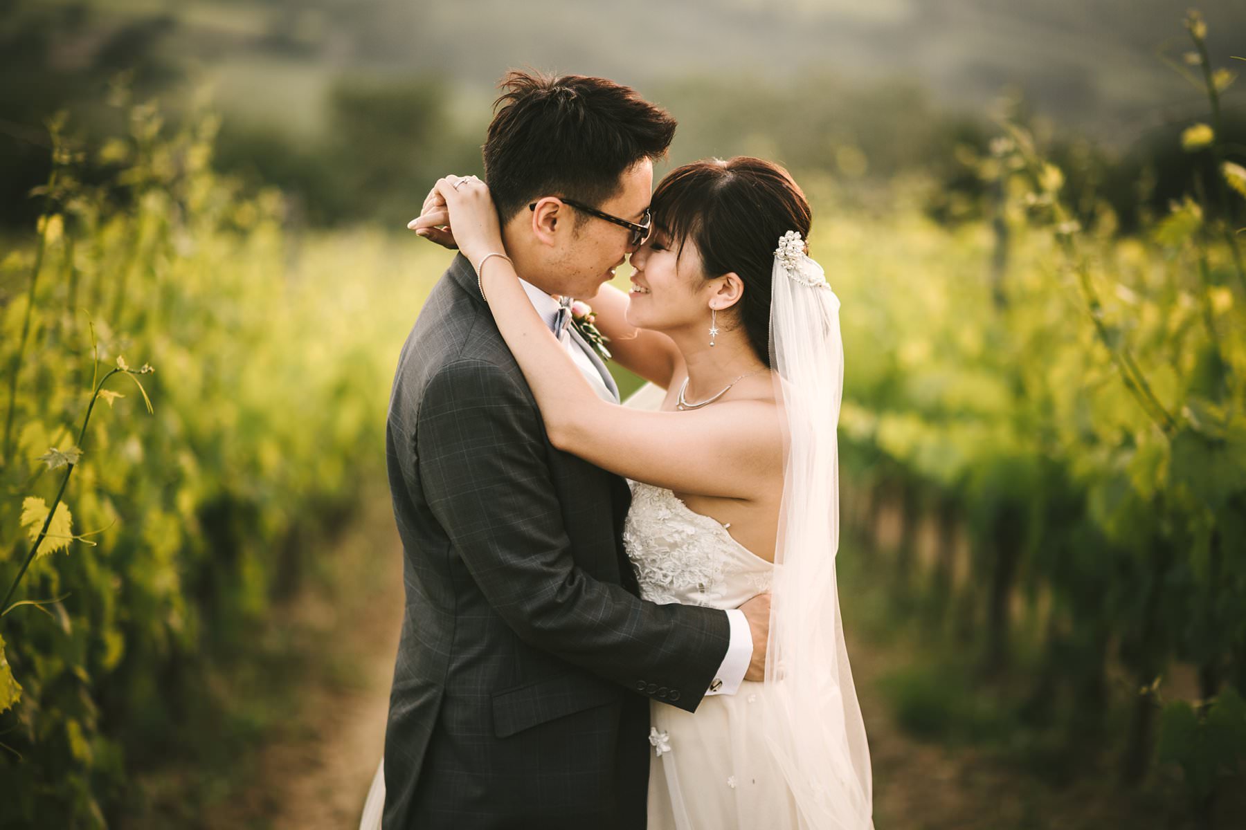 Bride and groom wedding portrait in Tuscan countryside vineyard near Borgo di Petrognano. Golden hour portrait by the creative and modern wedding photographer in Tuscany based Florence Gabriele Fani.