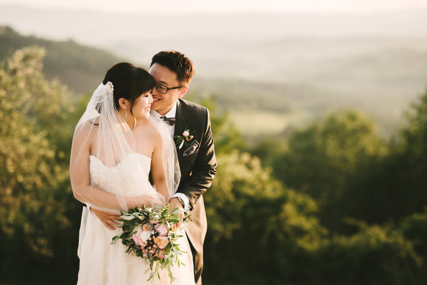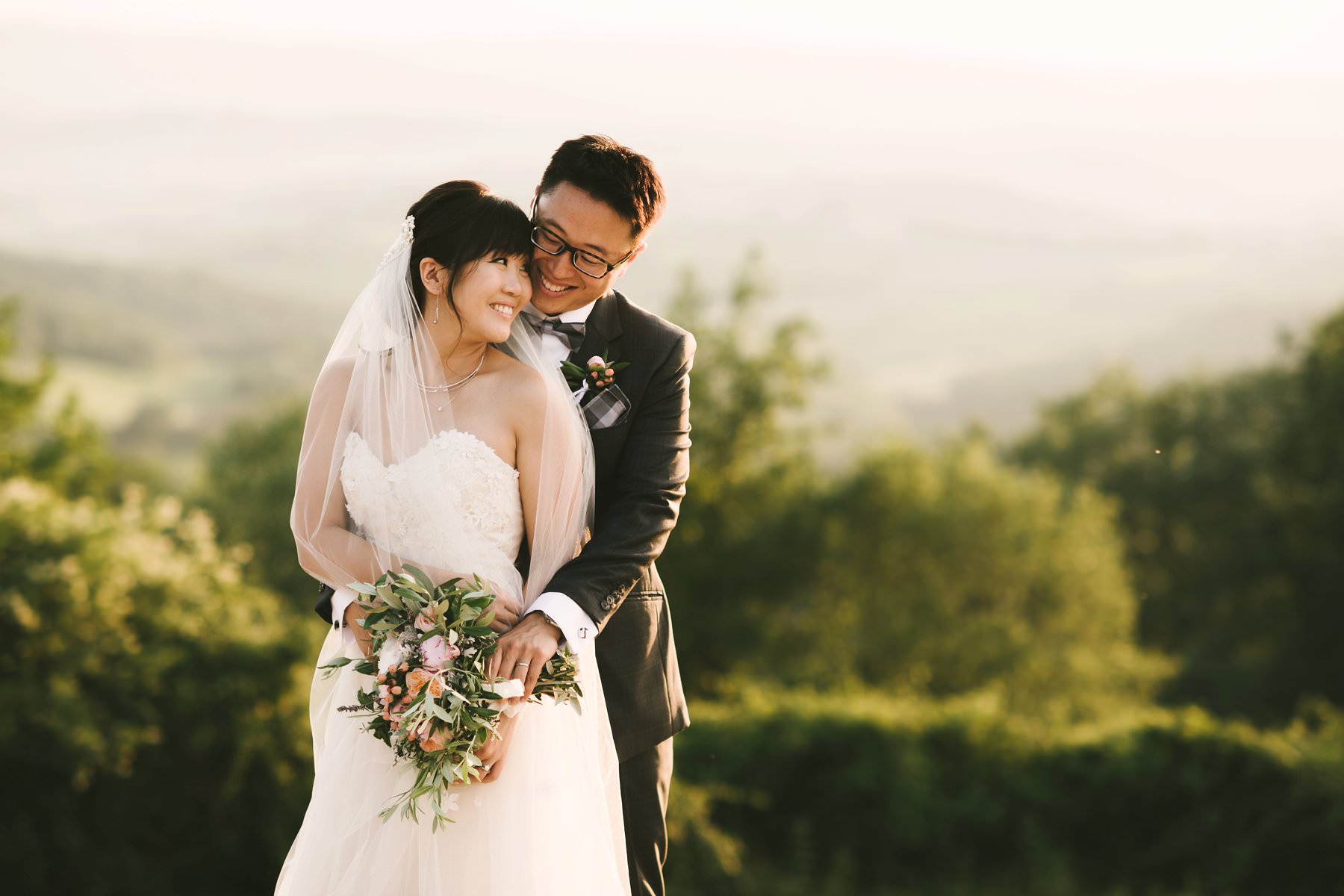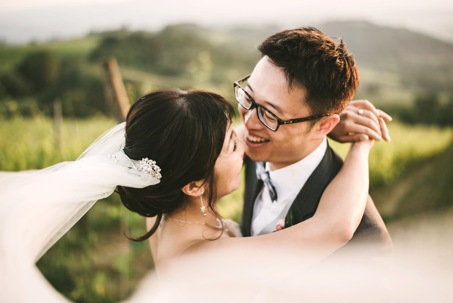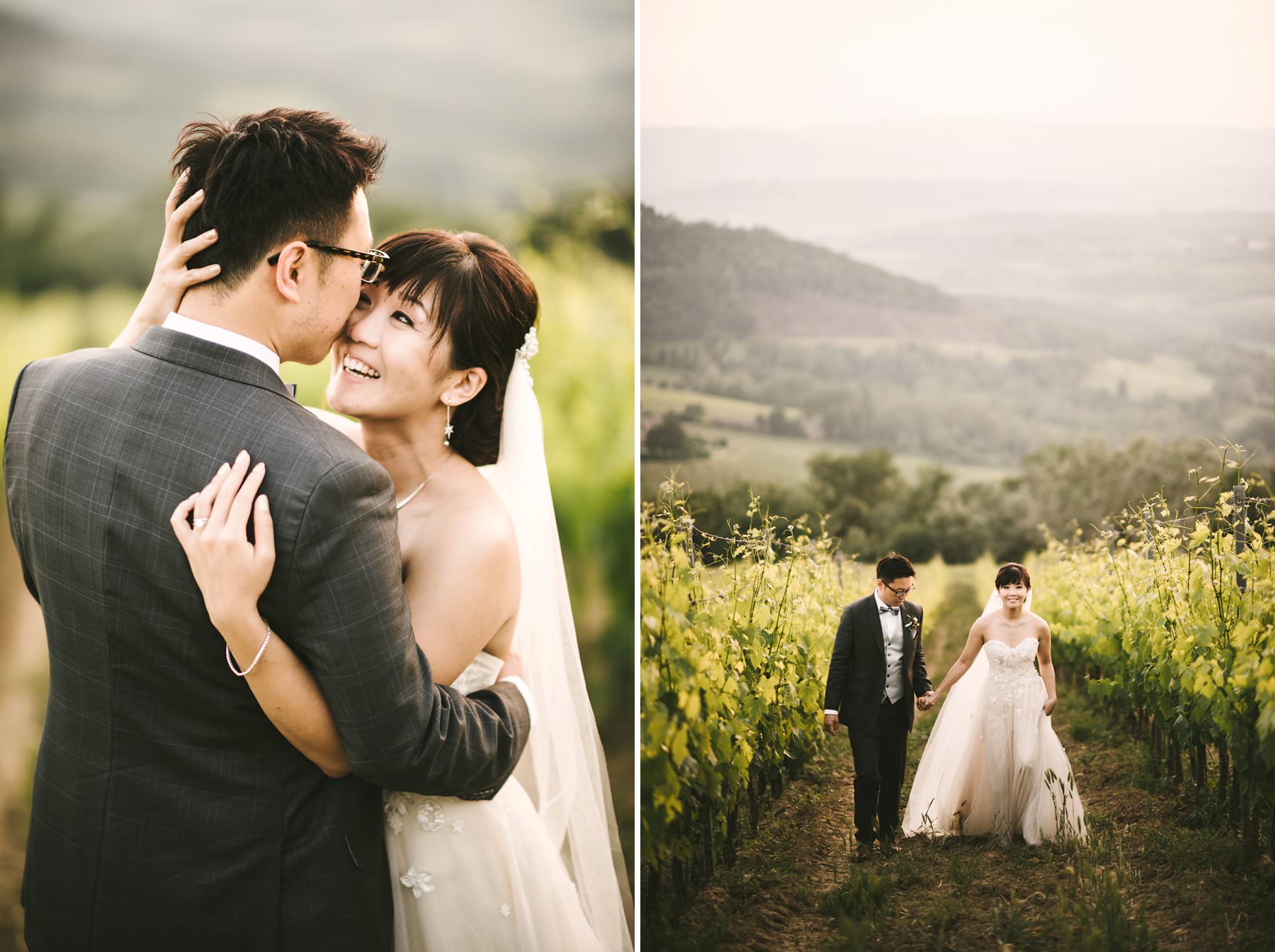 Bride and groom wedding portrait in Tuscan countryside vineyard near Borgo di Petrognano. Golden hour portrait by the creative and modern wedding photographer in Tuscany based Florence Gabriele Fani.