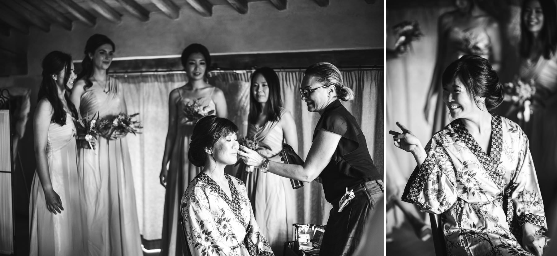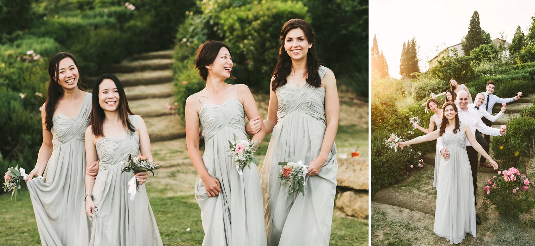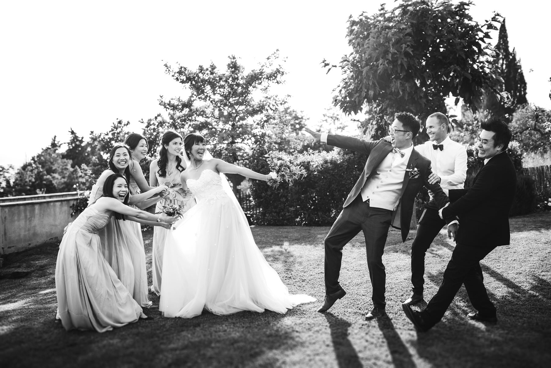 Bridal party funny wedding photo at luxury venue of Borgo di Petrognano in the heart of Chianti in the countryside of Tuscany. Photo by creative wedding photographer Gabriele Fani