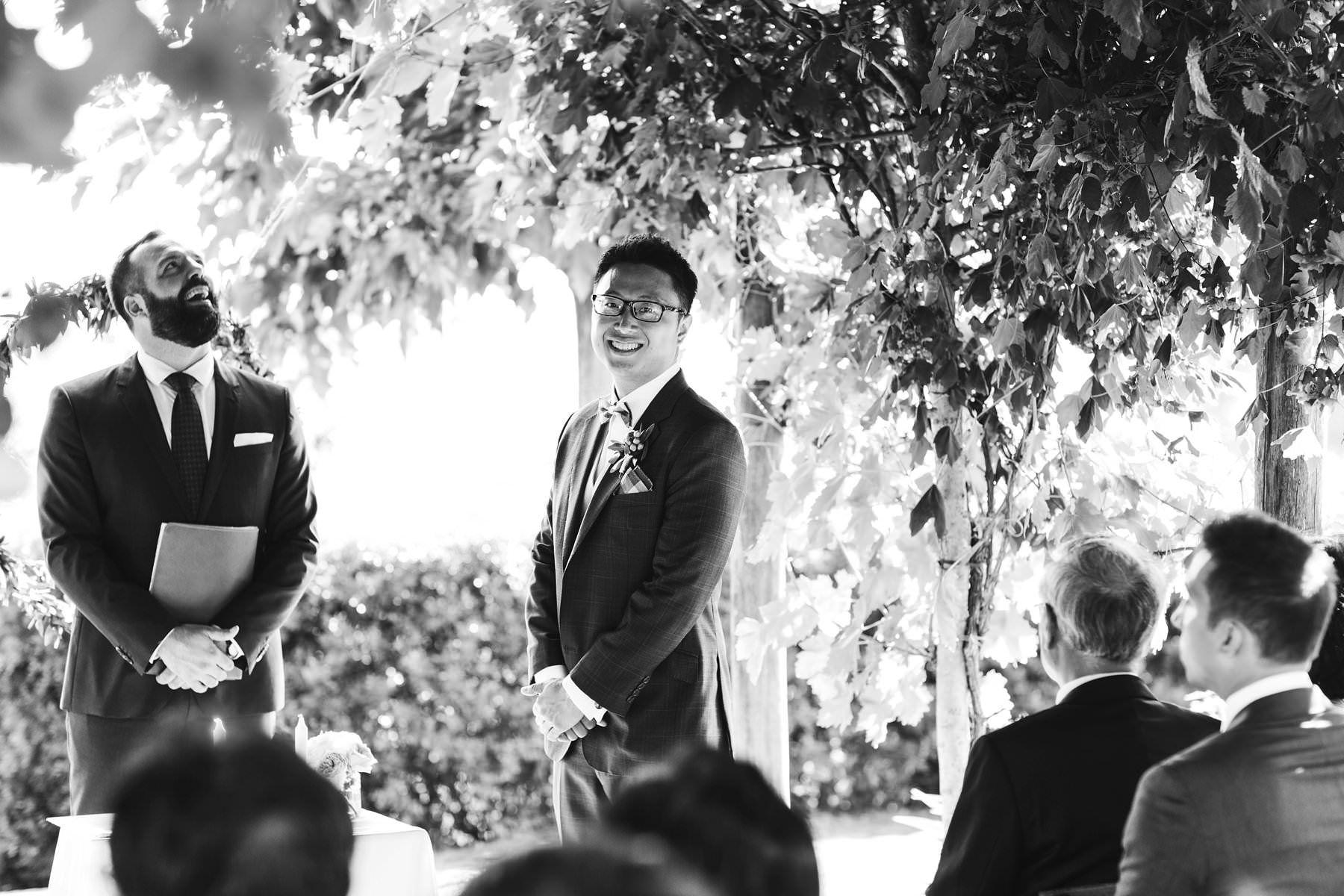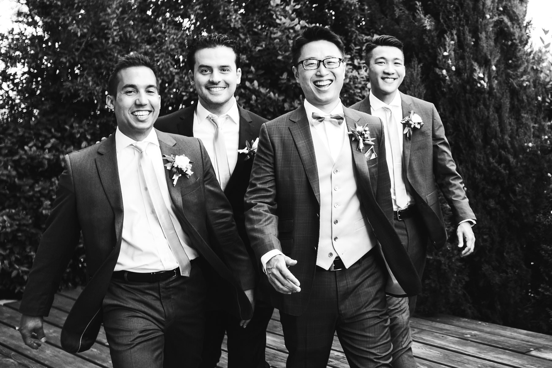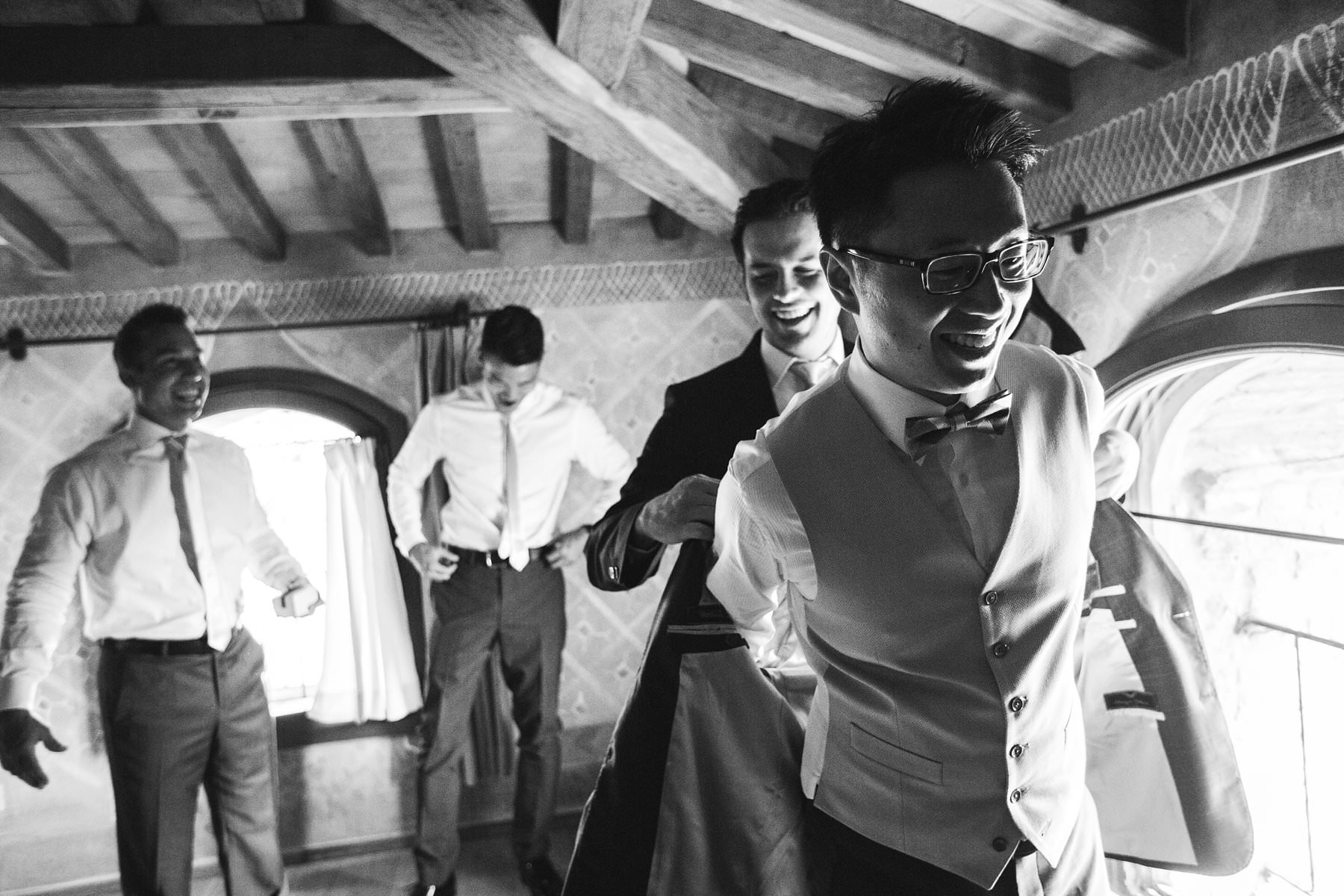 Lovely groom with groomsmen funny picture just before intimate outdoor ceremony. Photo by reportage wedding photographer in Tuscany based Florence Camilla Cheade for Gabriele Fani photographer