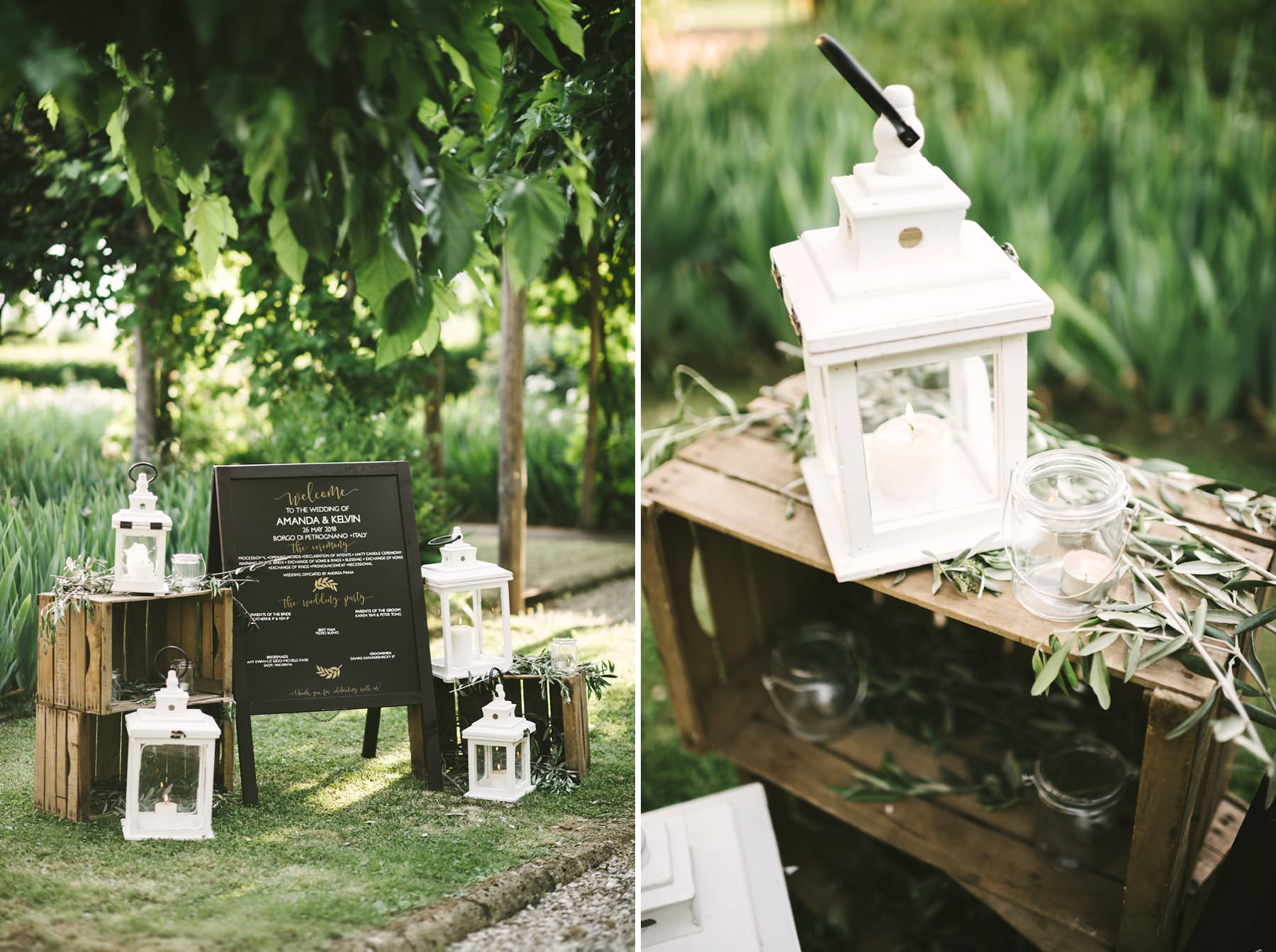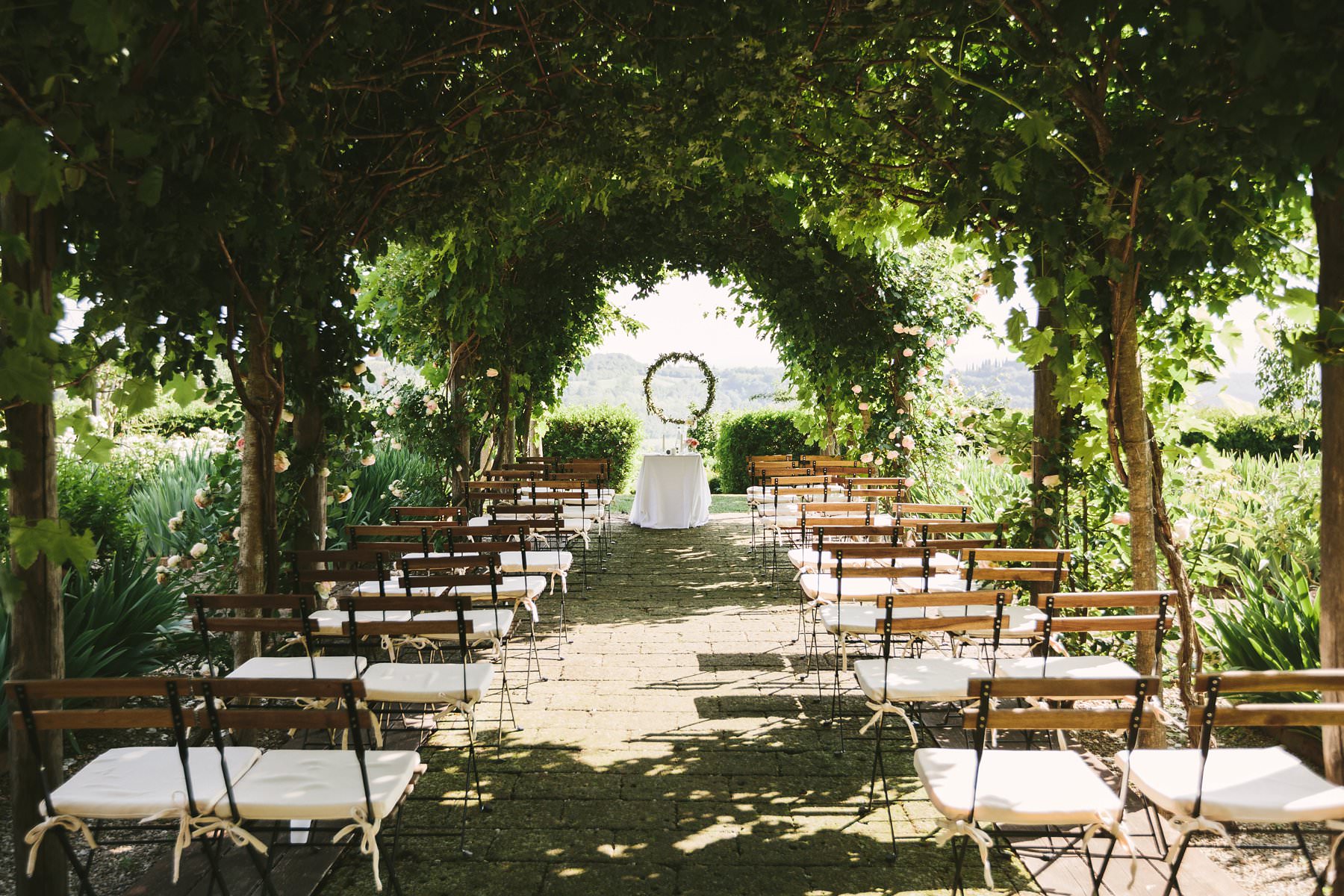 Lovely outdoor ceremony setup in Tuscany countryside venue of Borgo di Petrognano. Italian intimate destination wedding.