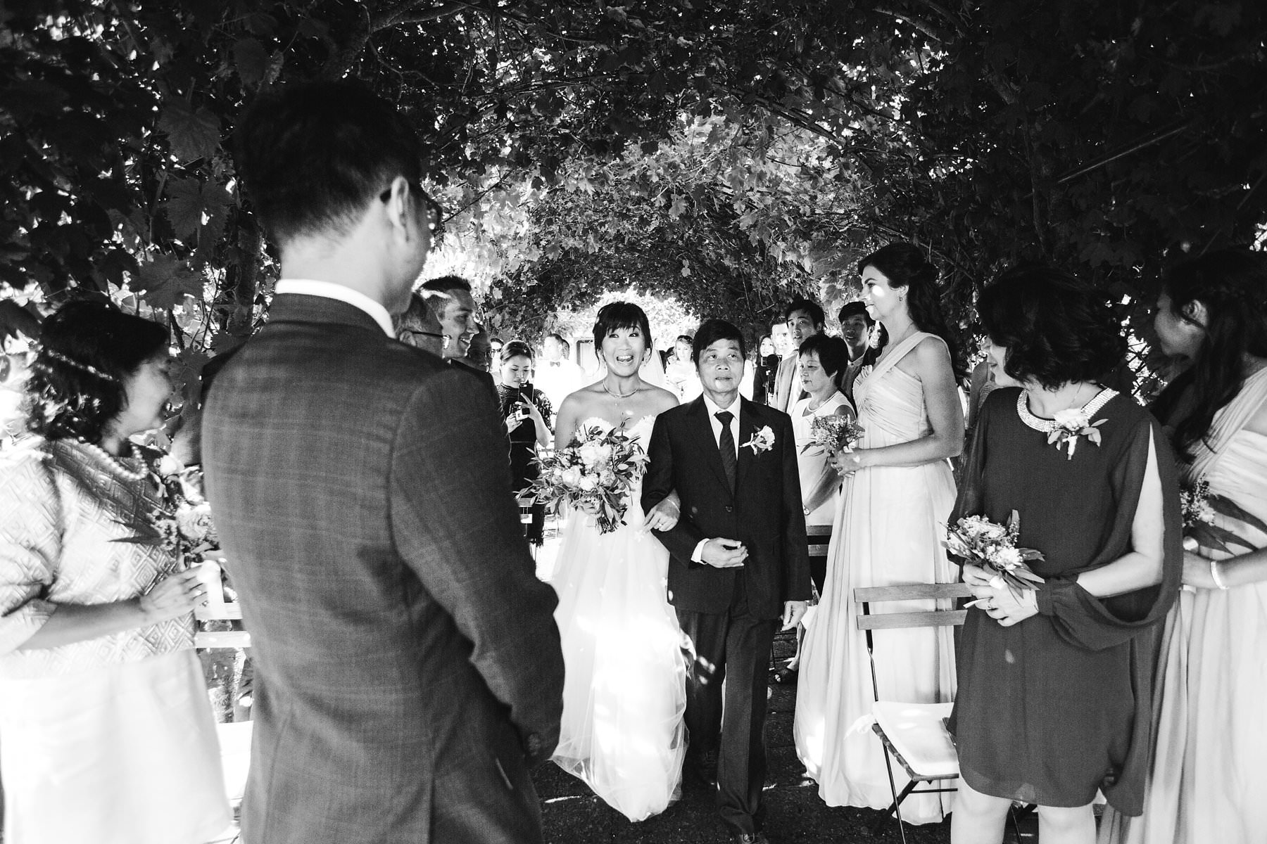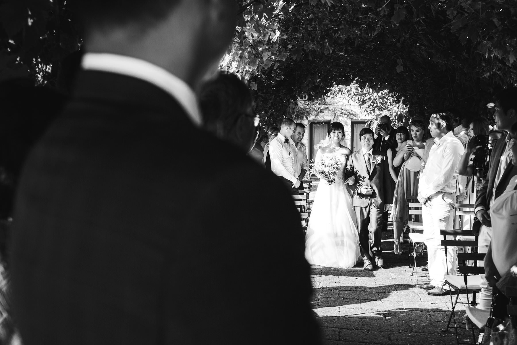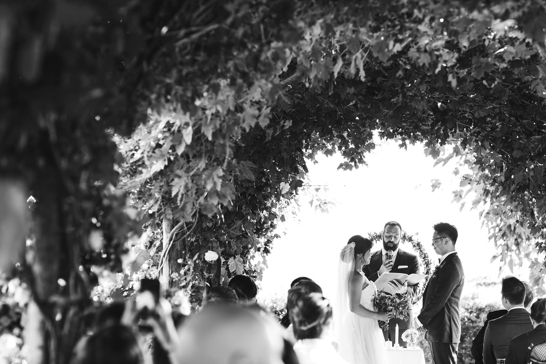 Outdoor intimate ceremony in Tuscany countryside green archway at Borgo di Petrognano. Photo by the Italian wedding photographer in Tuscany based Florence Gabriele Fani