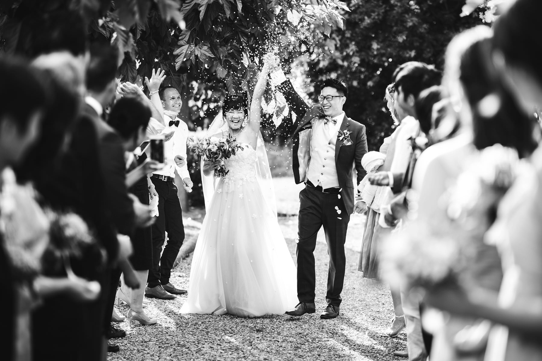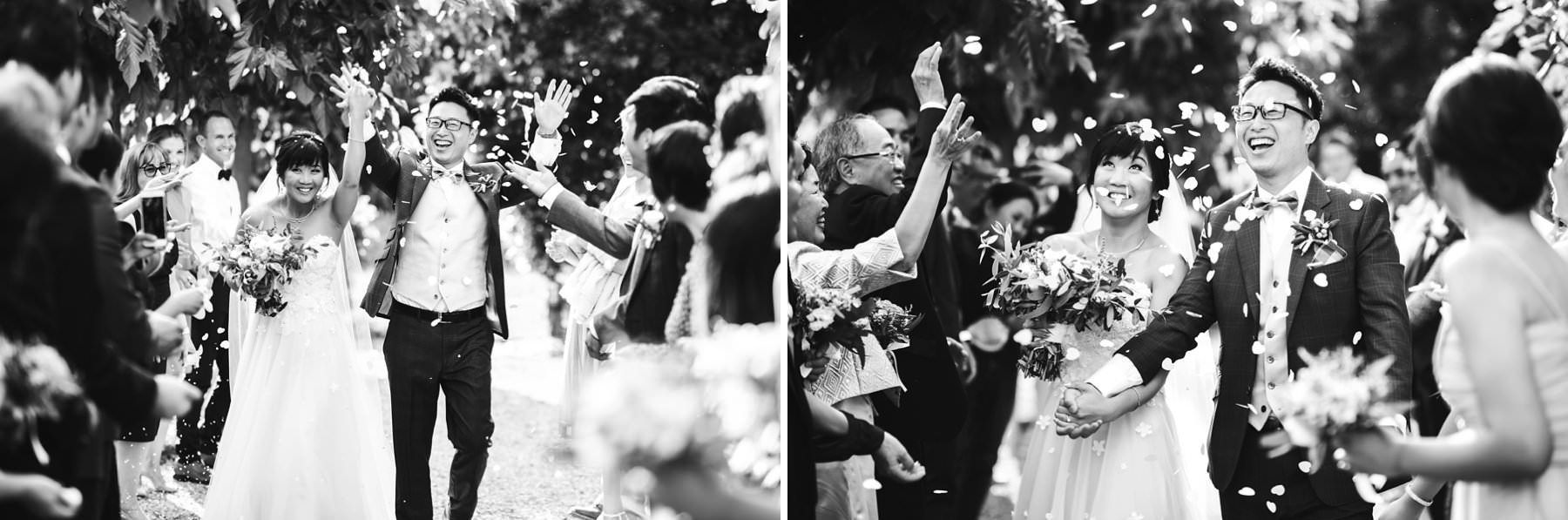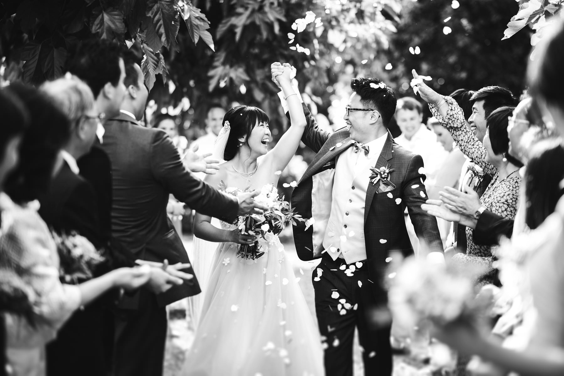 Amazing moment during petal throwing for this intimate destination wedding in Tuscany at Borgo di Petrognano in the heart of Chianti. Bride and groom are just married! Photo by elegant classic and modern wedding photographer in Tuscany based Florence Gabriele Fani