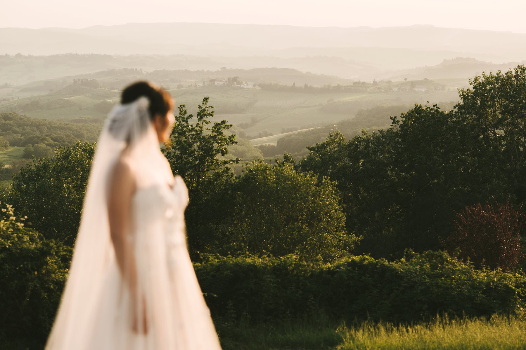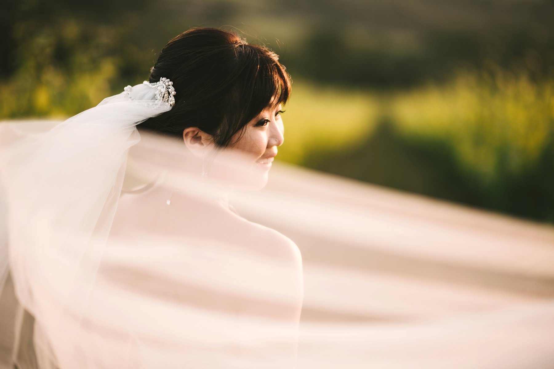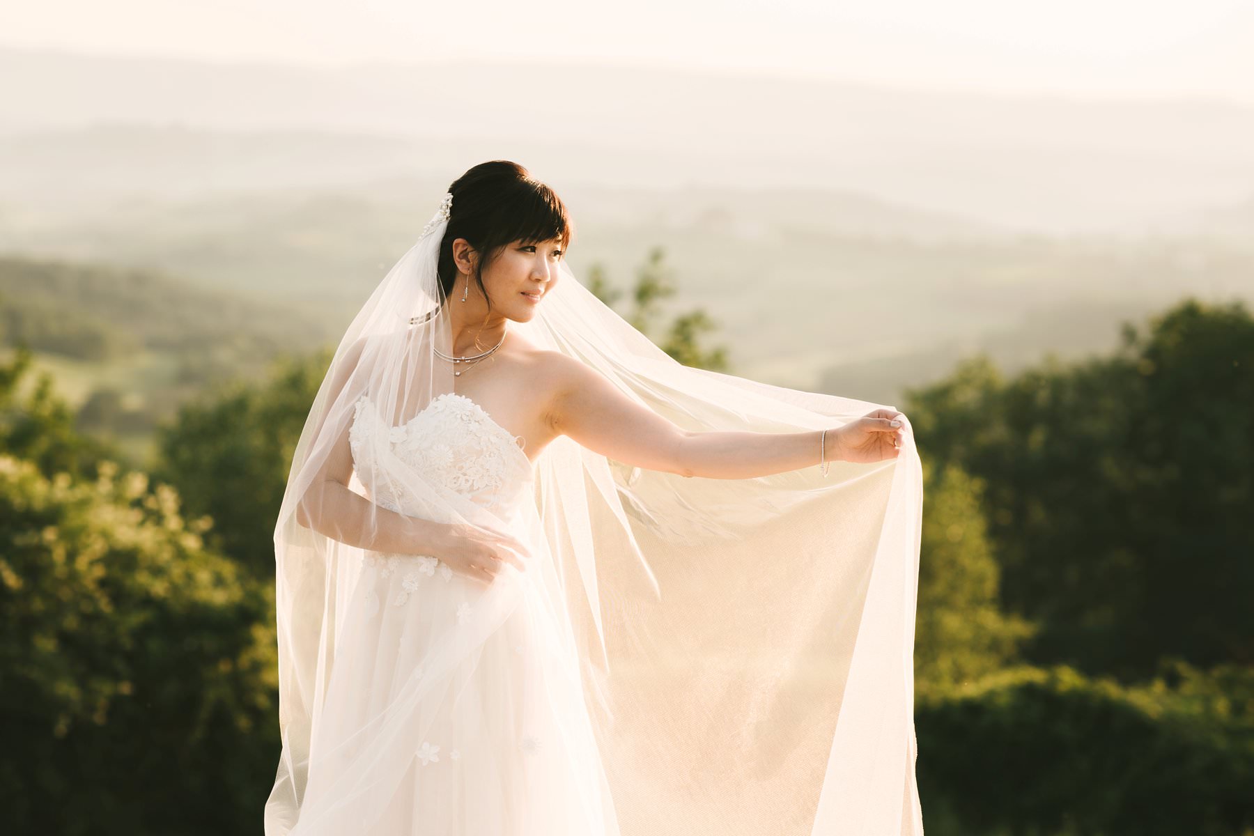 Bride lovely portrait in golden hour into Tuscany countryside of Chianti. Photo by wedding photographer in Tuscany Gabriele Fani