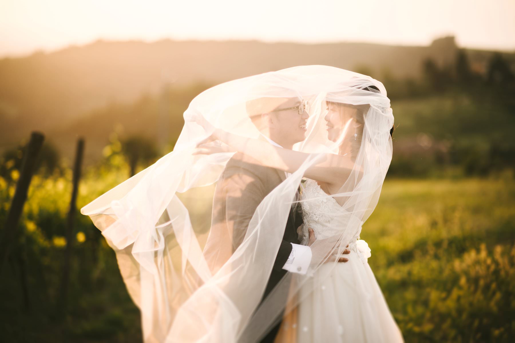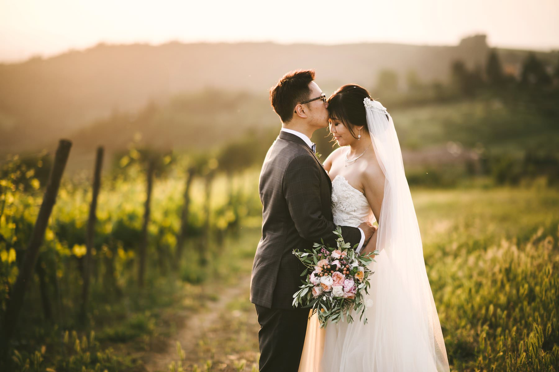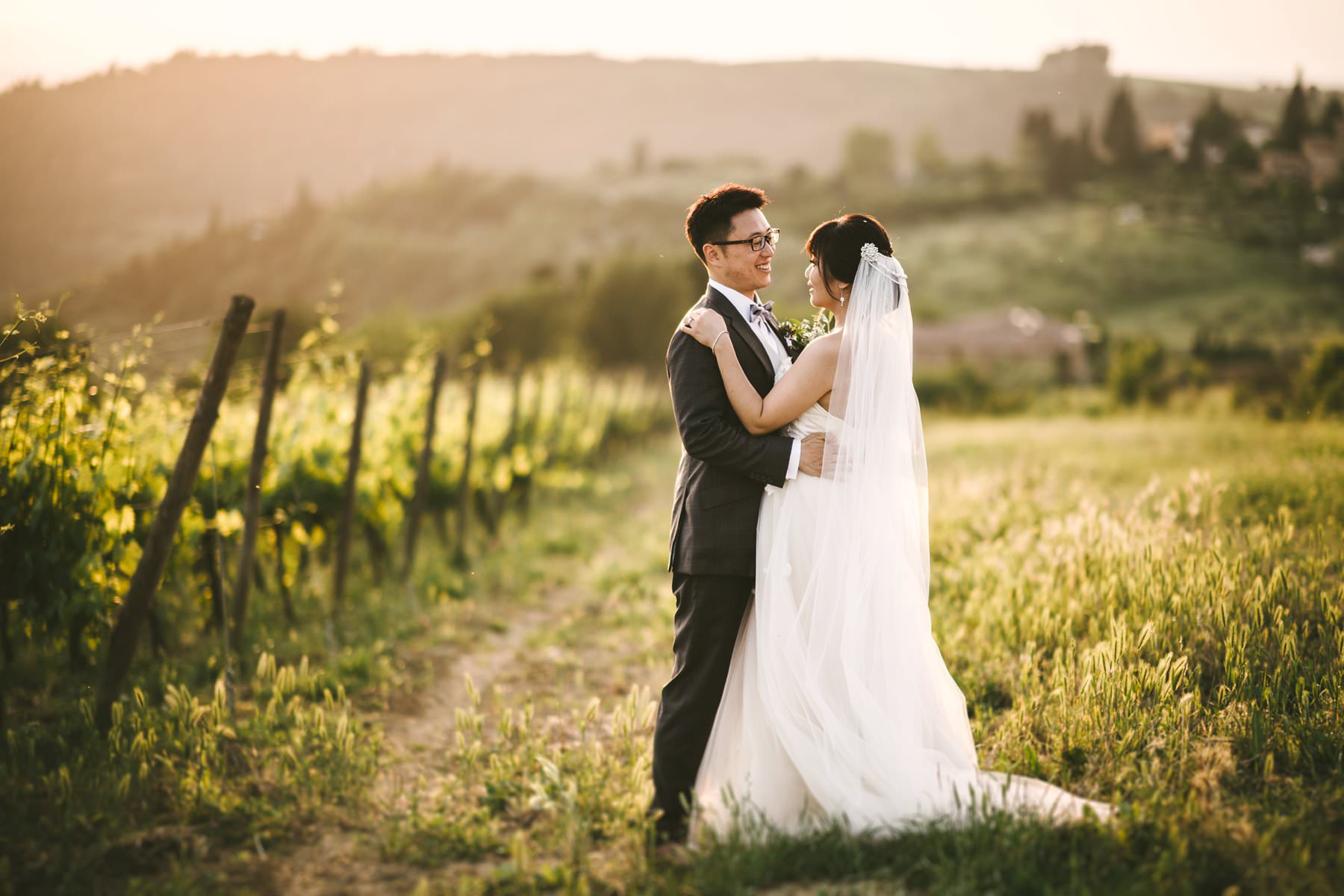 Bride and groom wedding photo in golden hour. Lovely moment into a Tuscan countryside vineyard in Chianti area. Photo by Gabriele Fani wedding photographer in Tuscany.