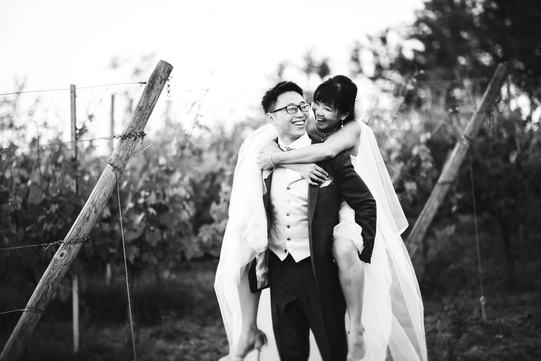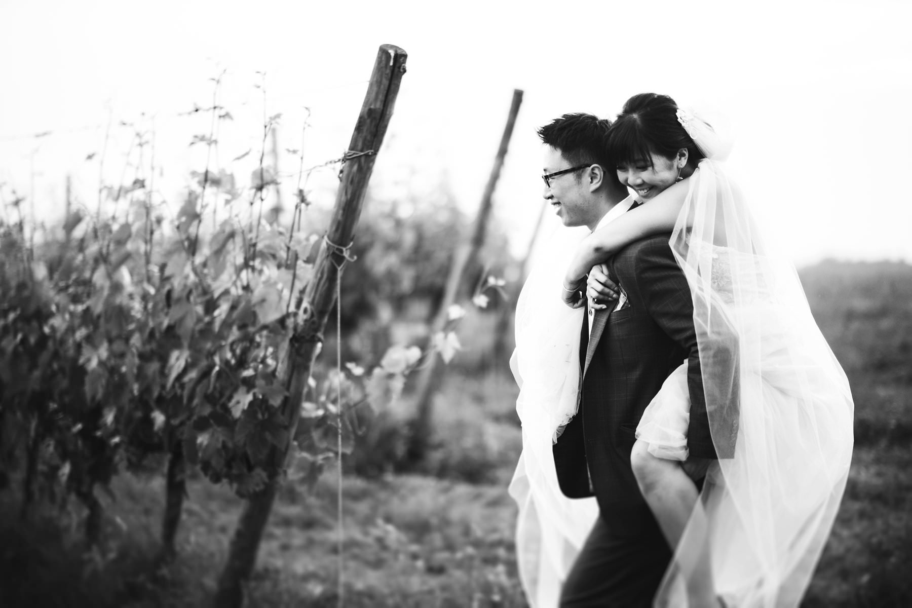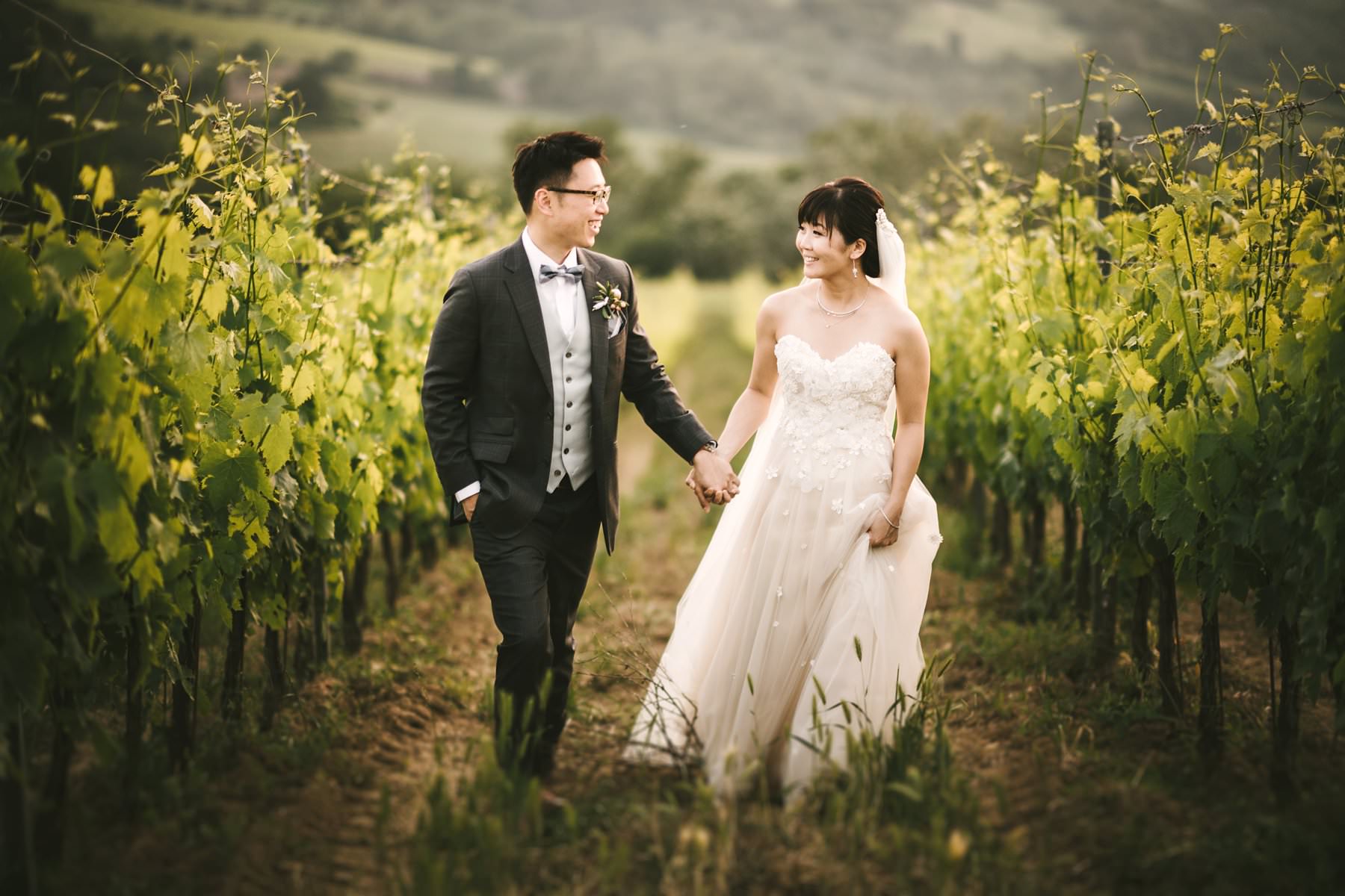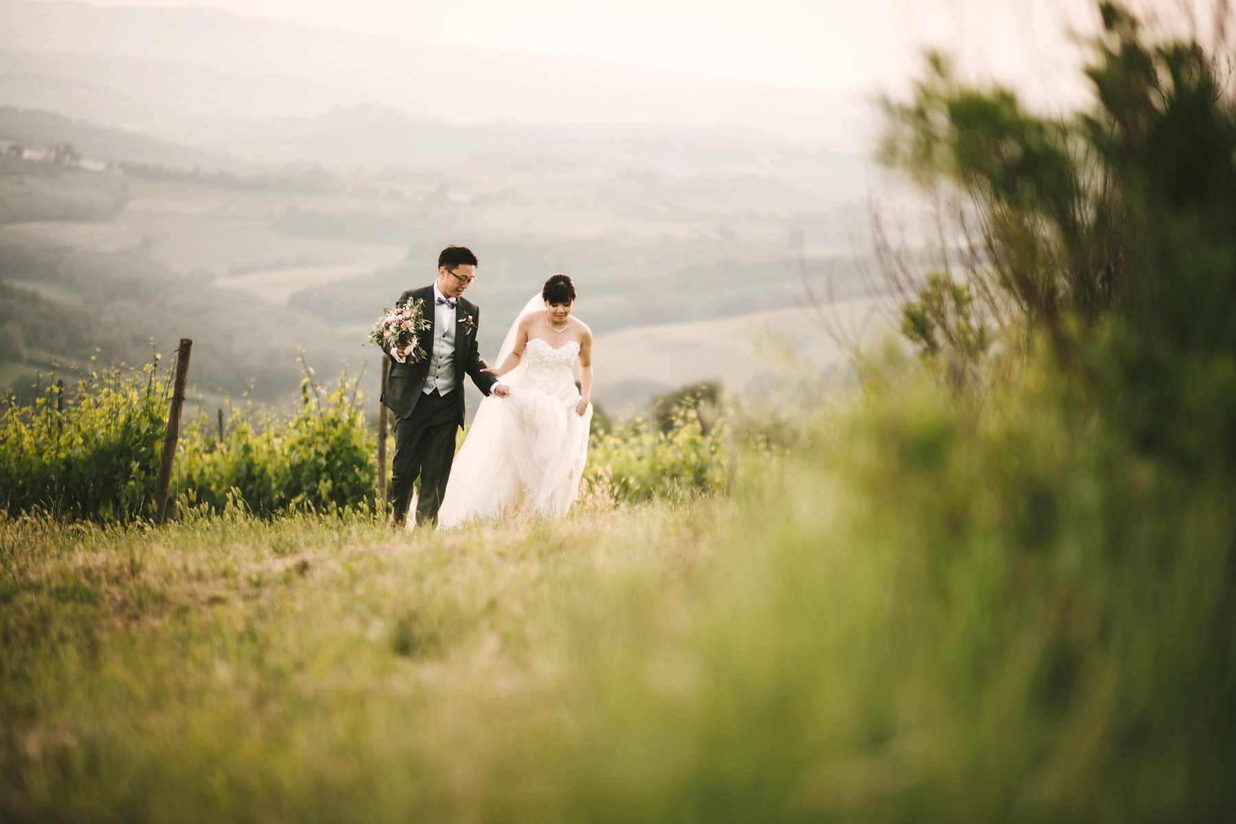 Unique bride groom reportage wedding portrait while they walk in a beautiful Tuscan vineyard in the heart of Chianti near Borgo di Petrognano. Photo by reportage wedding photographer Gabriele Fani