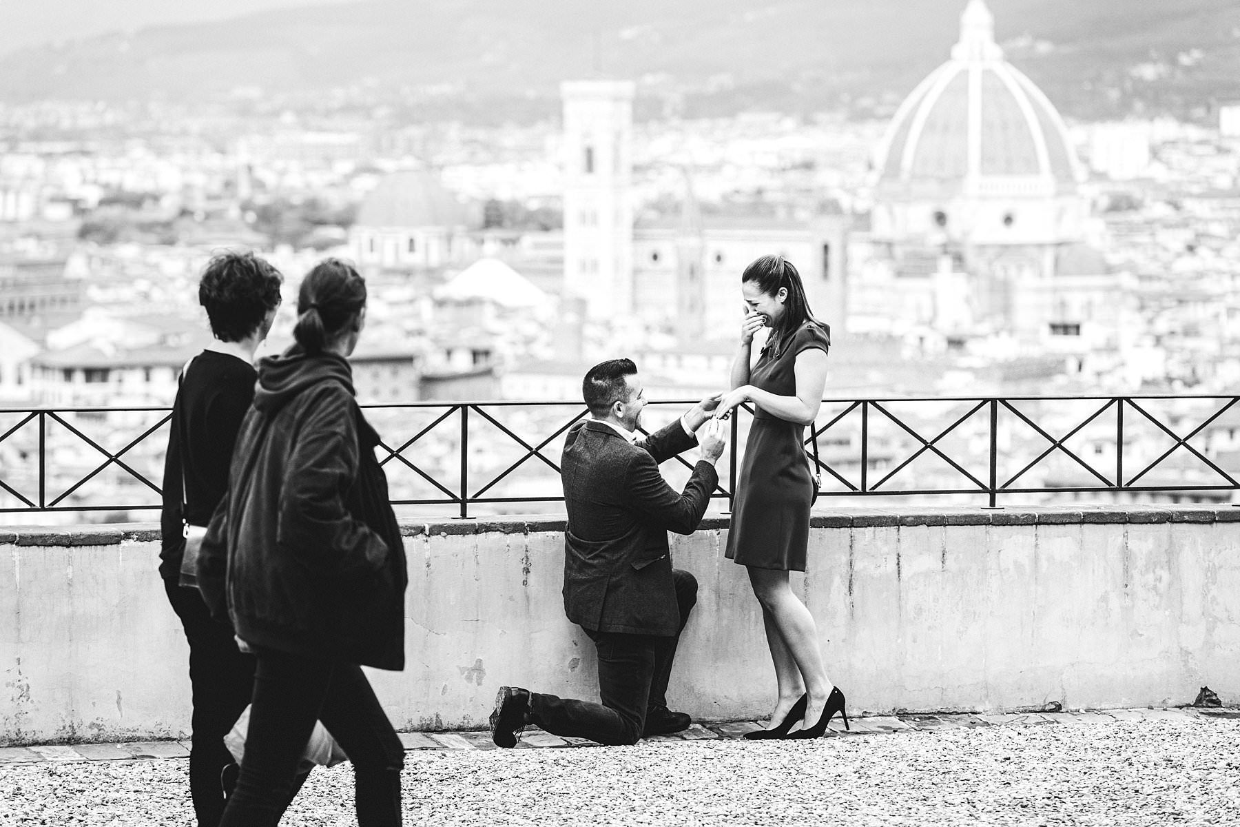 Unforgettable surprise proposal photoshoot at Four Seasons and Florence. Dream engagement photo shoot in Florence near Piazzale Michelangelo the most iconic and panoramic place of the city. Photo by the elegant creative and modern engagement photographer in Tuscany based Florence Gabriele Fani