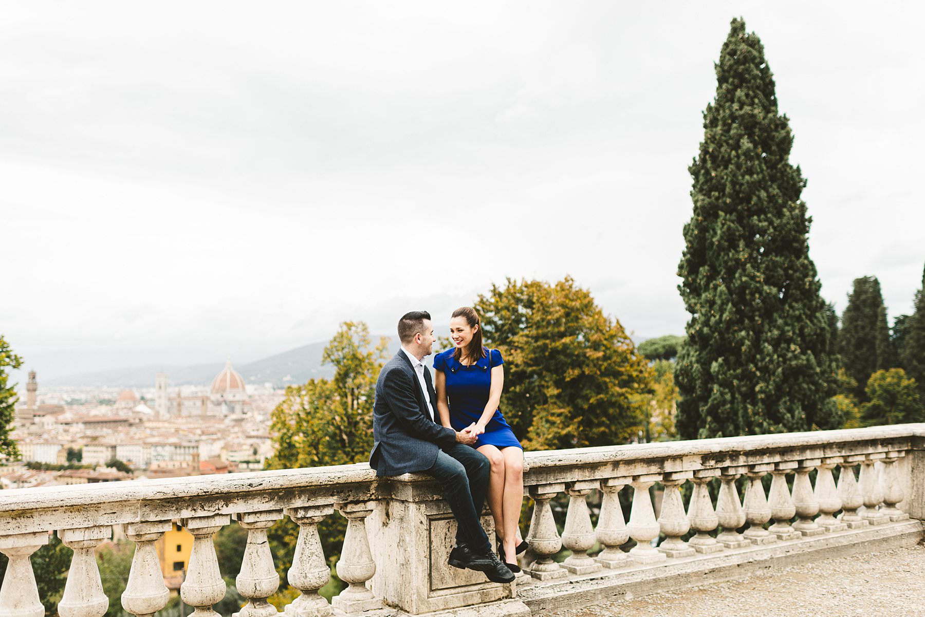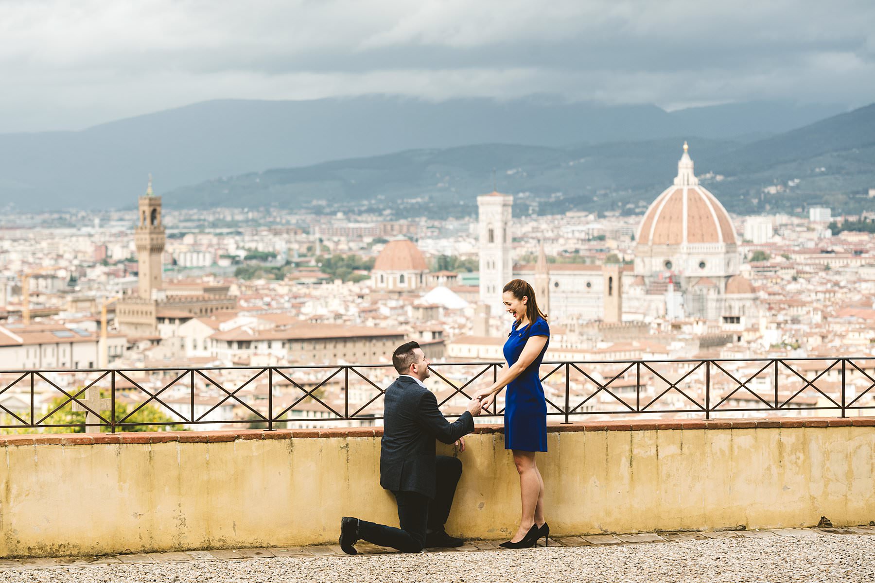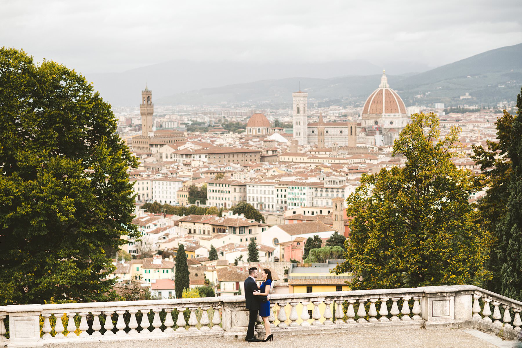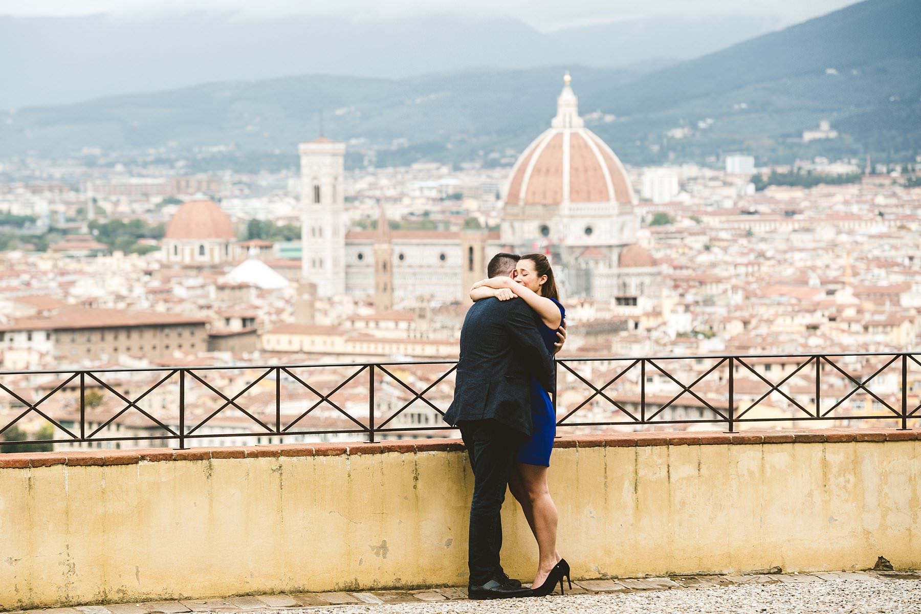 Unforgettable surprise proposal photoshoot at Four Seasons in Florence. Elegant and lovely couple portrait photo Sith Renaissance architecture at one of the most iconic spot of Florence near San Miniato al Monte area and Piazzale Michelangelo. Photo by the elegant creative and modern engagement photographer in Tuscany based Florence Gabriele Fani