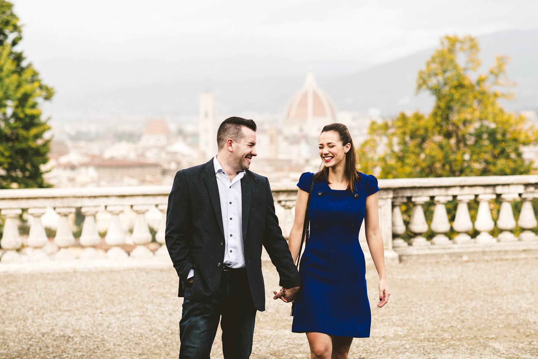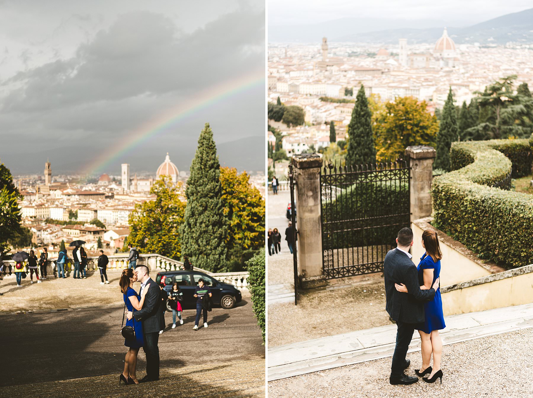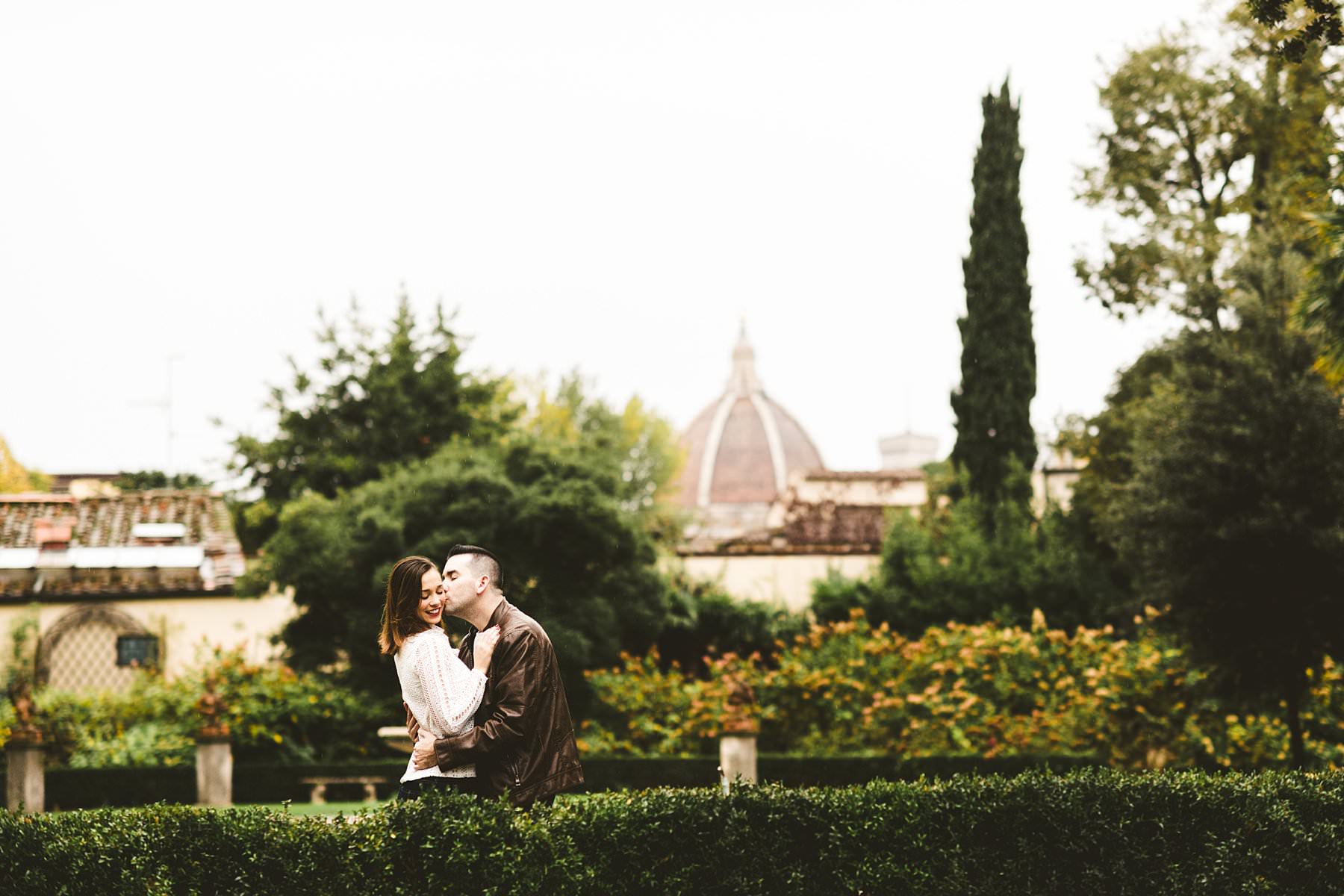 Cara and Vincent’s exciting and lovely surprise proposal and photoshoot under light rain at San Miniato al Monte near Piazzale Michelangelo in Florence. Photo by the elegant creative and modern engagement photographer in Tuscany based Florence Gabriele Fani