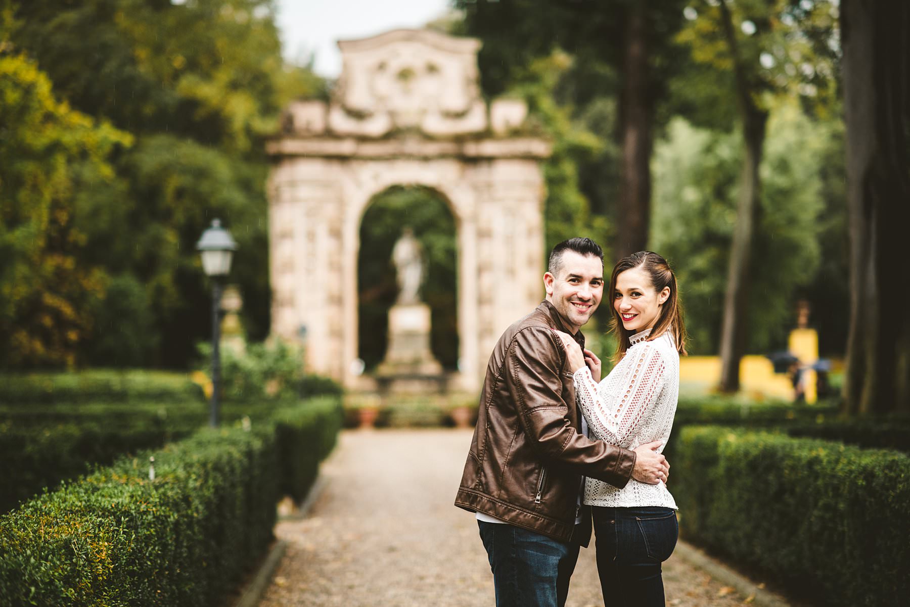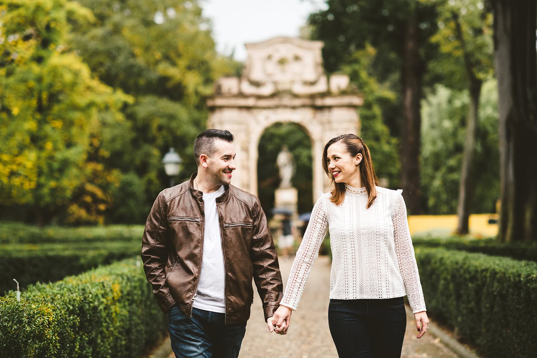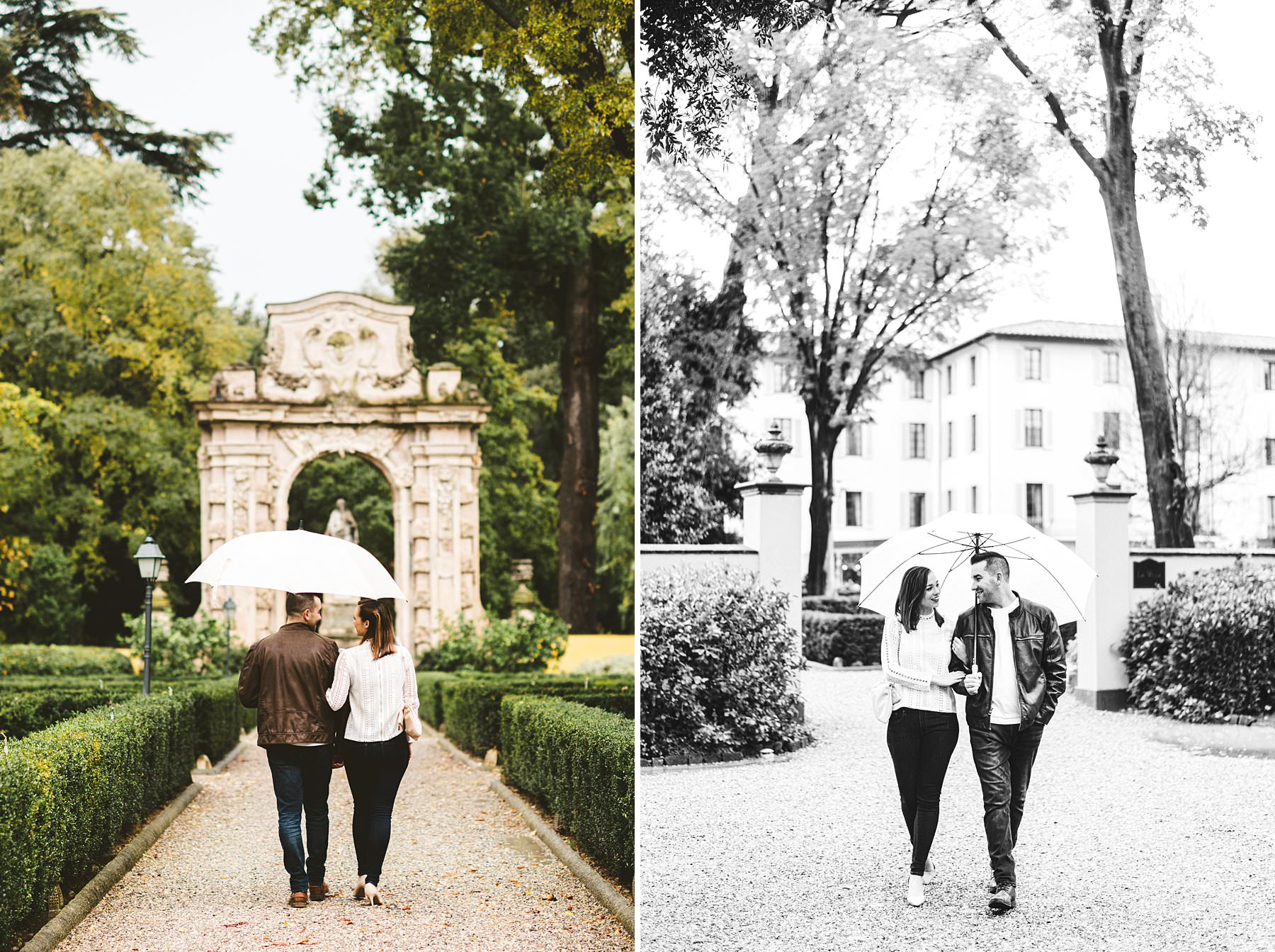 Unforgettable surprise proposal photoshoot at Four Seasons in Florence. Lovely and romantic walk photo tour under the rain in the Gherardesca garden park at Hotel Four Seasons Florence, the most luxury hotel in the city. Photo by the elegant creative and modern engagement photographer in Tuscany based Florence Gabriele Fani