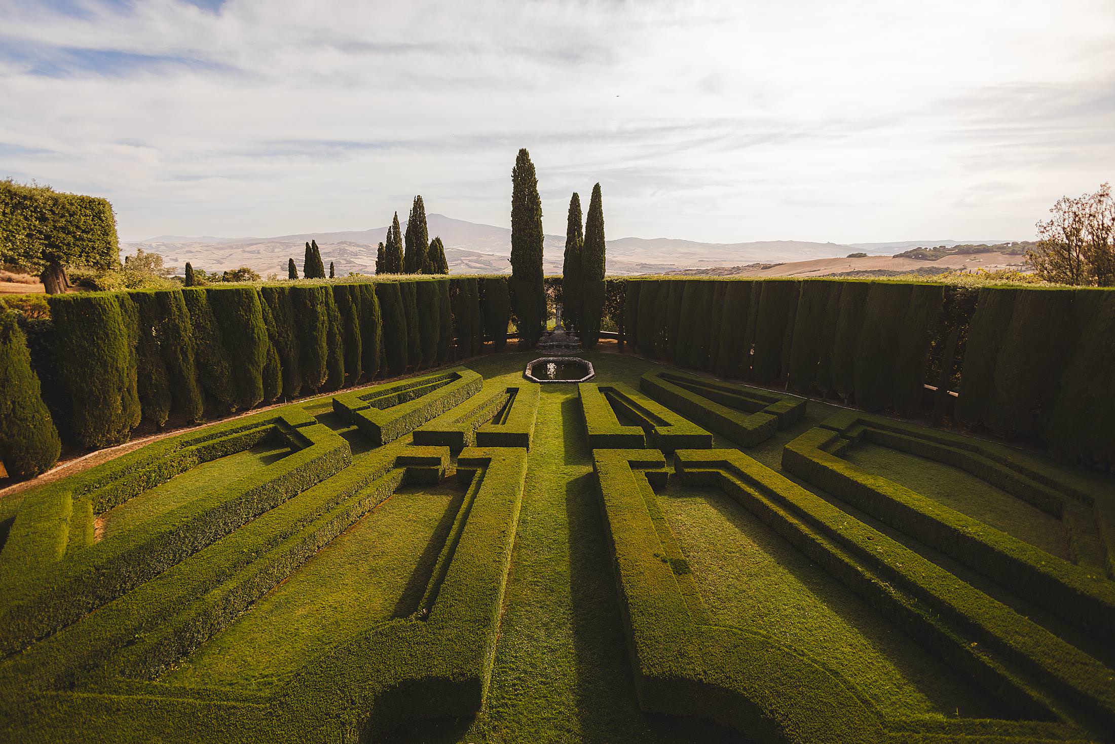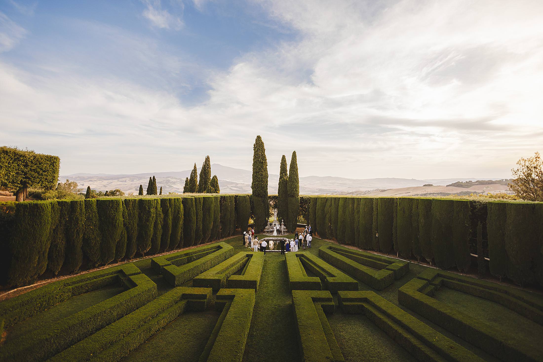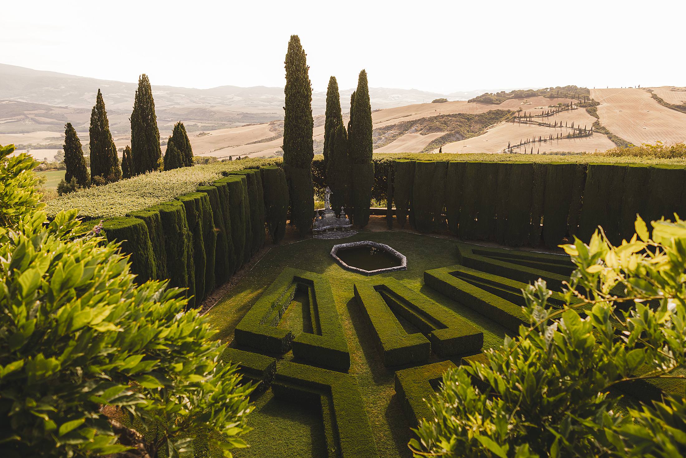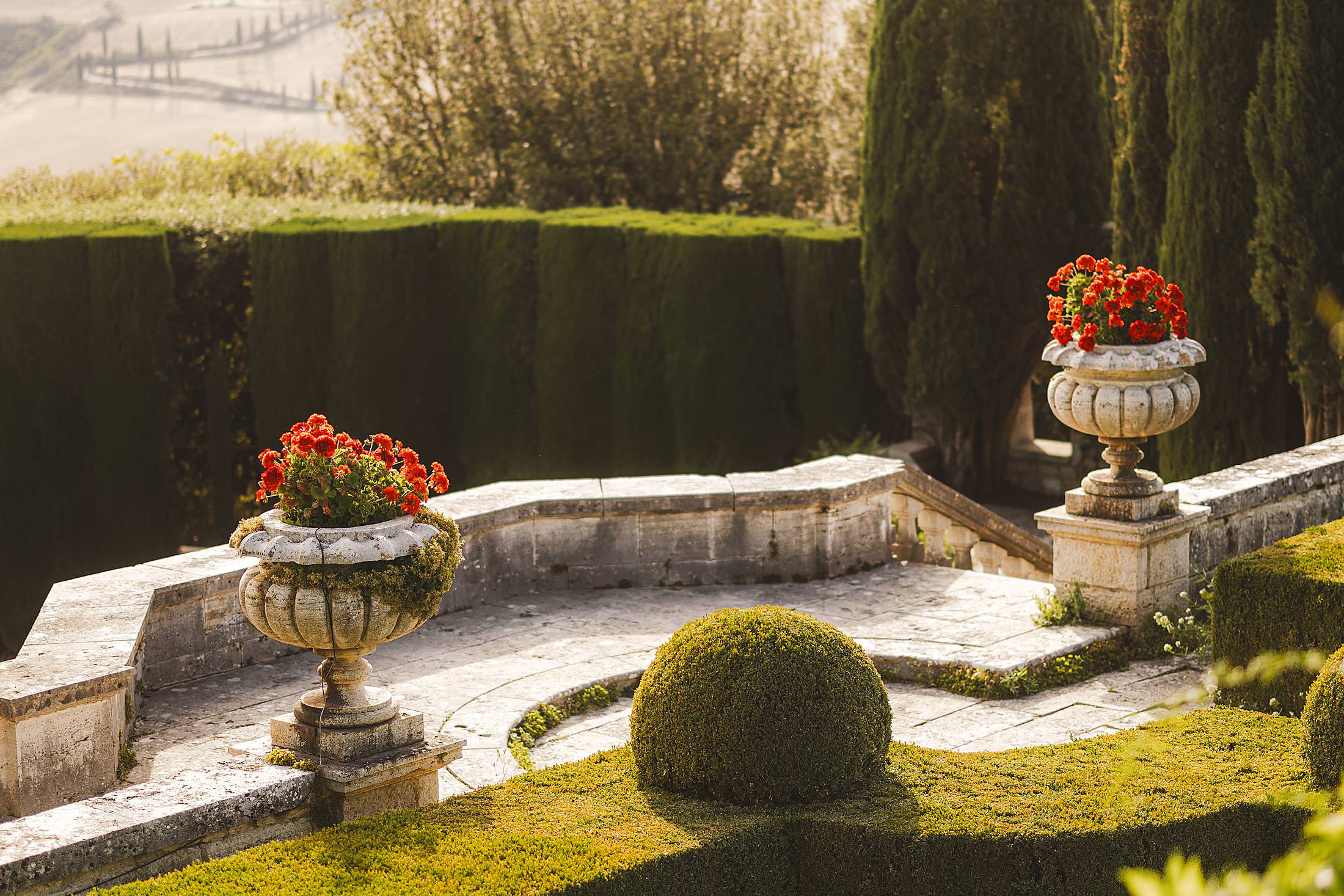 Italian style garden at La Foce breathtaking wedding venue, one of the most beautiful in the Val d’Orcia. Photo by the Italian elegant wedding photographer in Tuscany based Florence Gabriele Fani