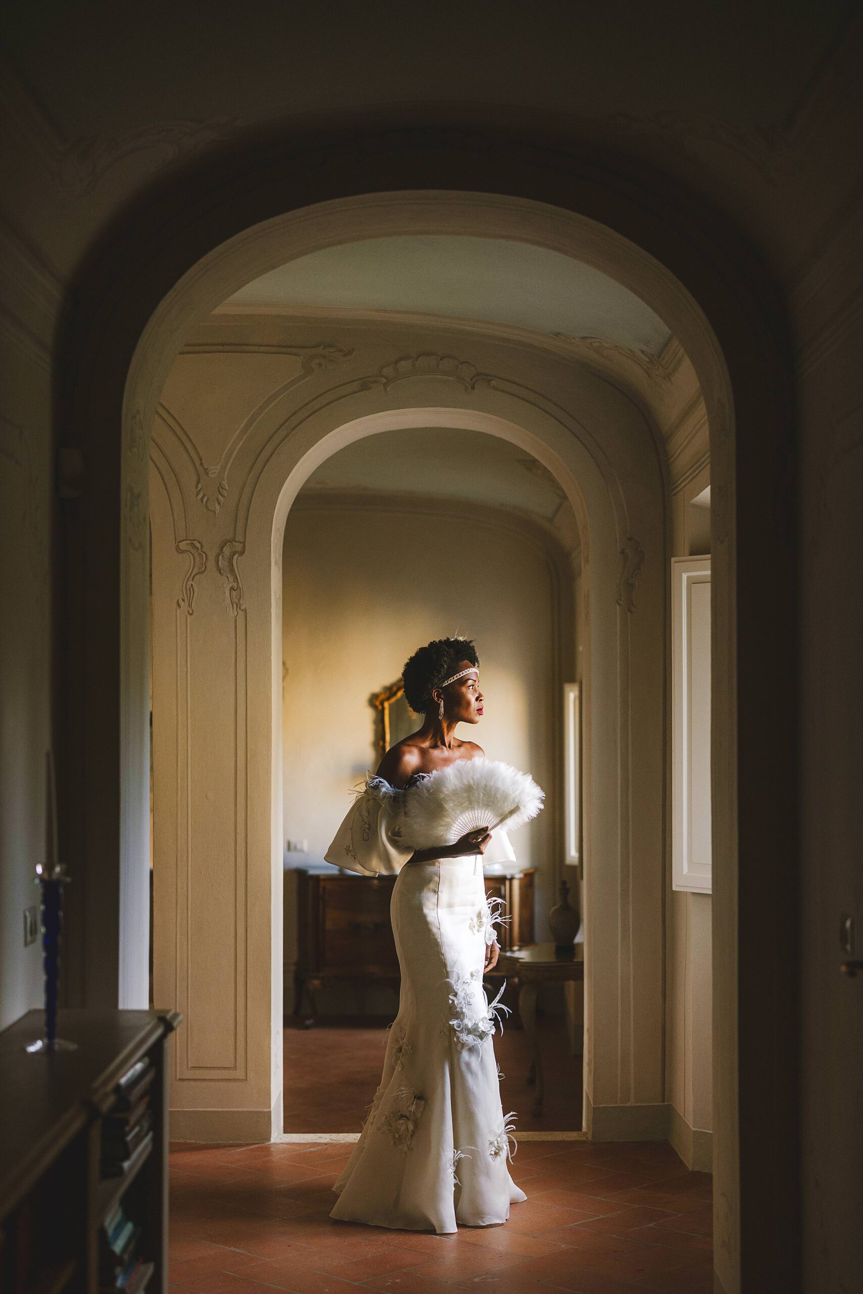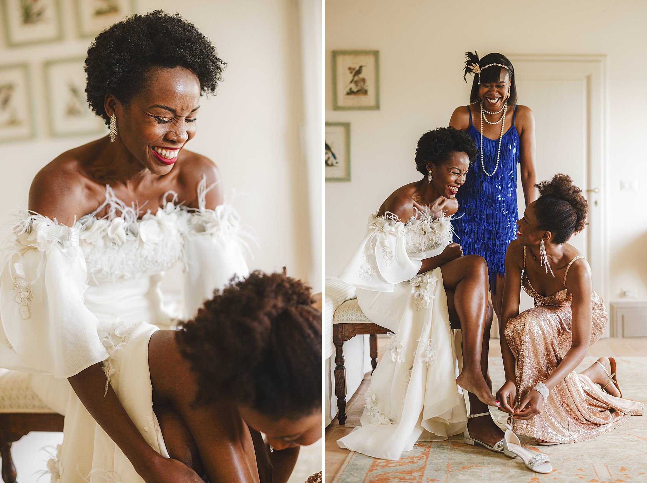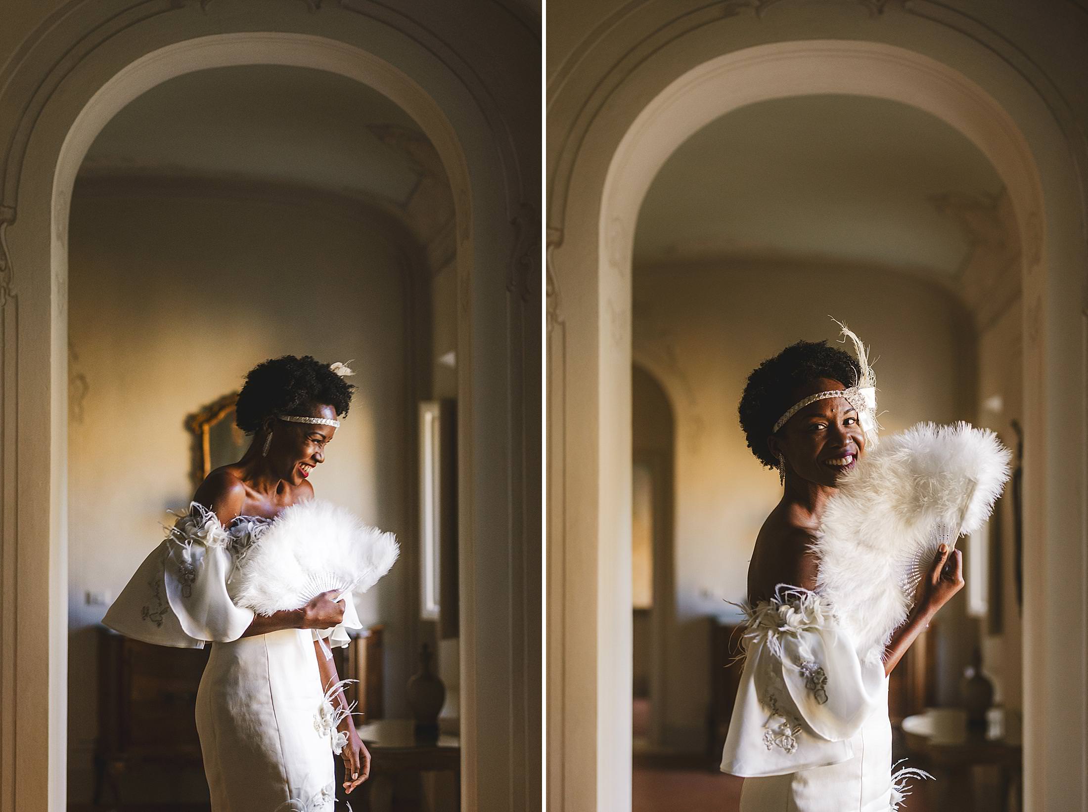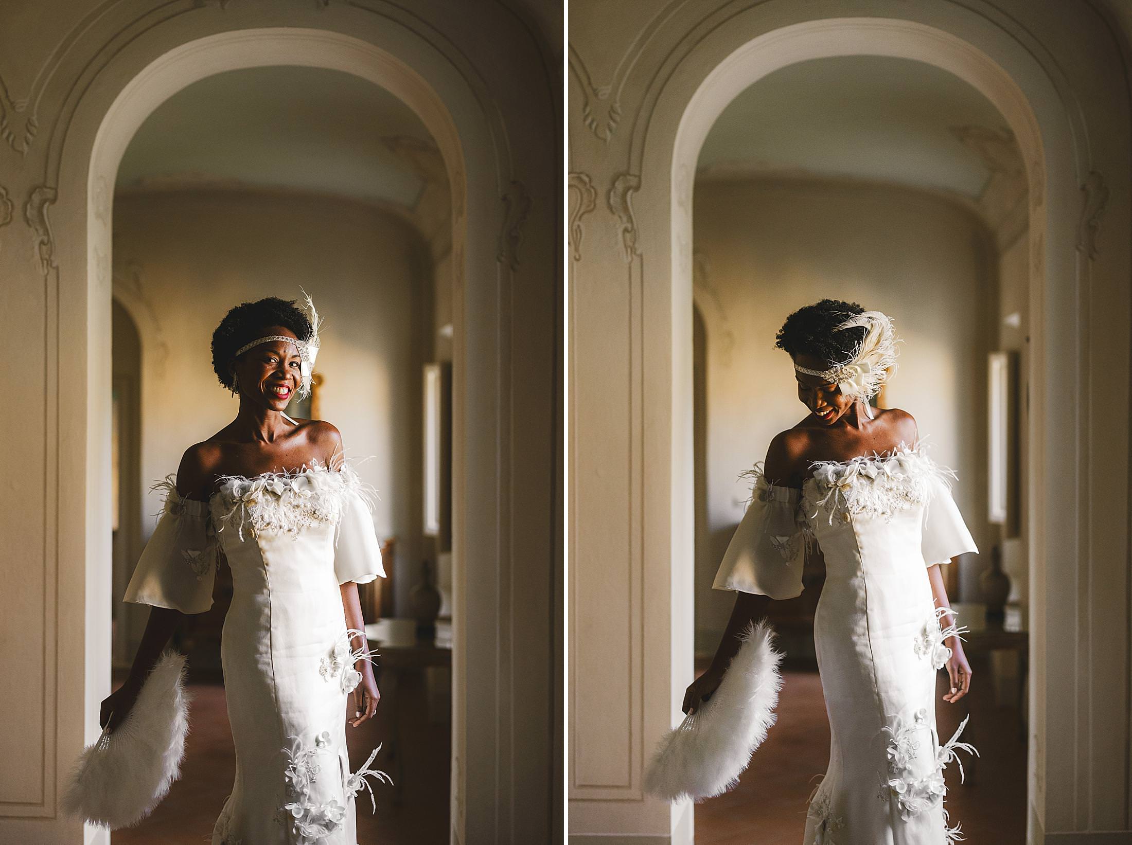 Lovely and elegant bride get ready at La Foce breathtaking venue for glamour 1920s 1930s 10th wedding anniversary event. Photo by the Italian elegant wedding photographer in Tuscany based Florence Gabriele Fani