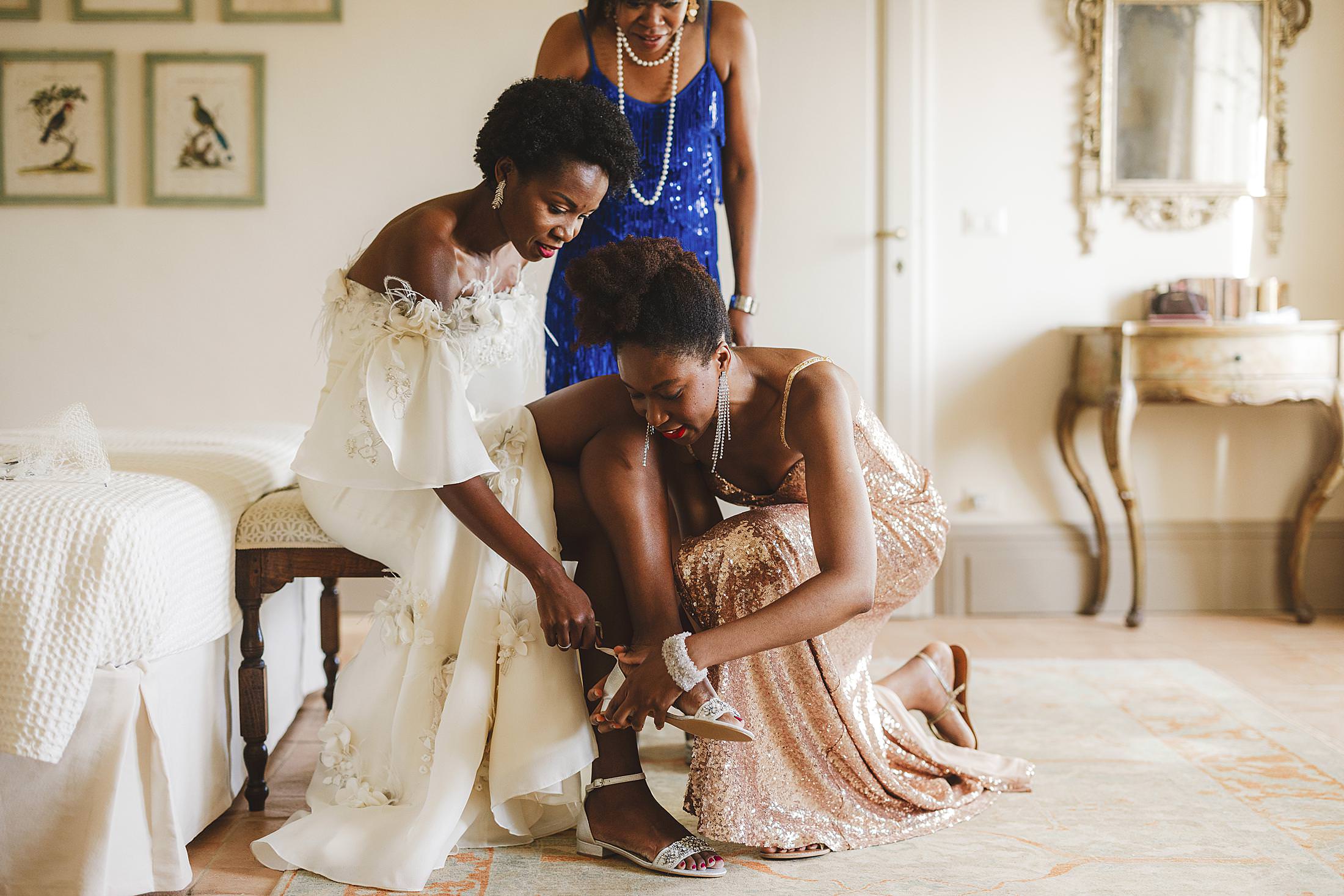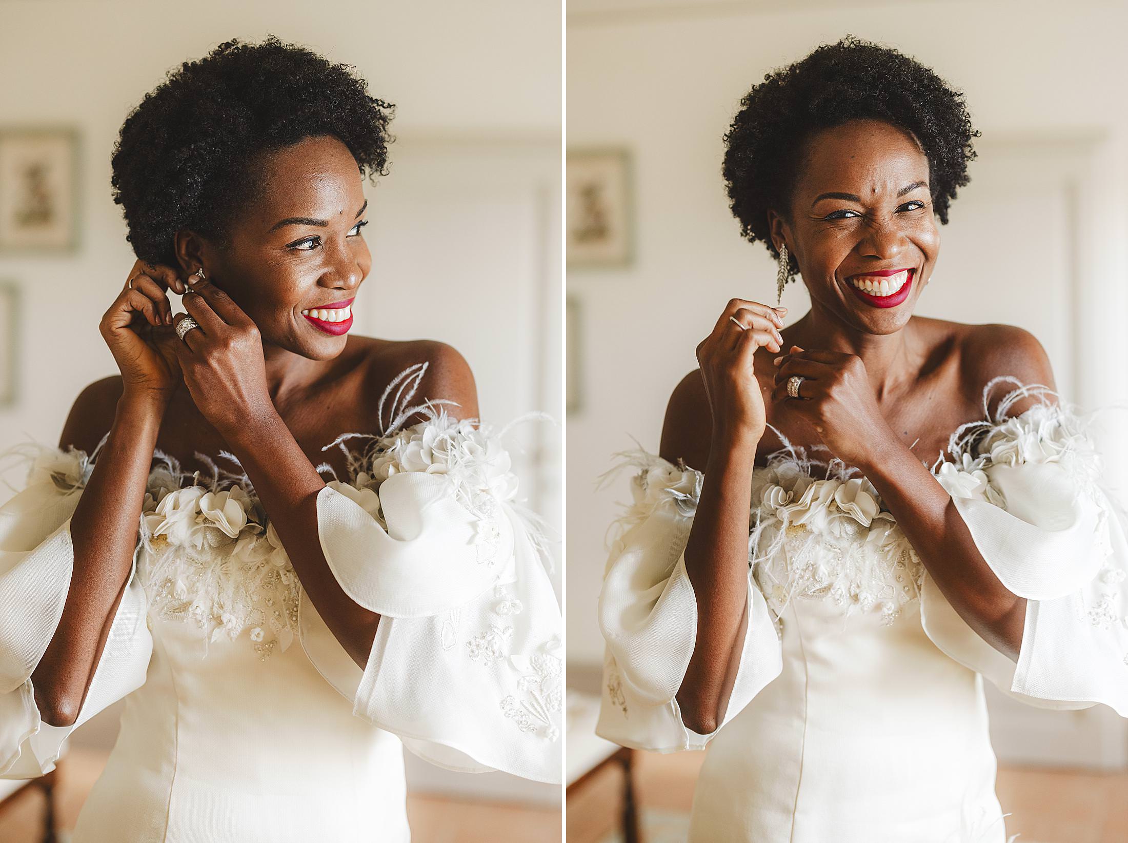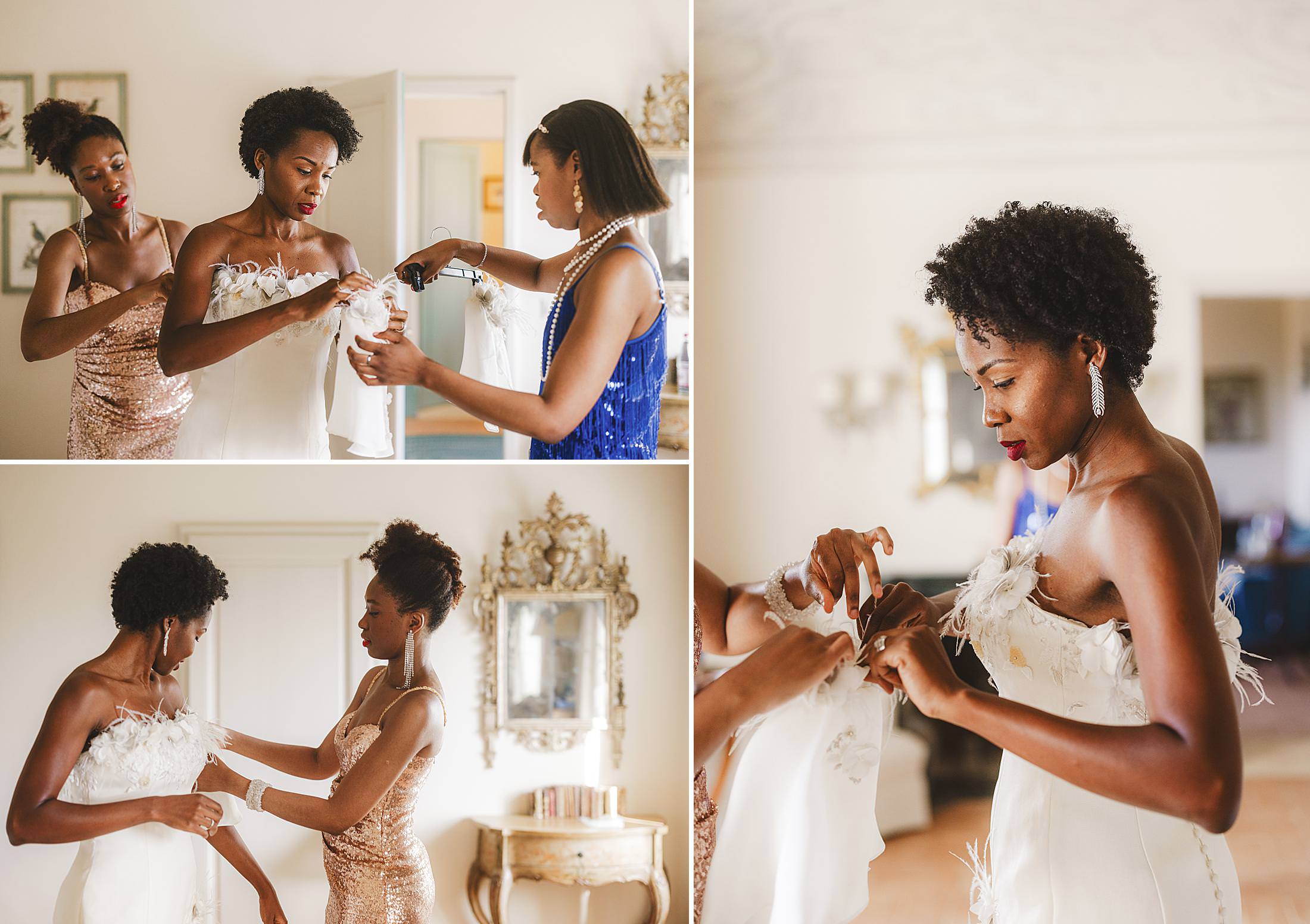 Lovely and elegant bride get ready at La Foce breathtaking venue for glamour 1920s 1930s 10th wedding anniversary event. Photo by the Italian elegant wedding photographer in Tuscany based Florence Gabriele Fani