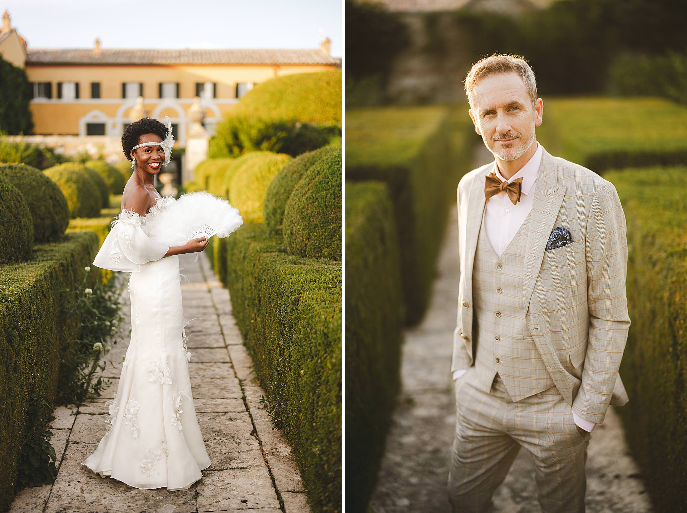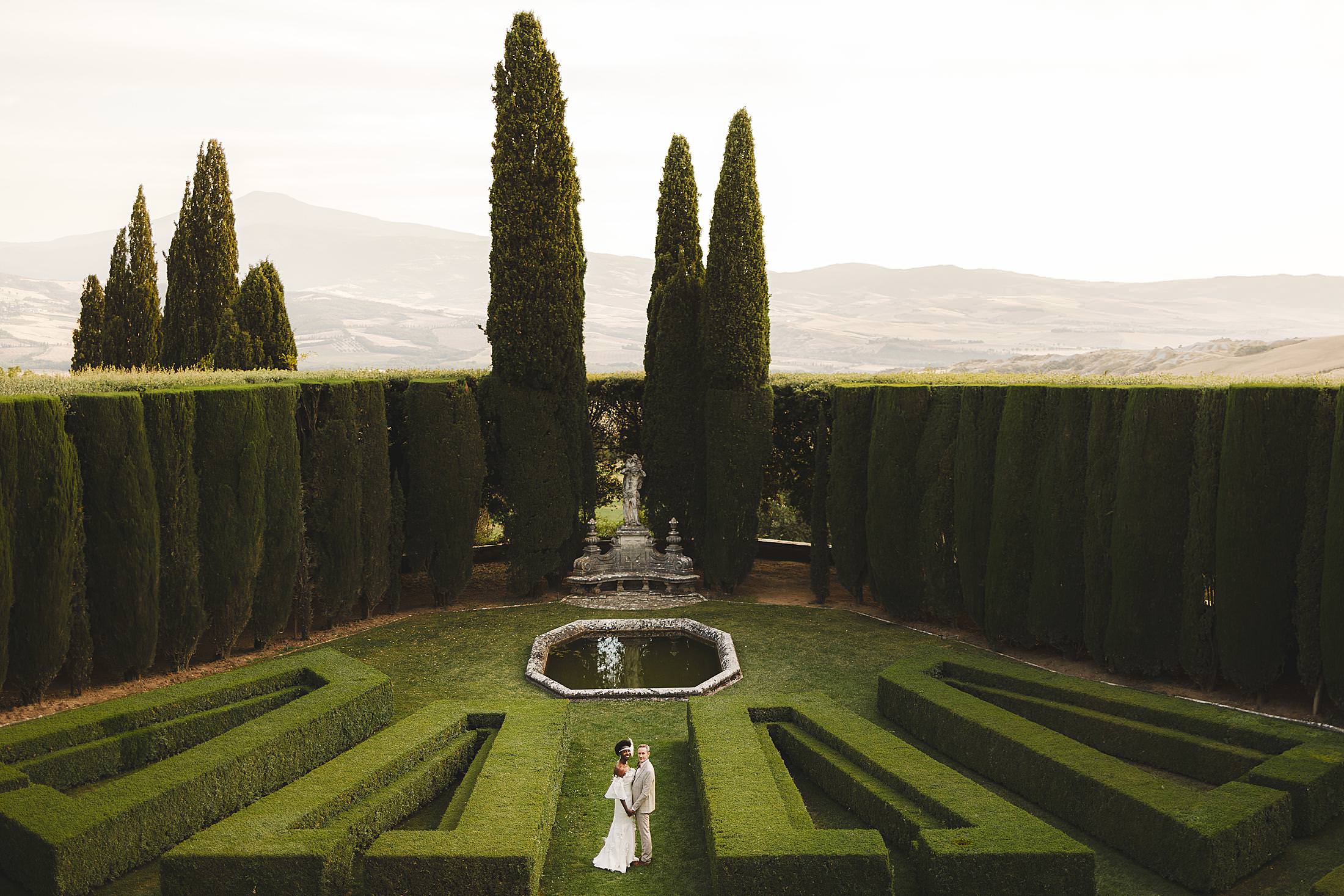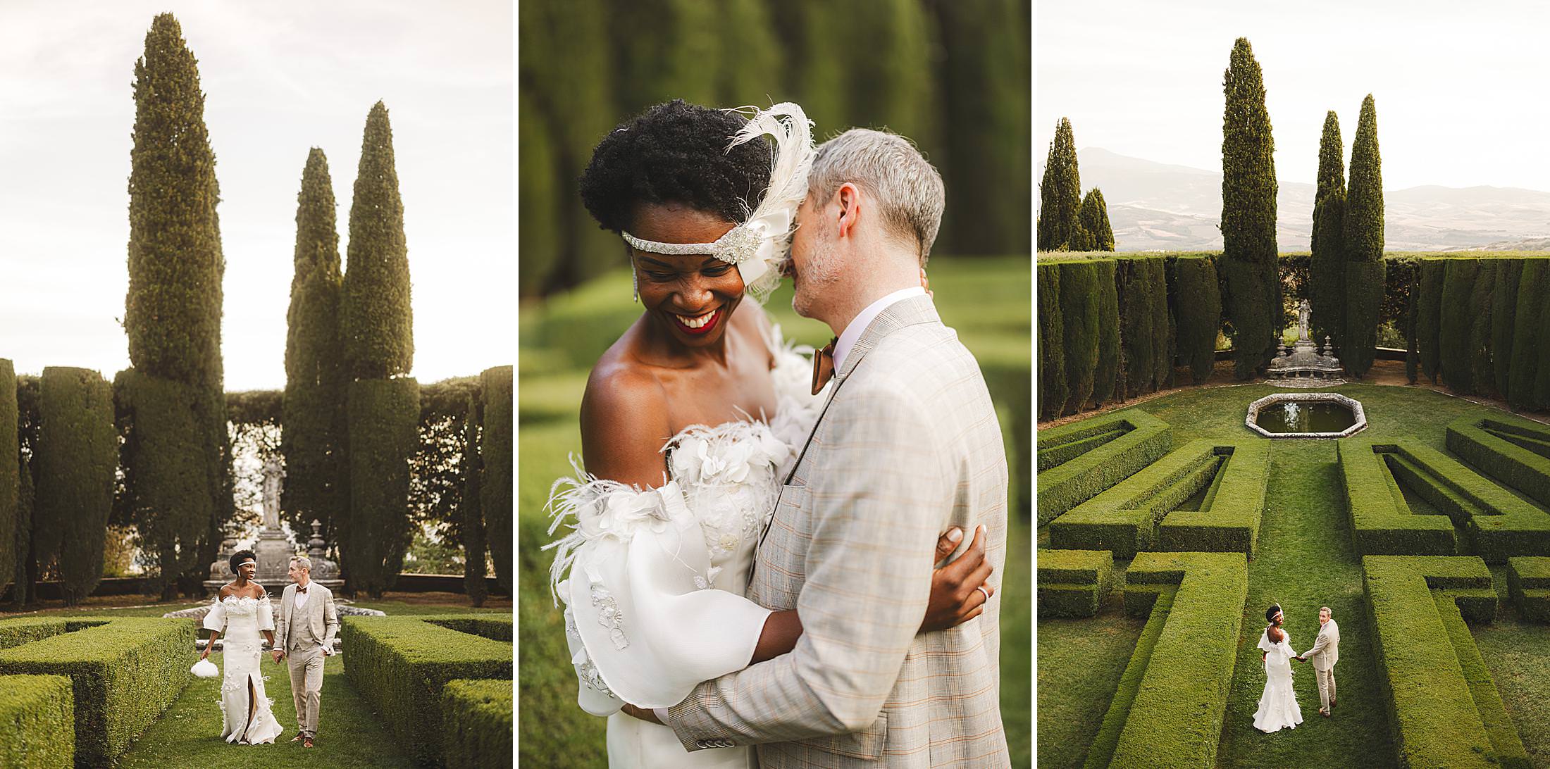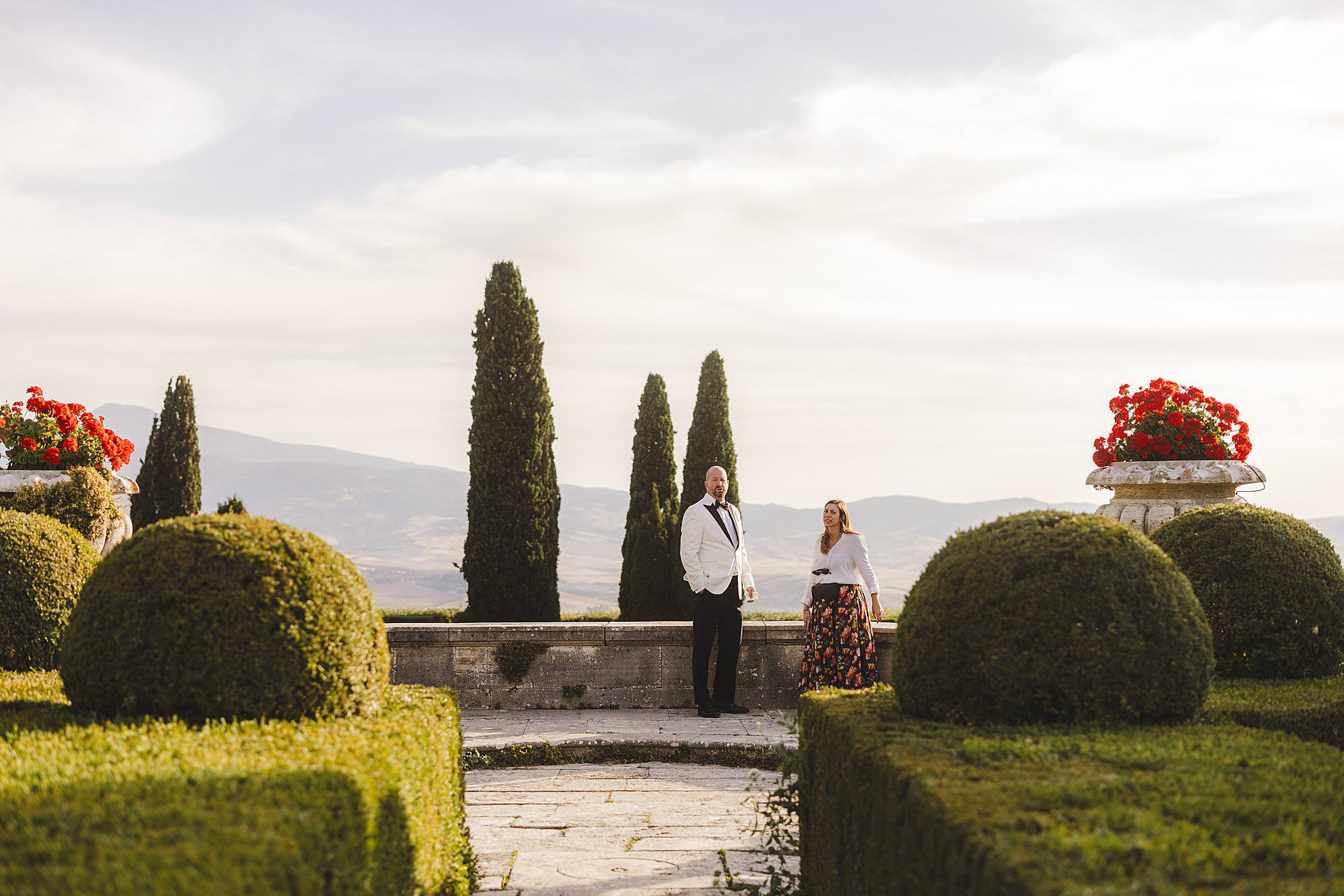 Creative and elegant couple photo shoot at La Foce in the heart of Val d’Orcia. Photo by the Italian elegant wedding photographer in Tuscany based Florence Gabriele Fani