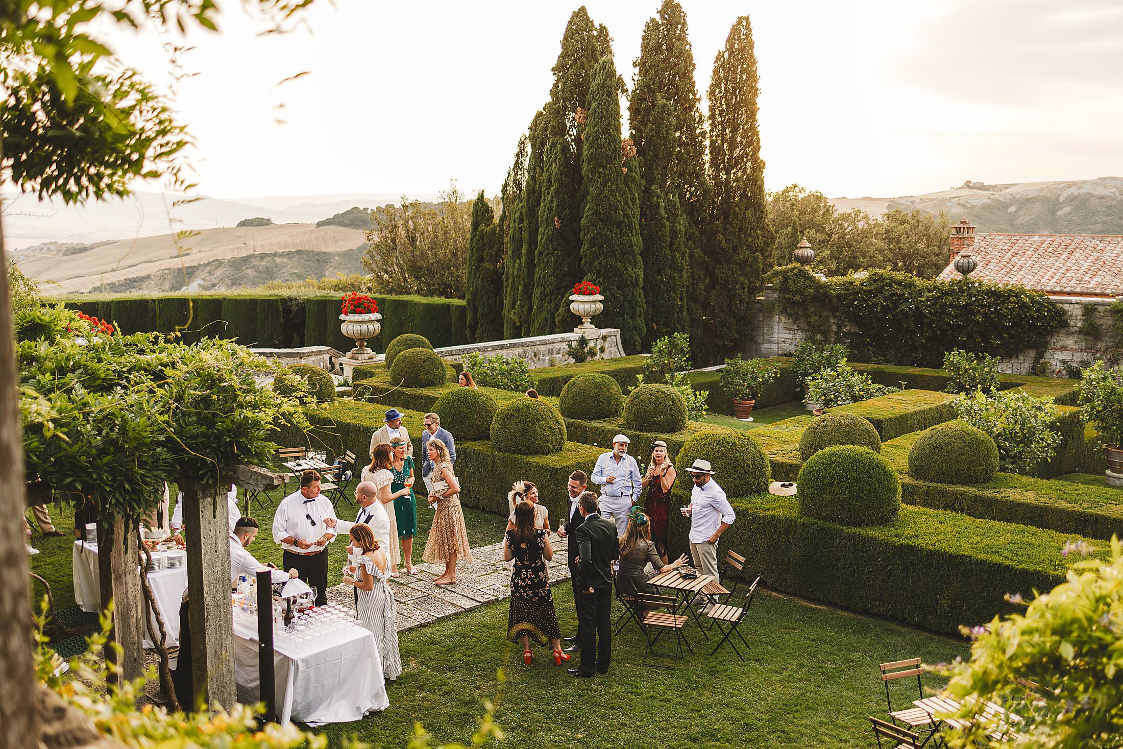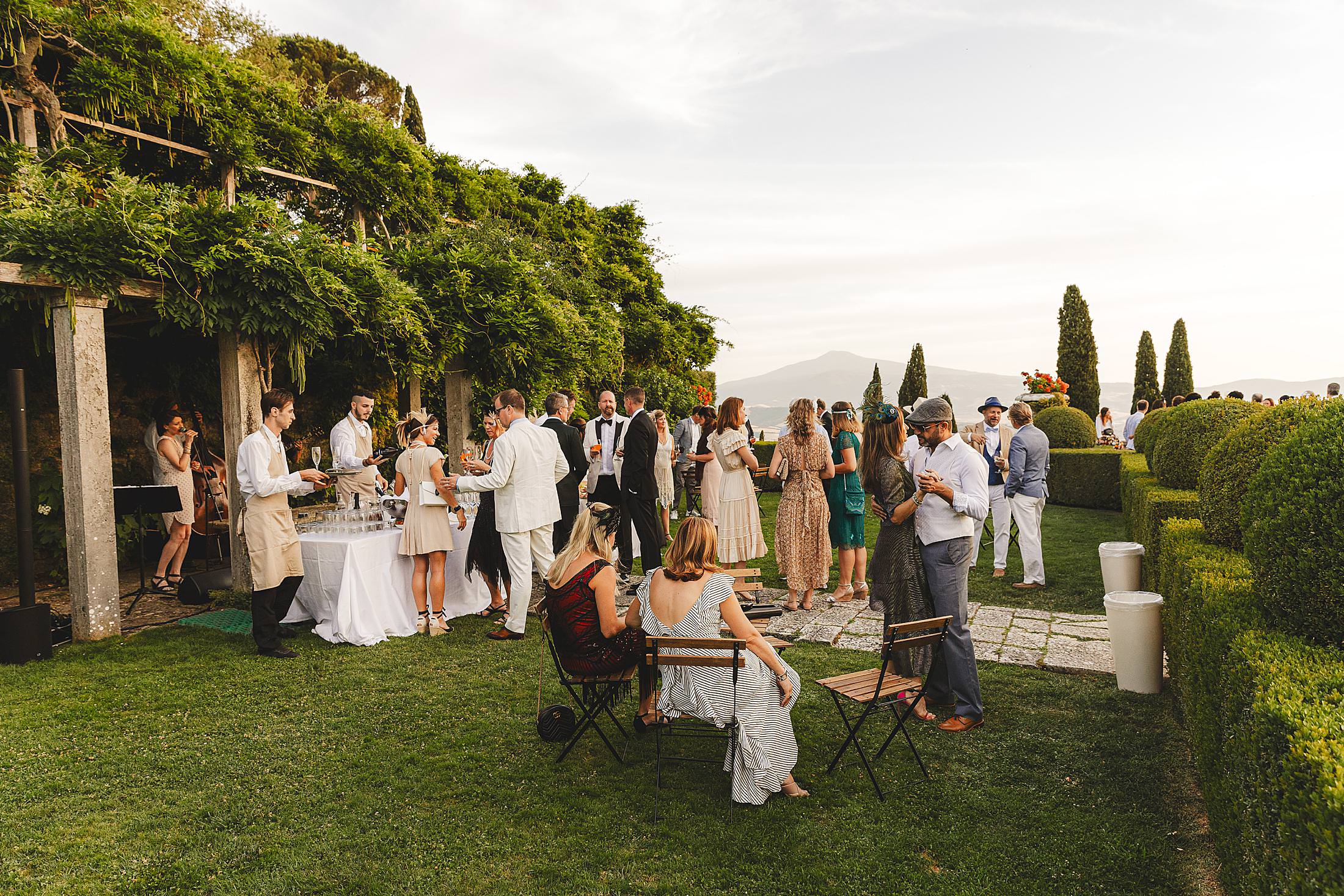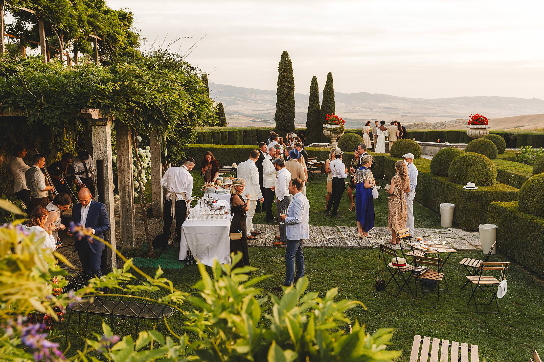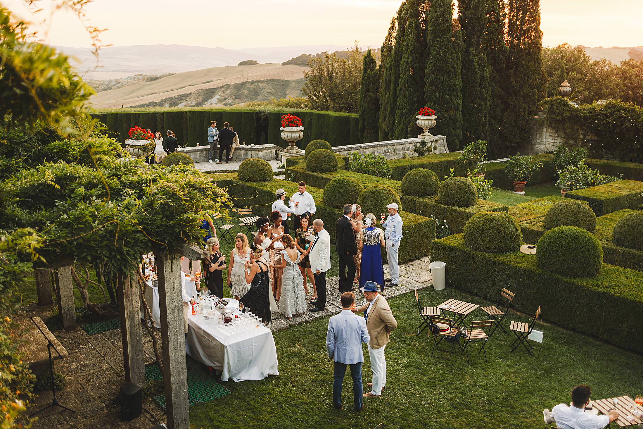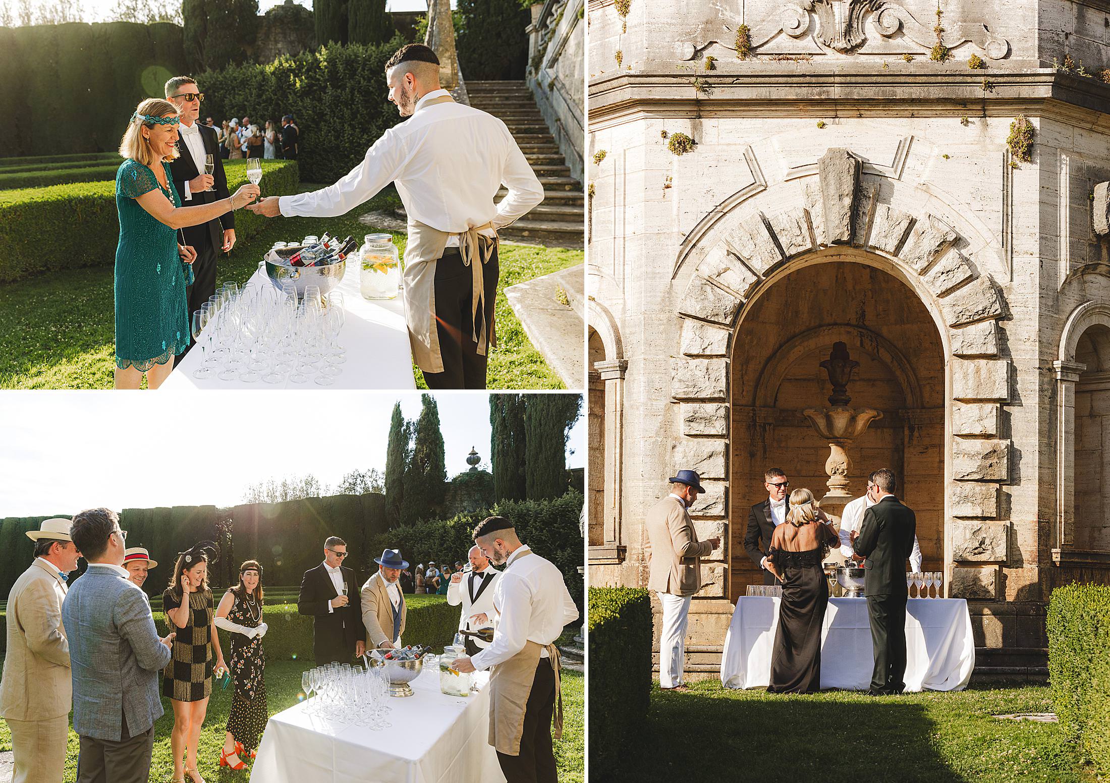 Wedding anniversary welcome cocktail in the gardens of La Foce. Photo by the Italian elegant wedding photographer in Tuscany based Florence Gabriele Fani