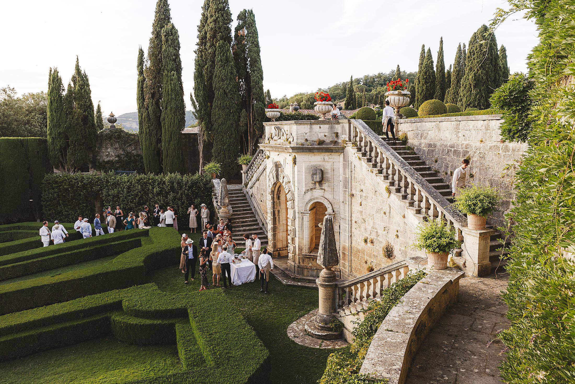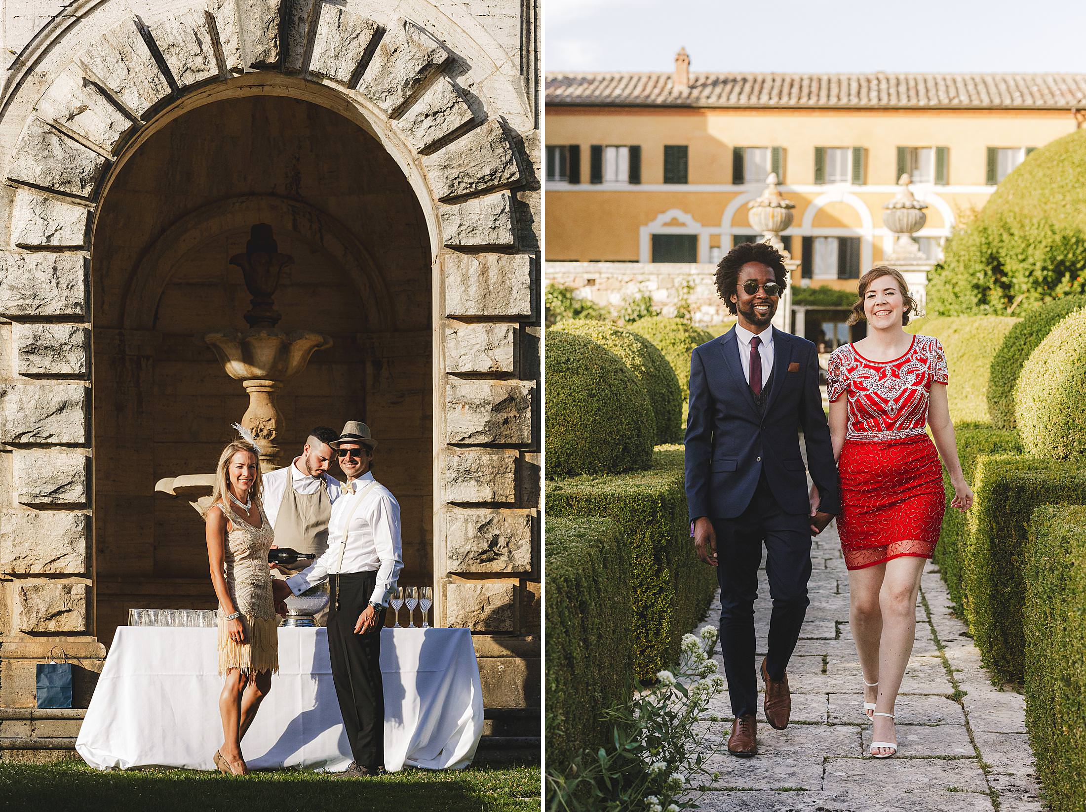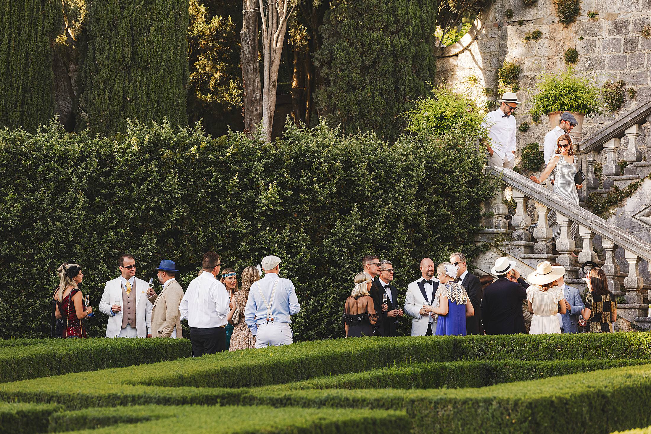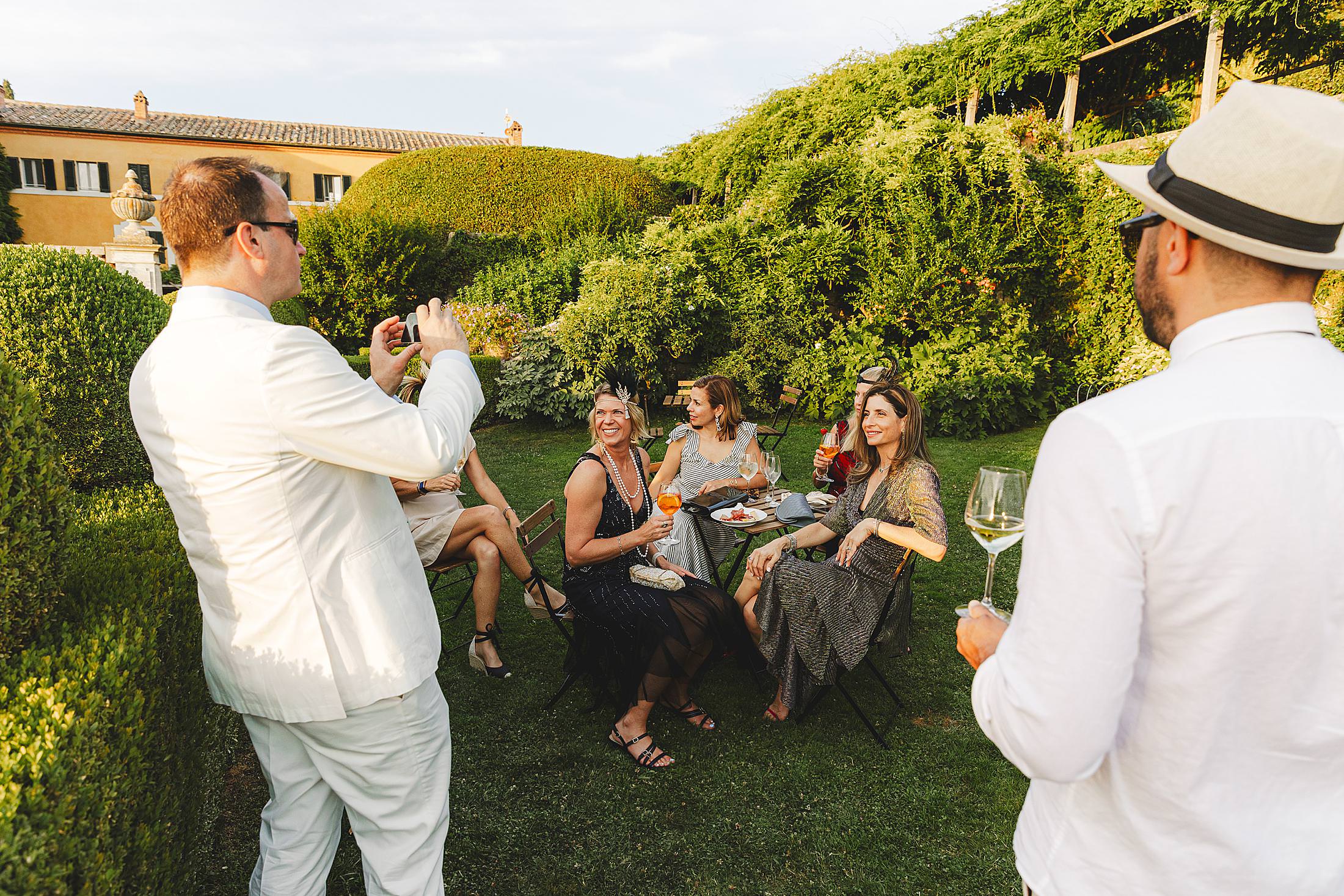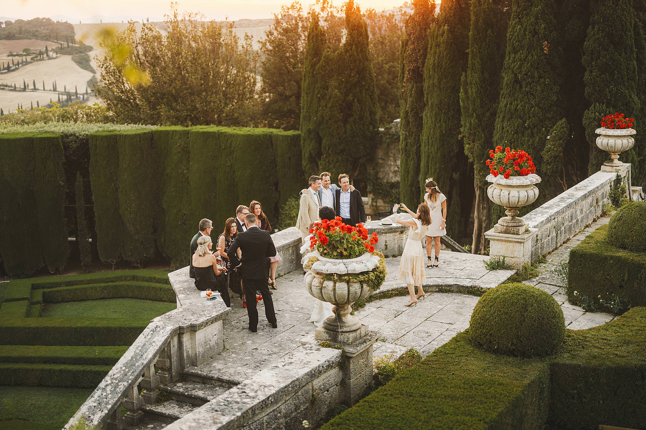Wedding anniversary welcome cocktail in the gardens of La Foce. Photo by the Italian elegant wedding photographer in Tuscany based Florence Gabriele Fani