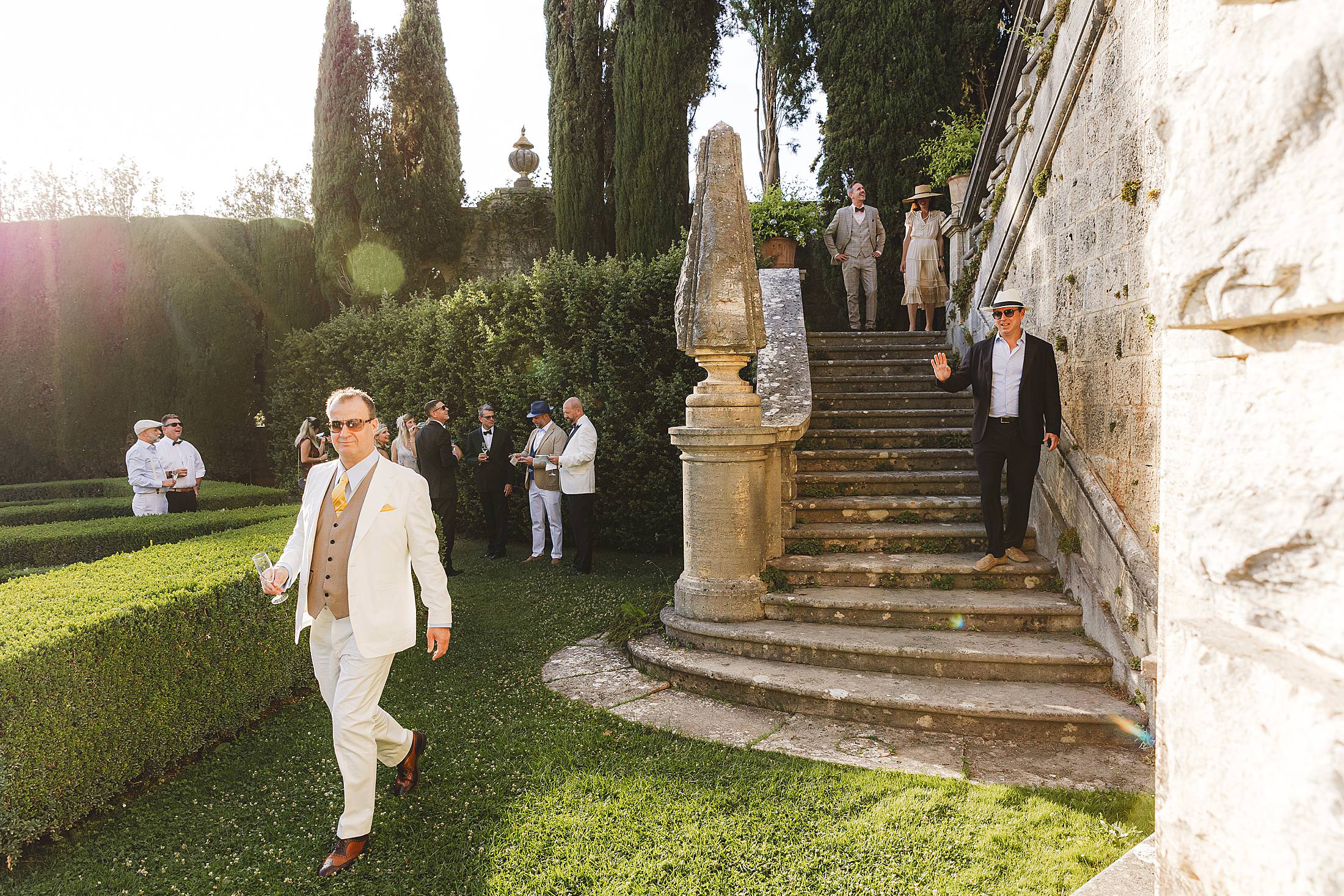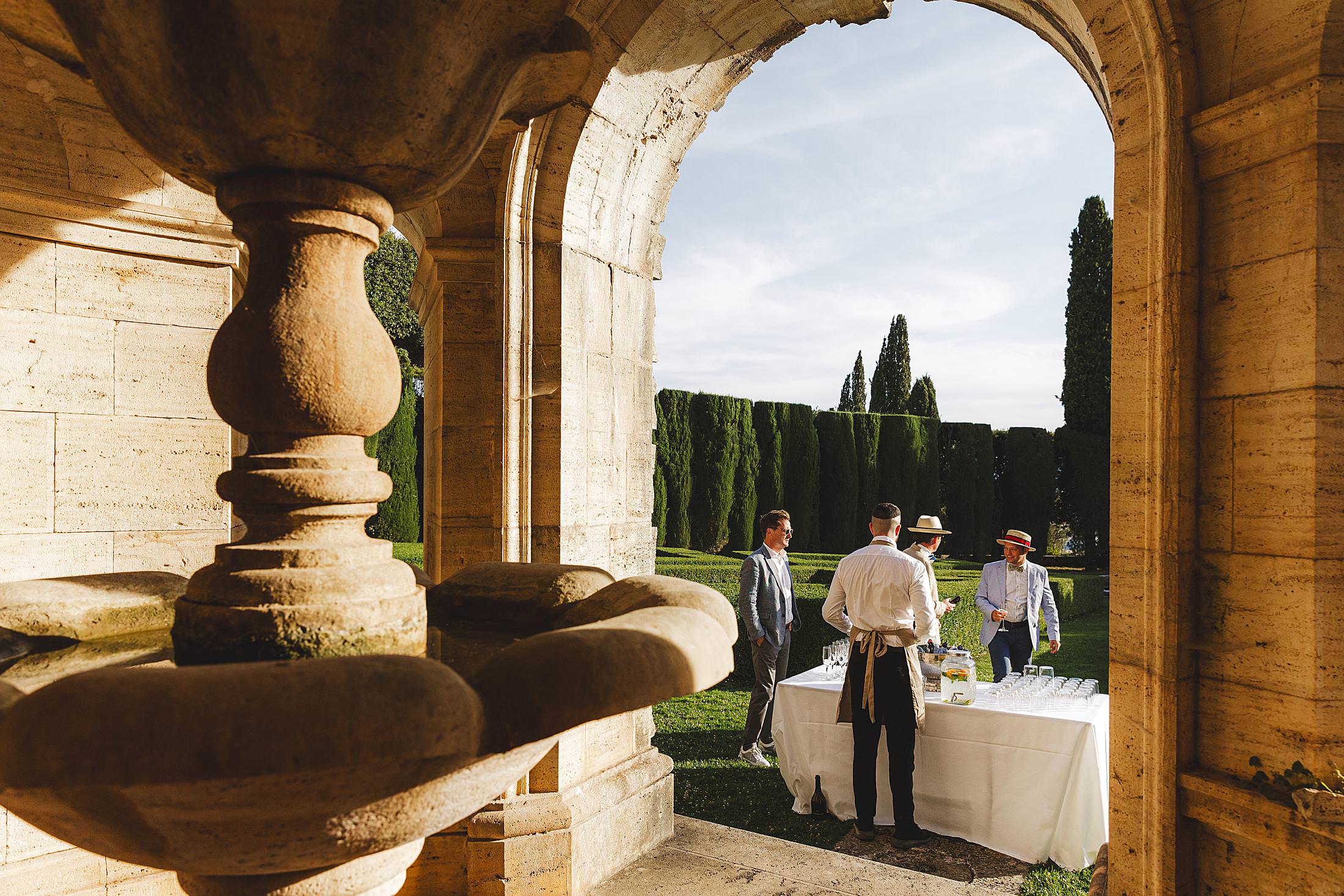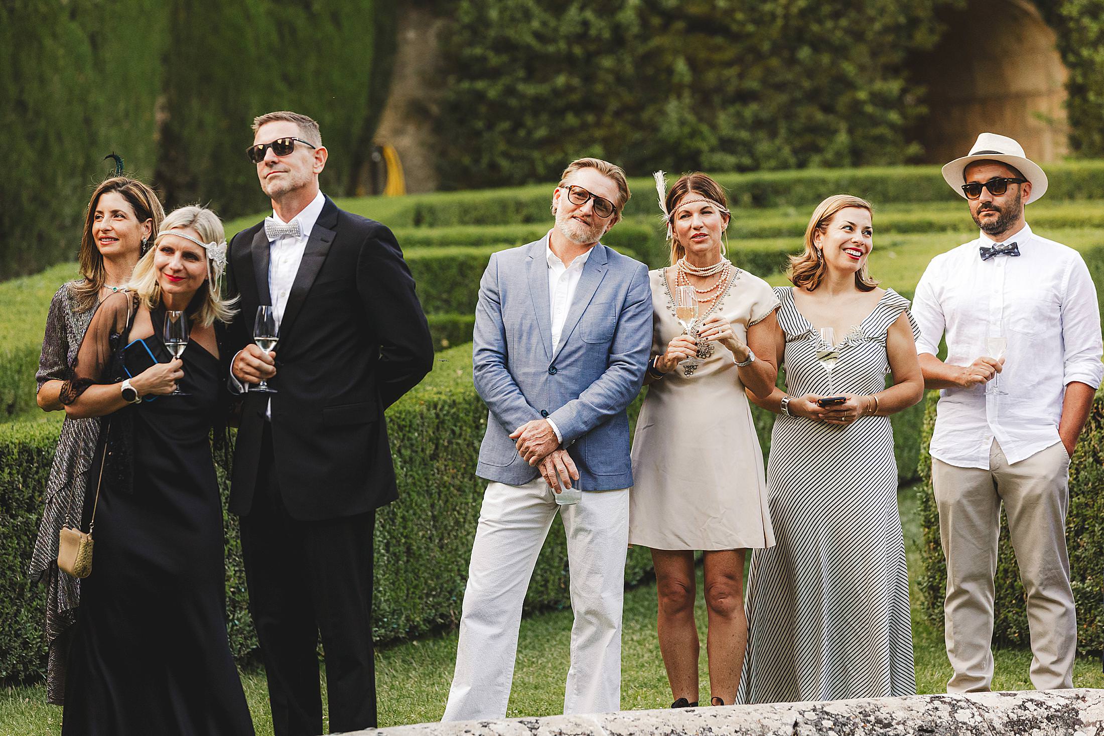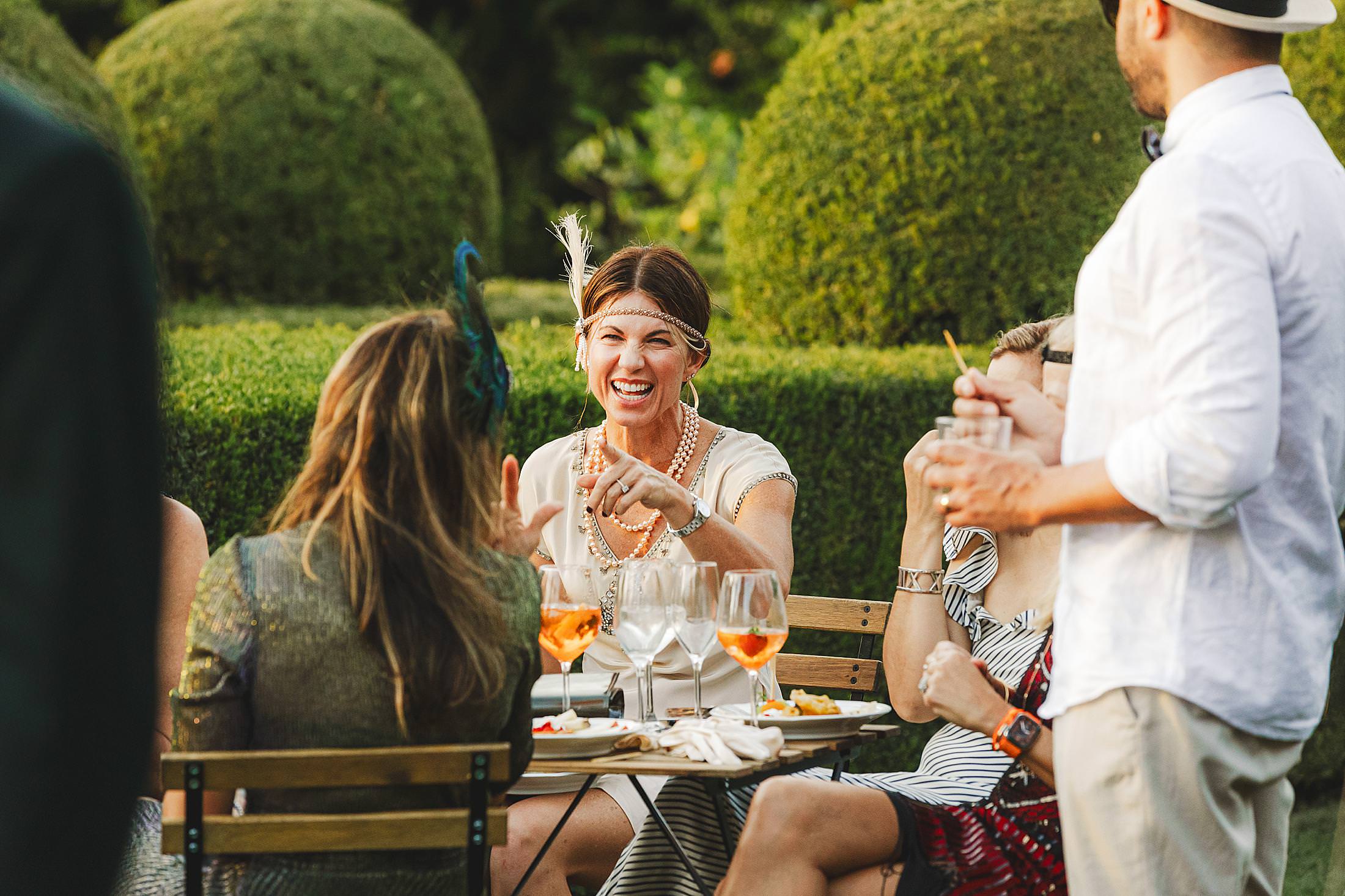 Wedding anniversary welcome cocktail in the gardens of La Foce. Photo by the Italian elegant wedding photographer in Tuscany based Florence Gabriele Fani