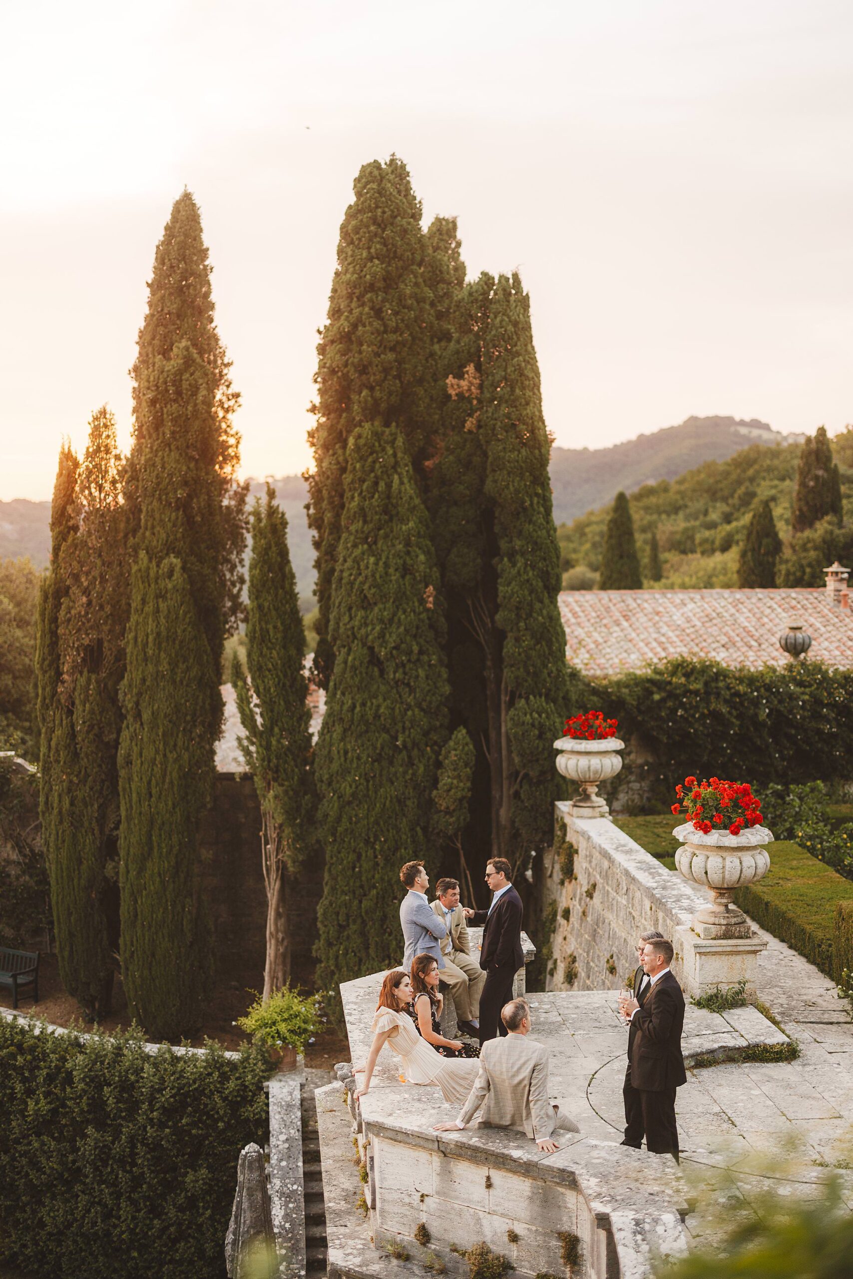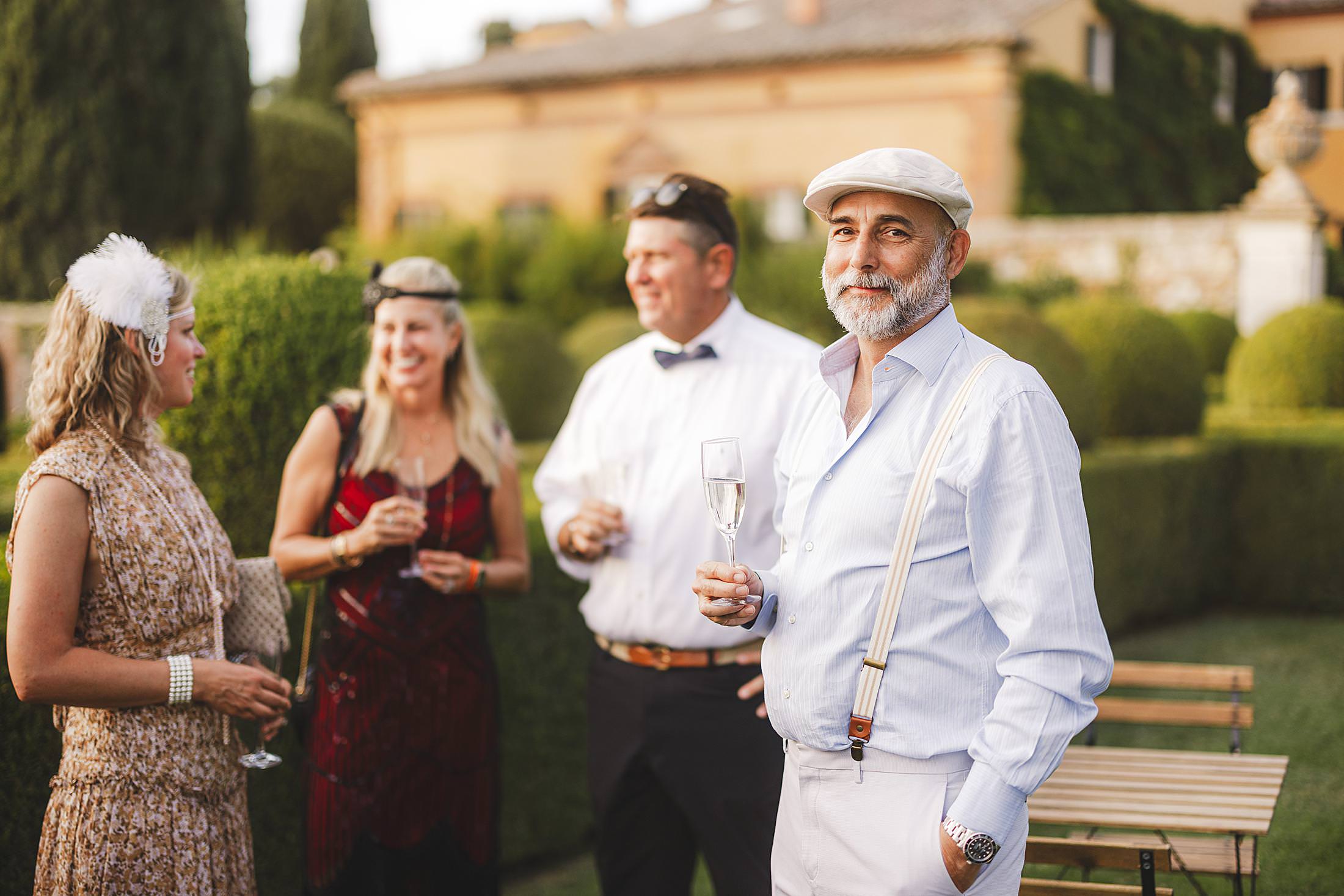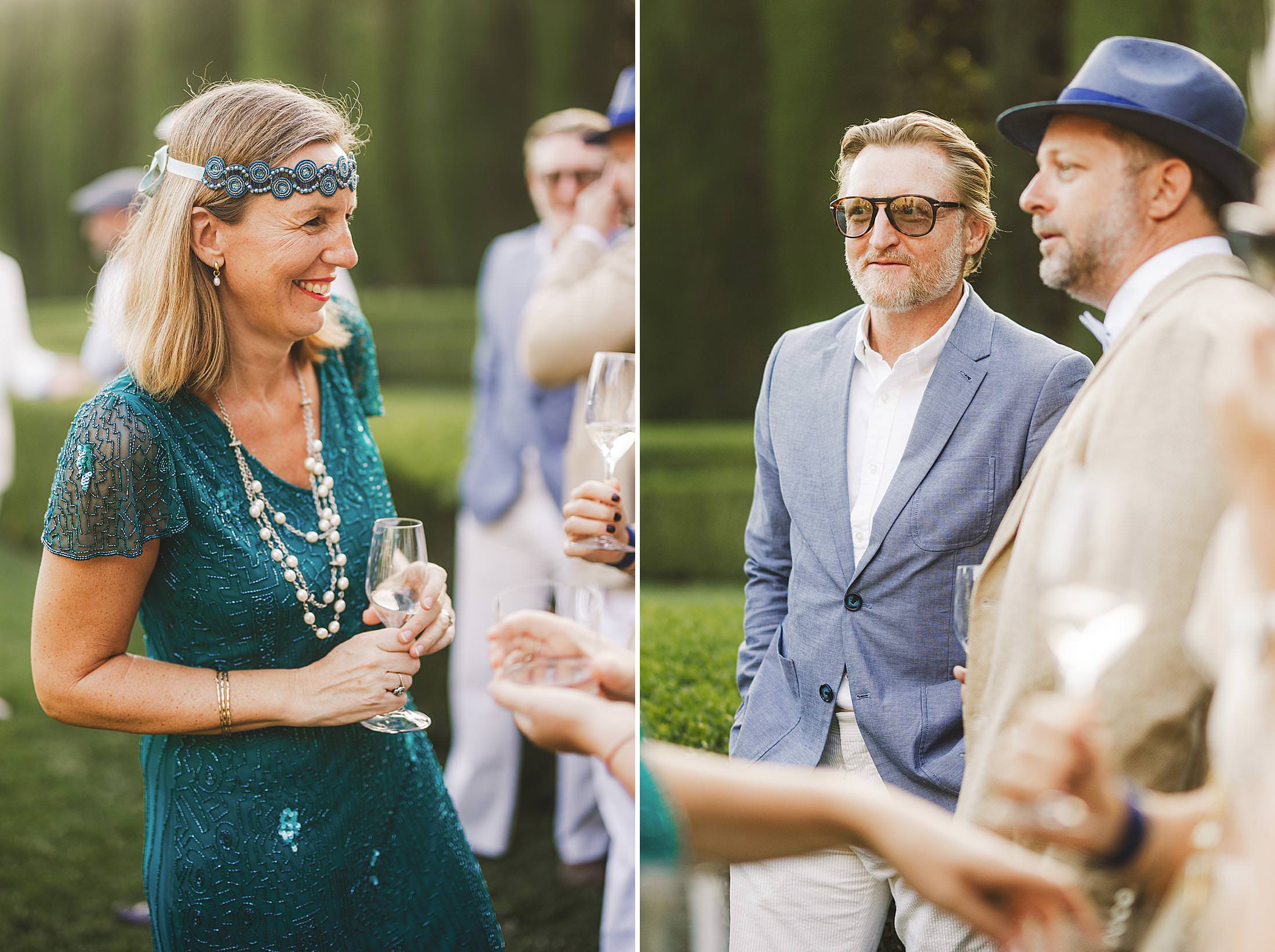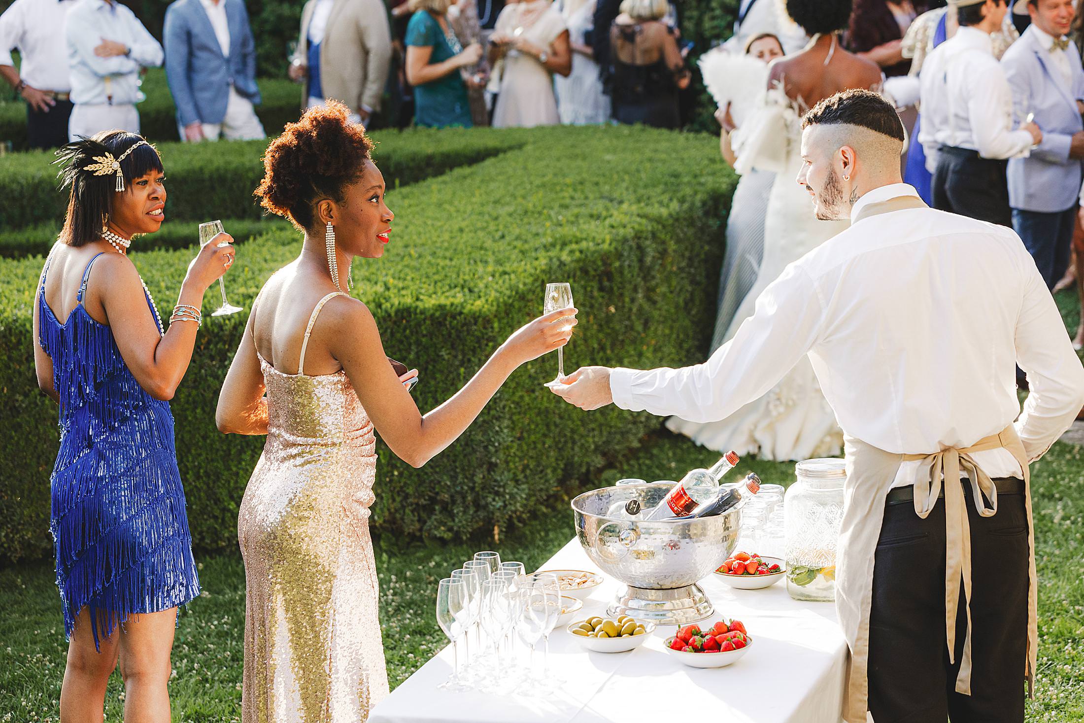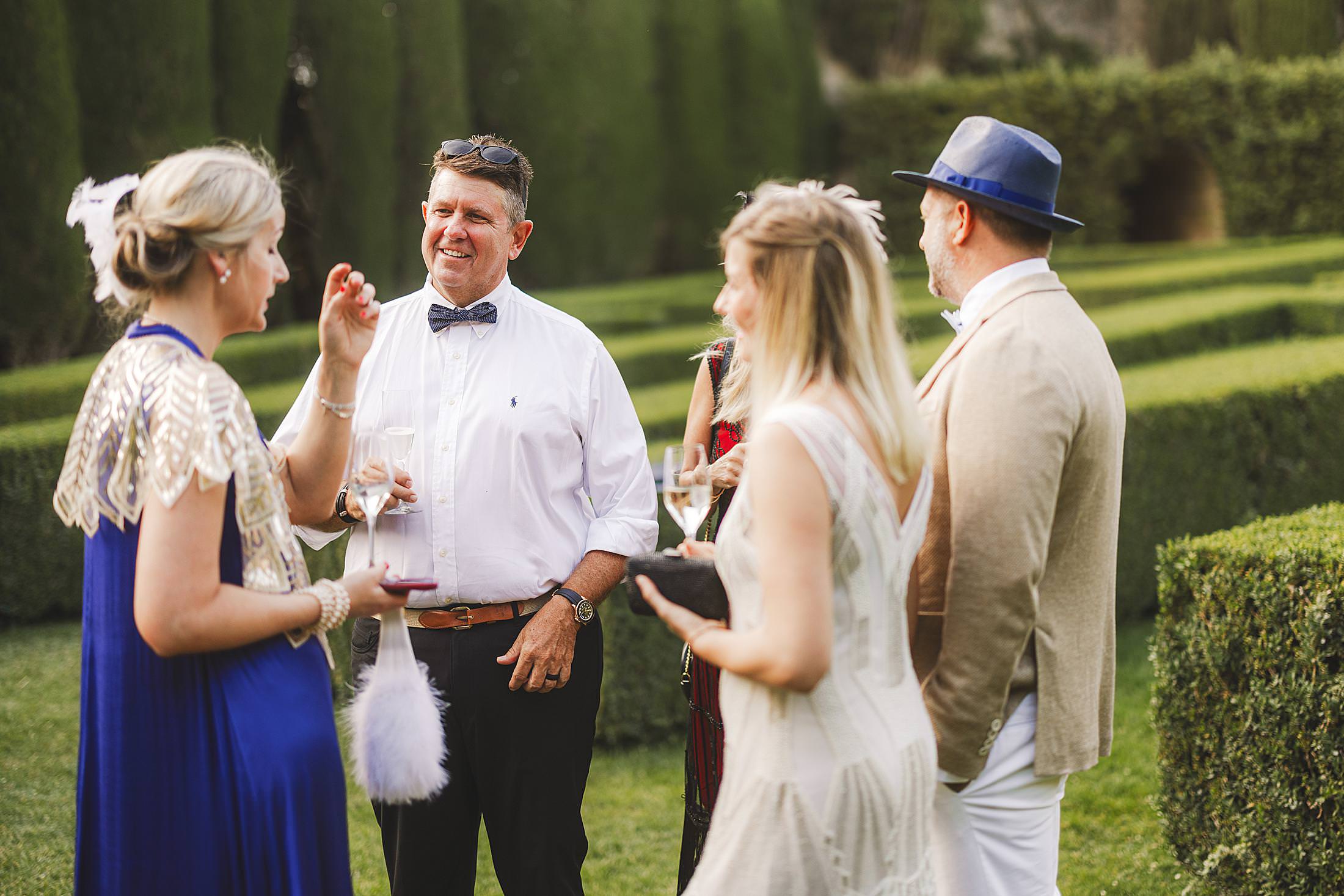 Wedding anniversary welcome cocktail in the gardens of La Foce. Photo by the Italian elegant wedding photographer in Tuscany based Florence Gabriele Fani