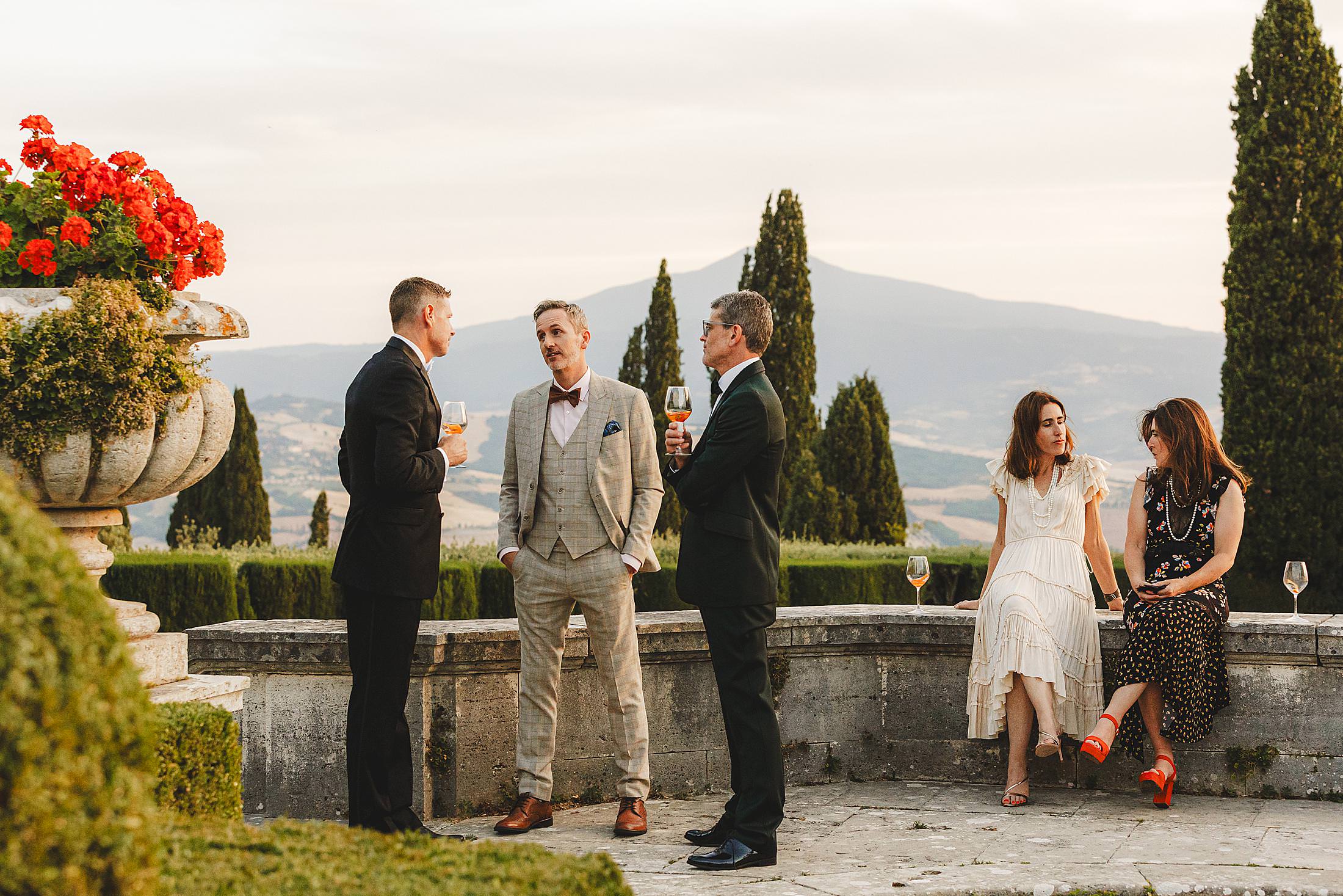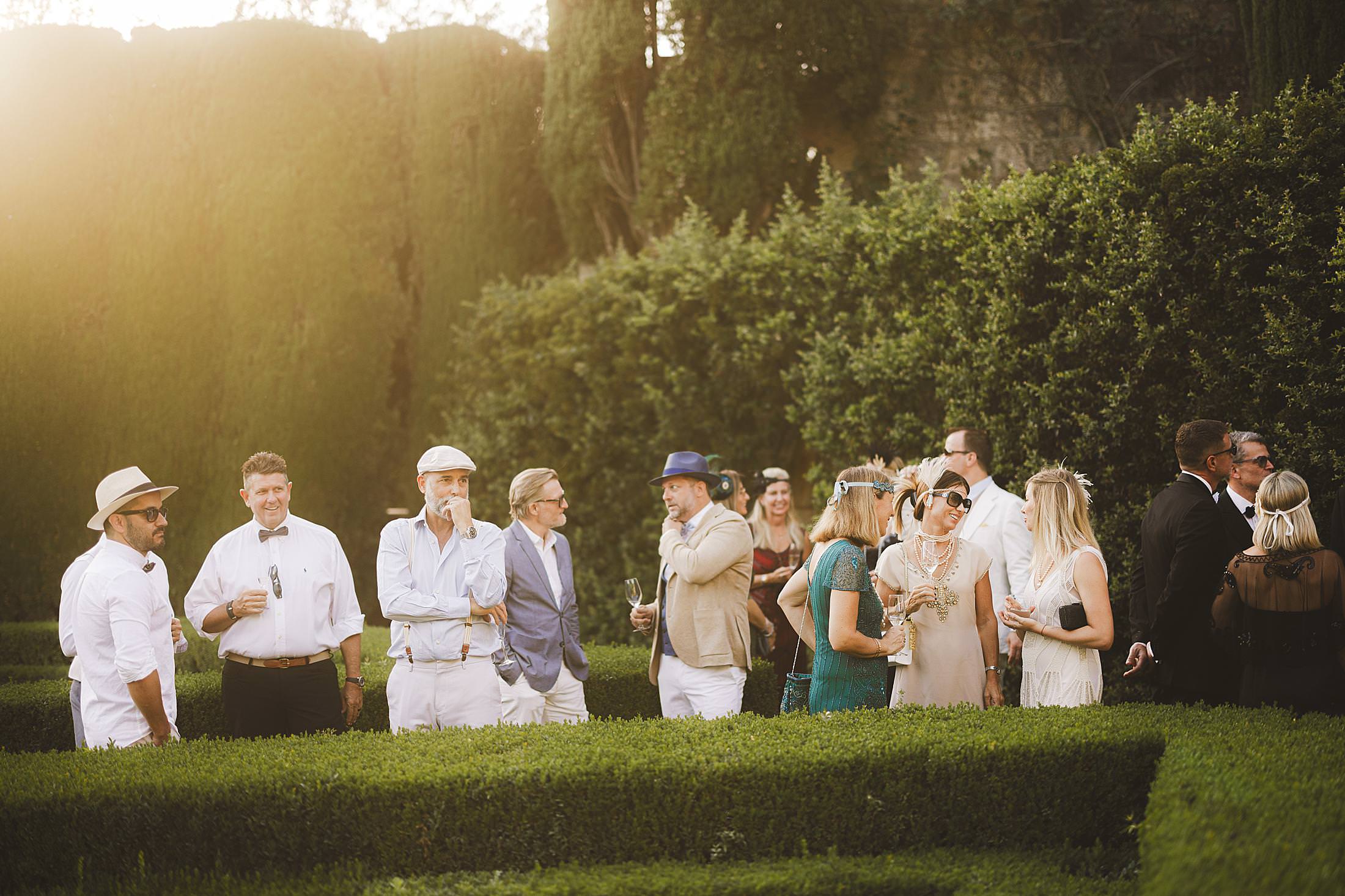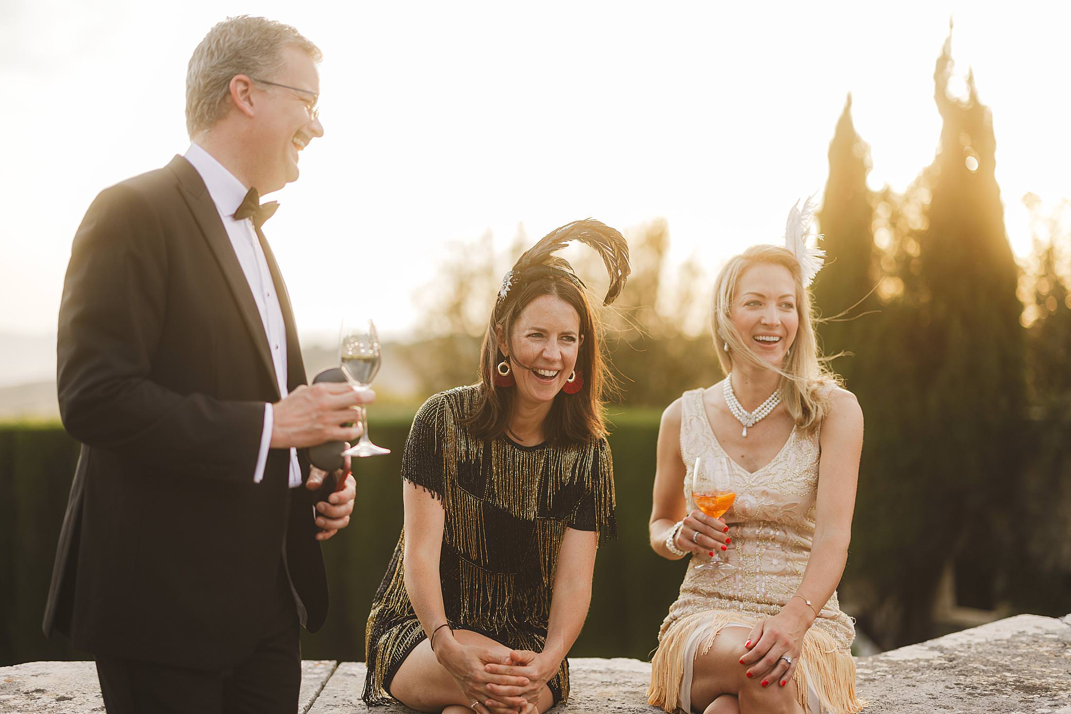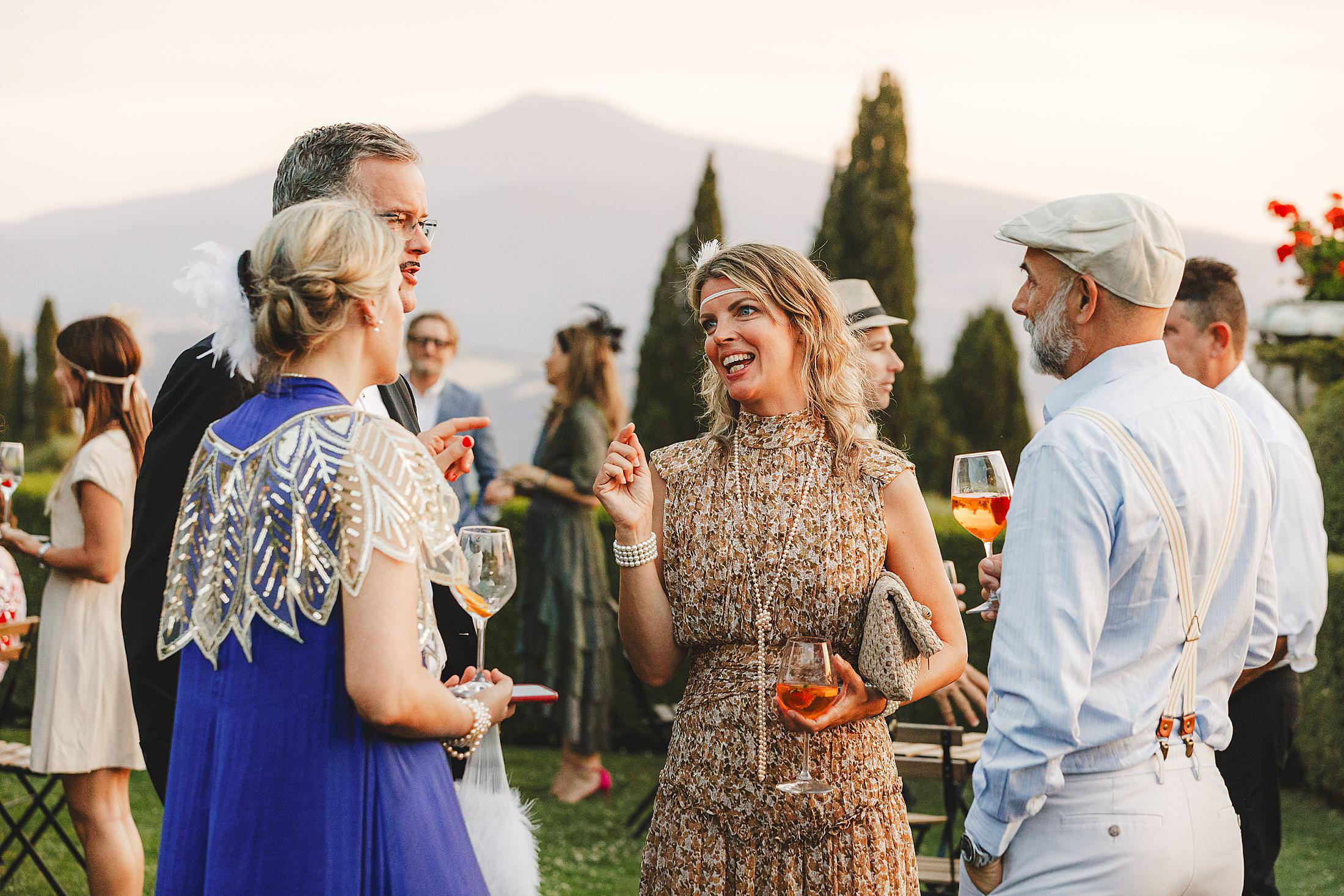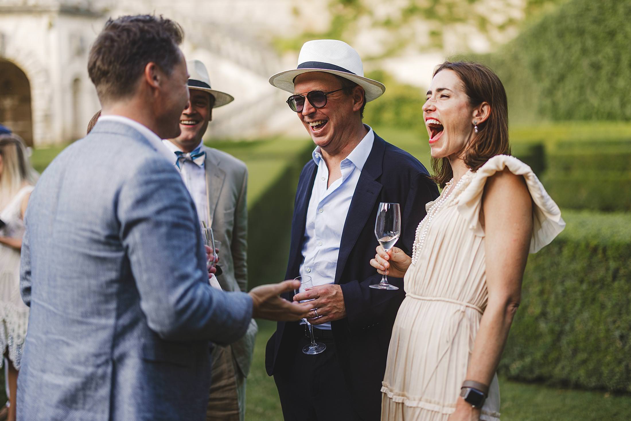 Wedding anniversary welcome cocktail in the gardens of La Foce. Photo by the Italian elegant wedding photographer in Tuscany based Florence Gabriele Fani