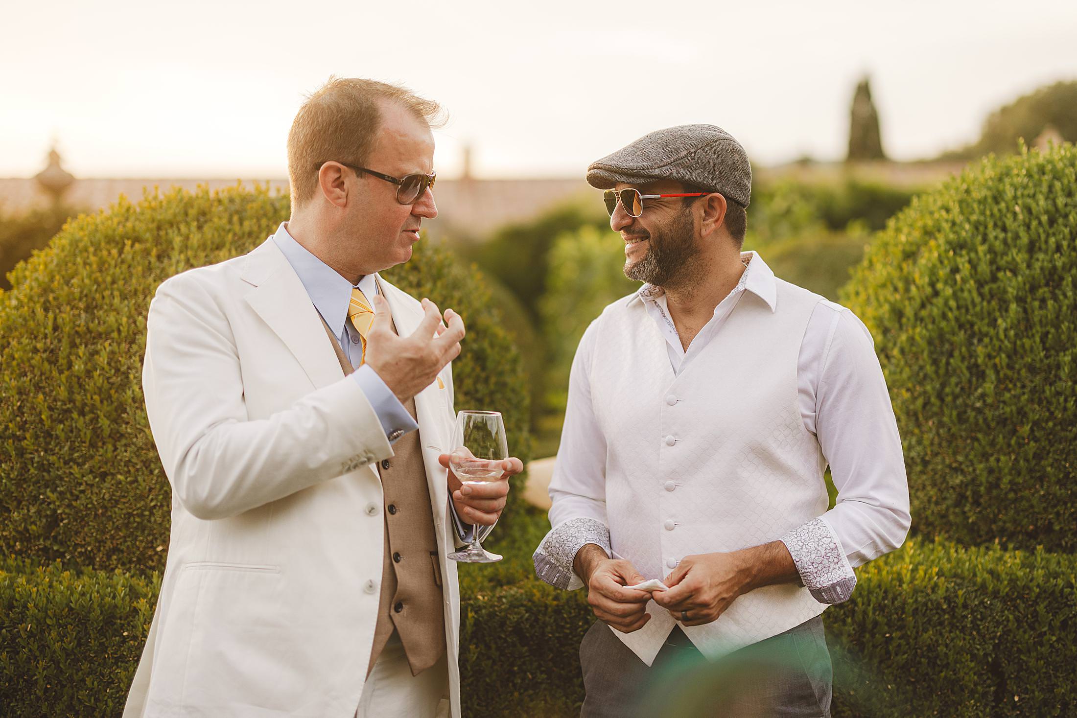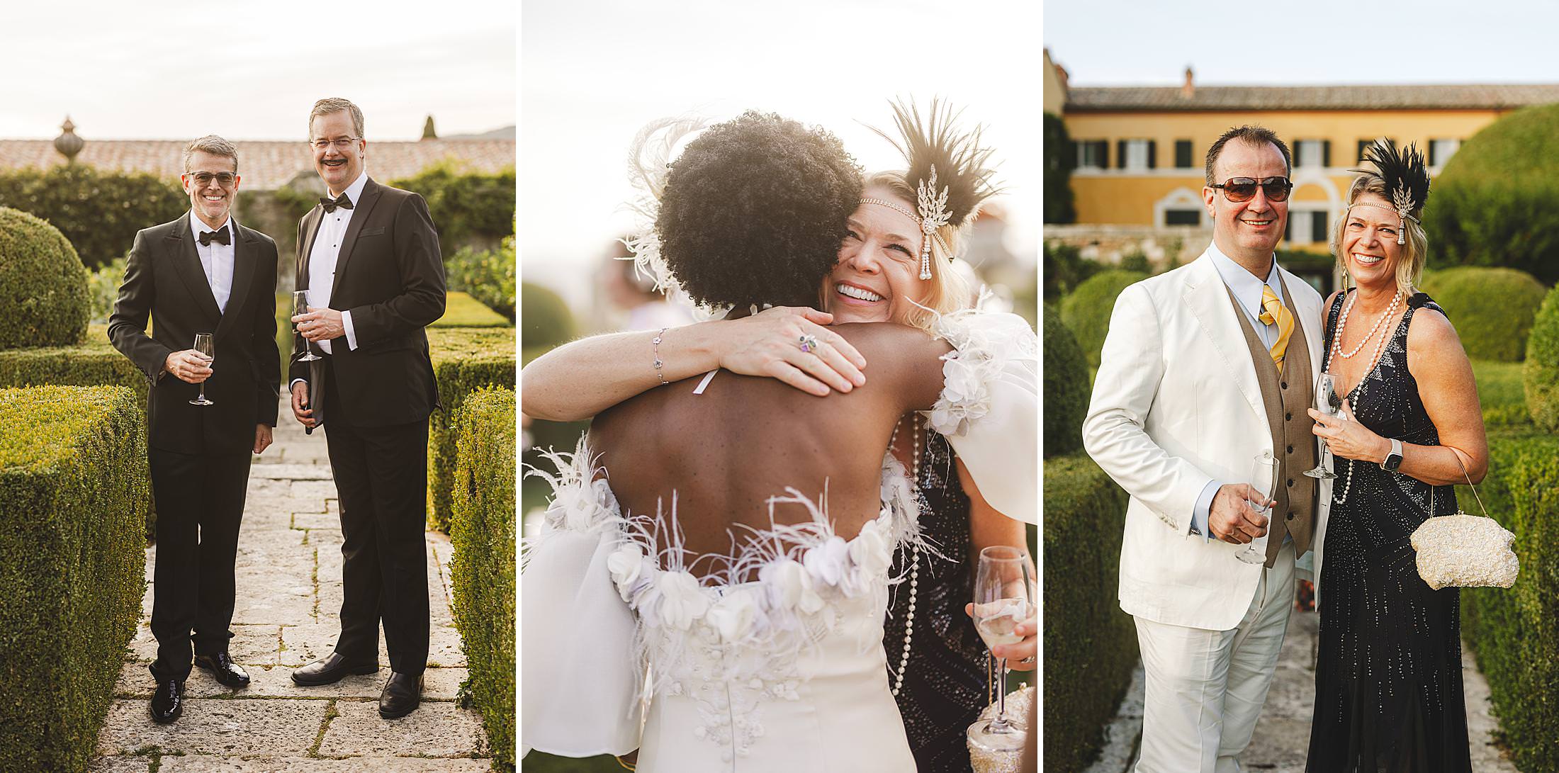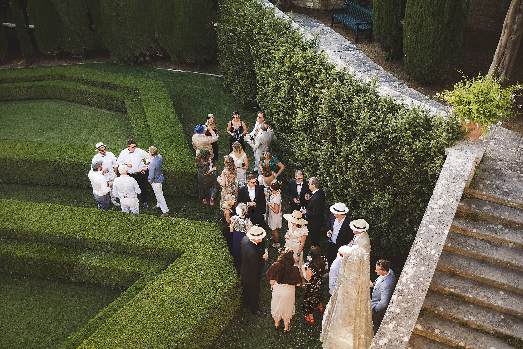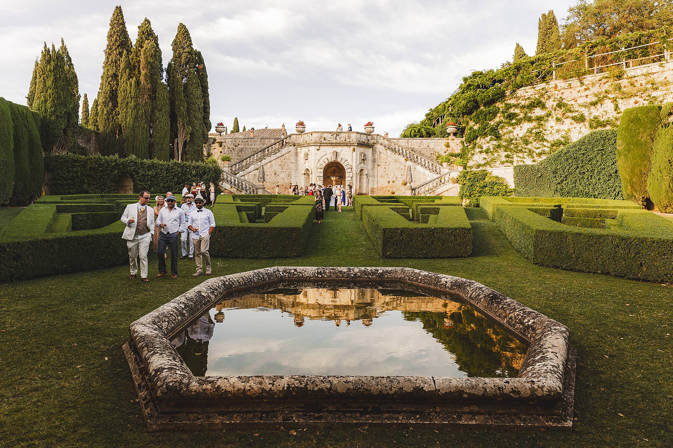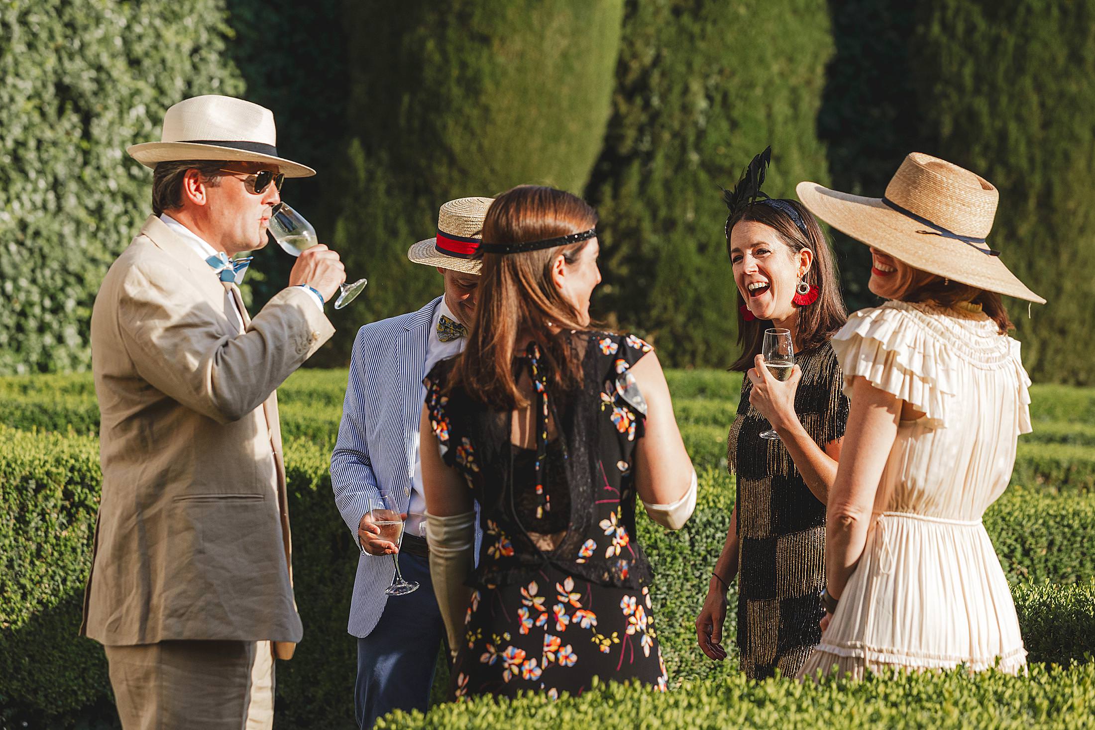 Wedding anniversary welcome cocktail in the gardens of La Foce. Photo by the Italian elegant wedding photographer in Tuscany based Florence Gabriele Fani