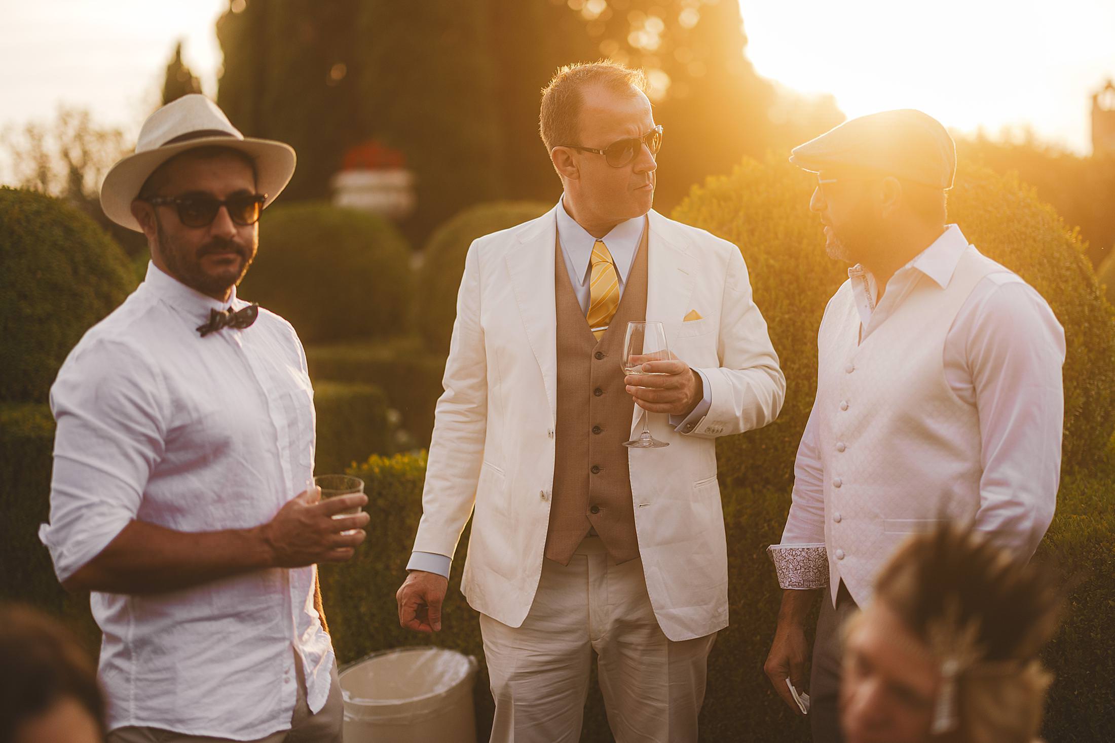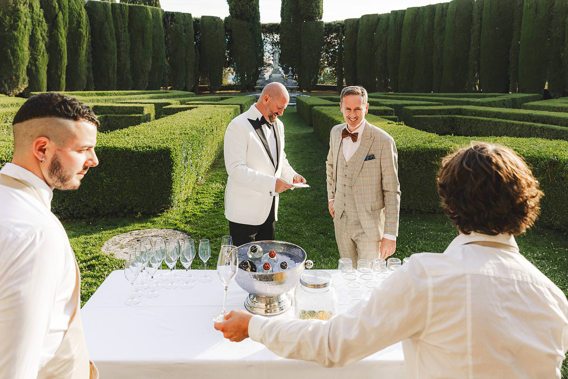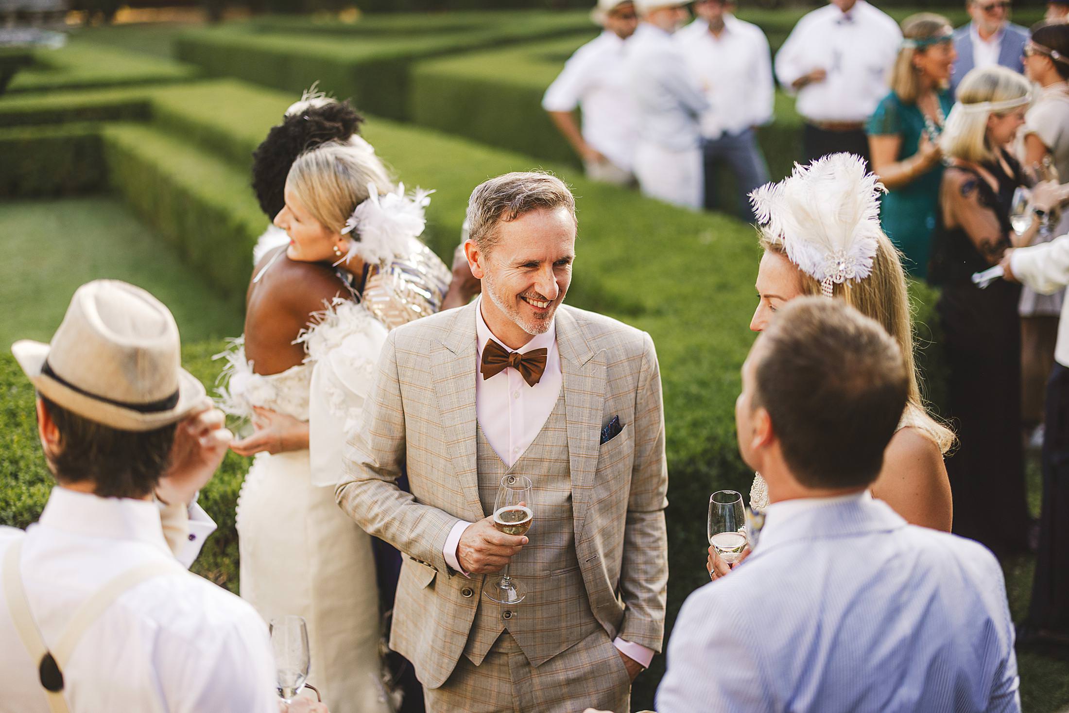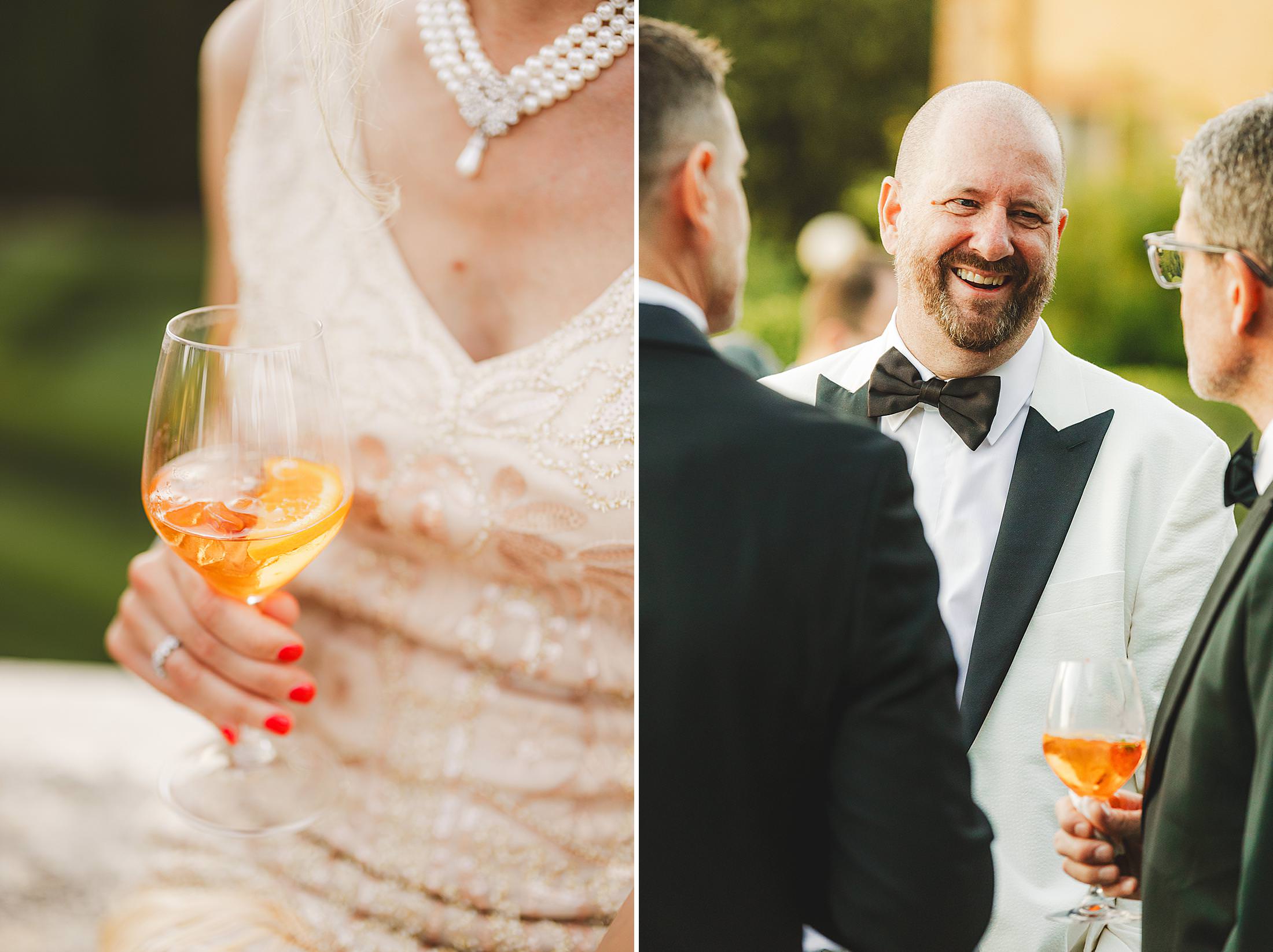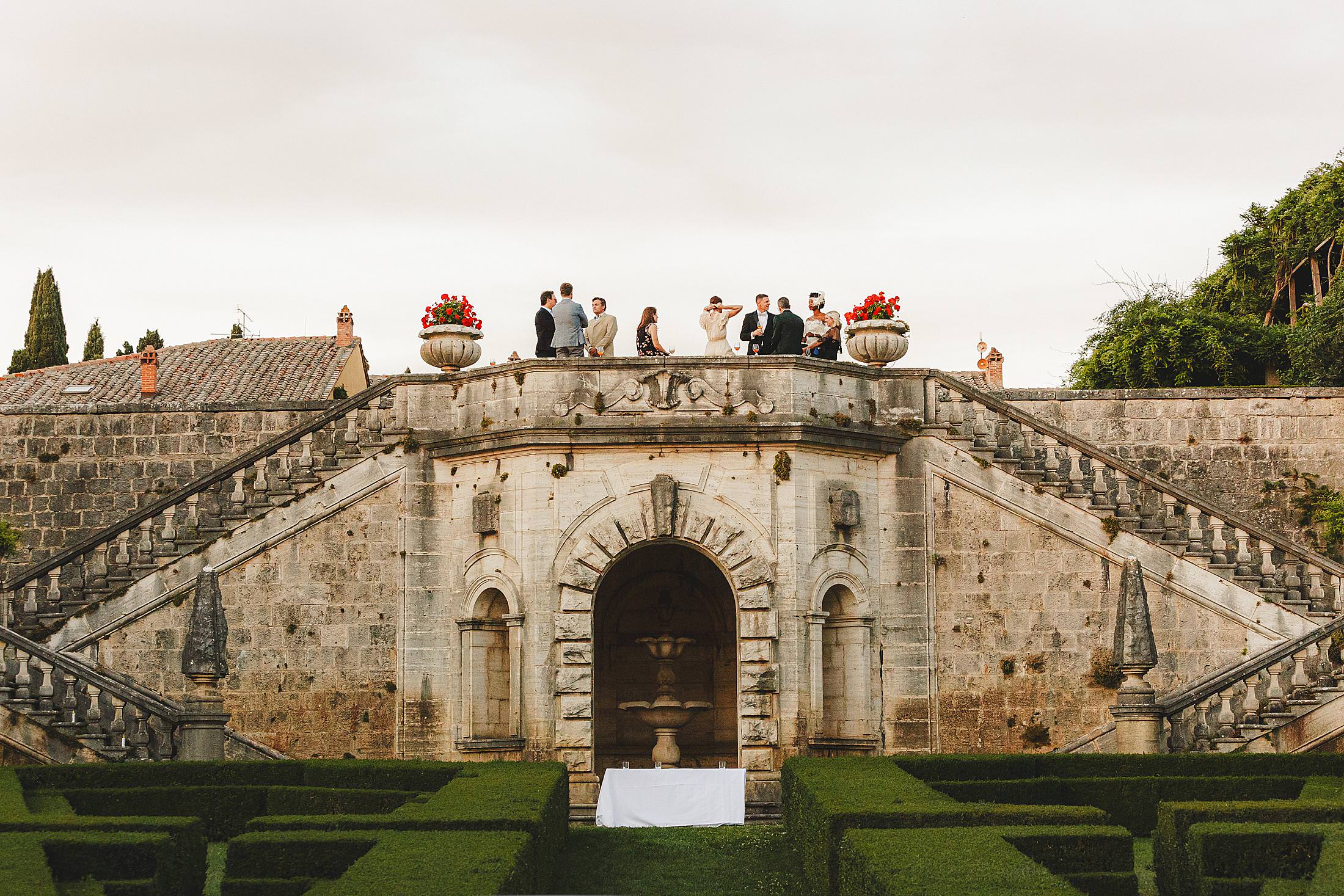 Wedding anniversary welcome cocktail in the gardens of La Foce. Photo by the Italian elegant wedding photographer in Tuscany based Florence Gabriele Fani