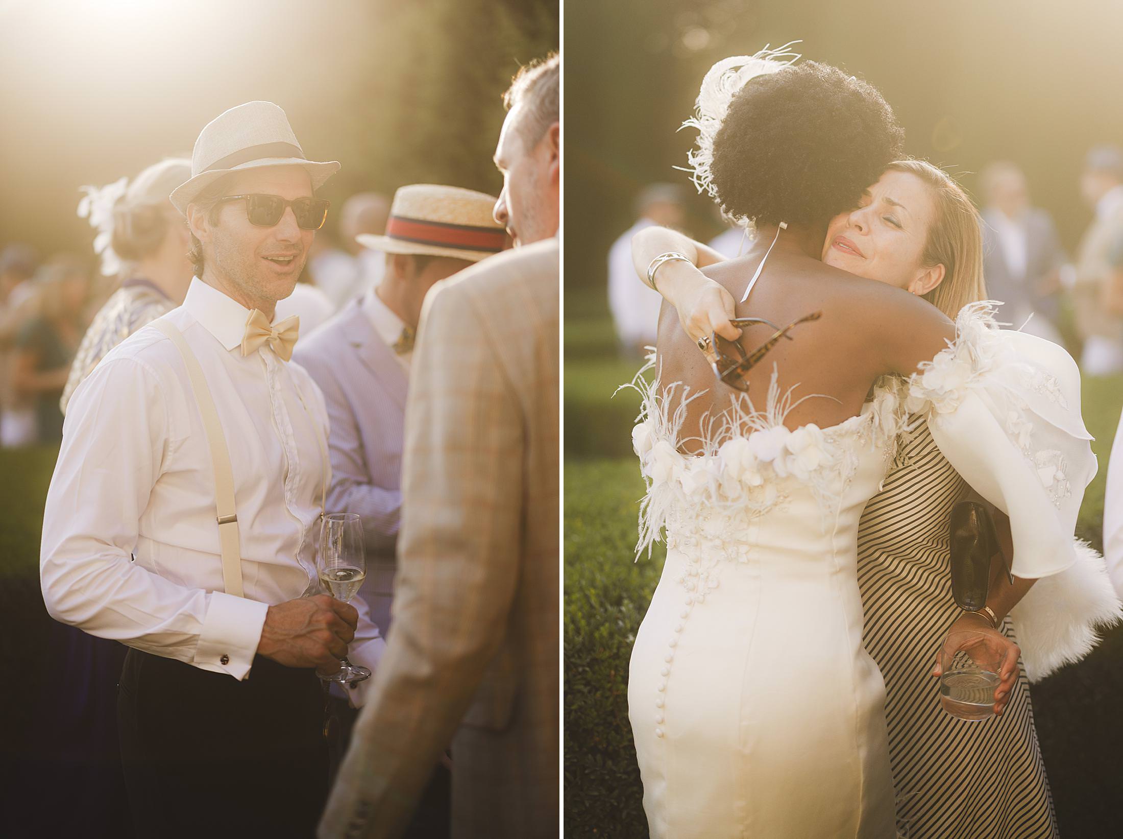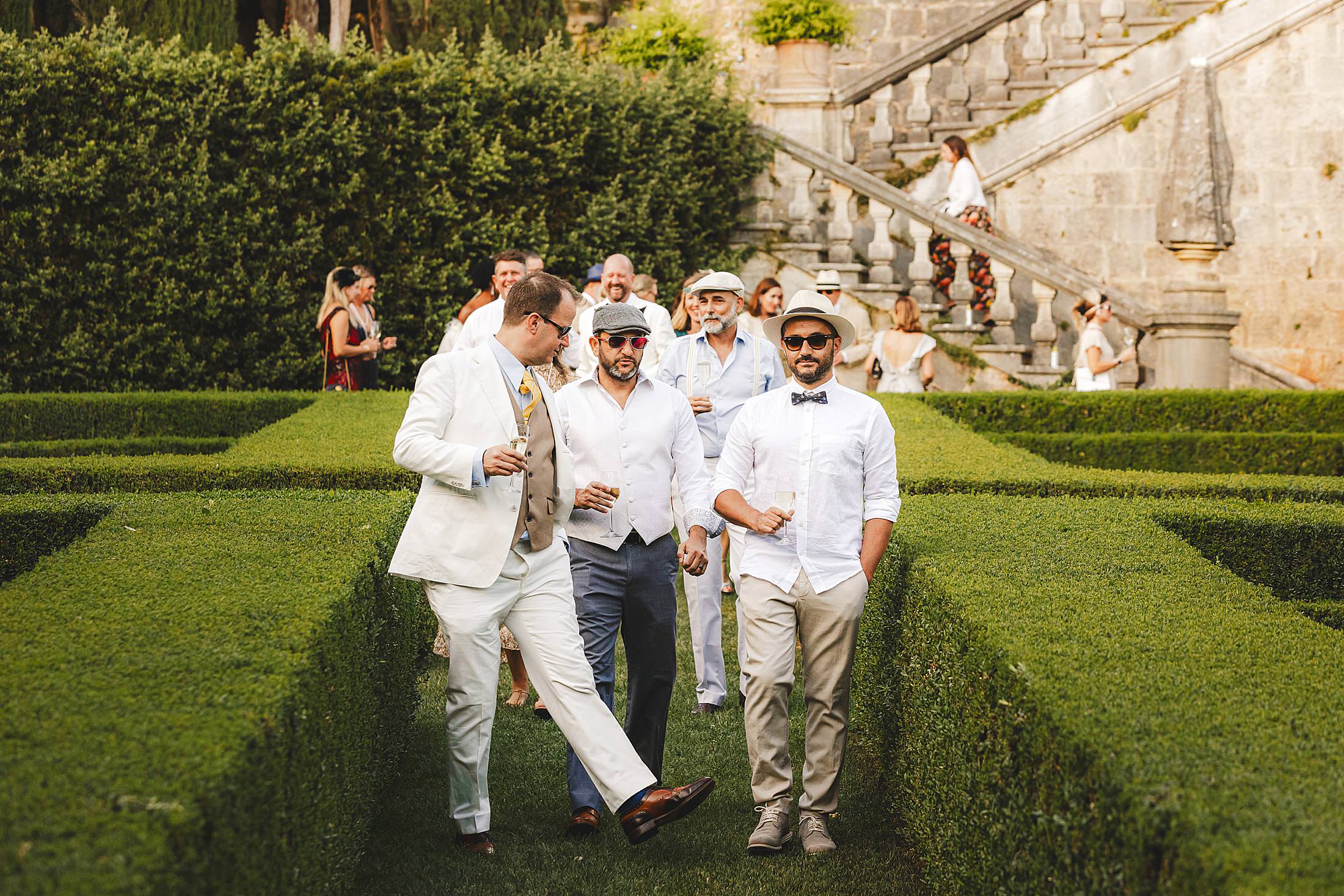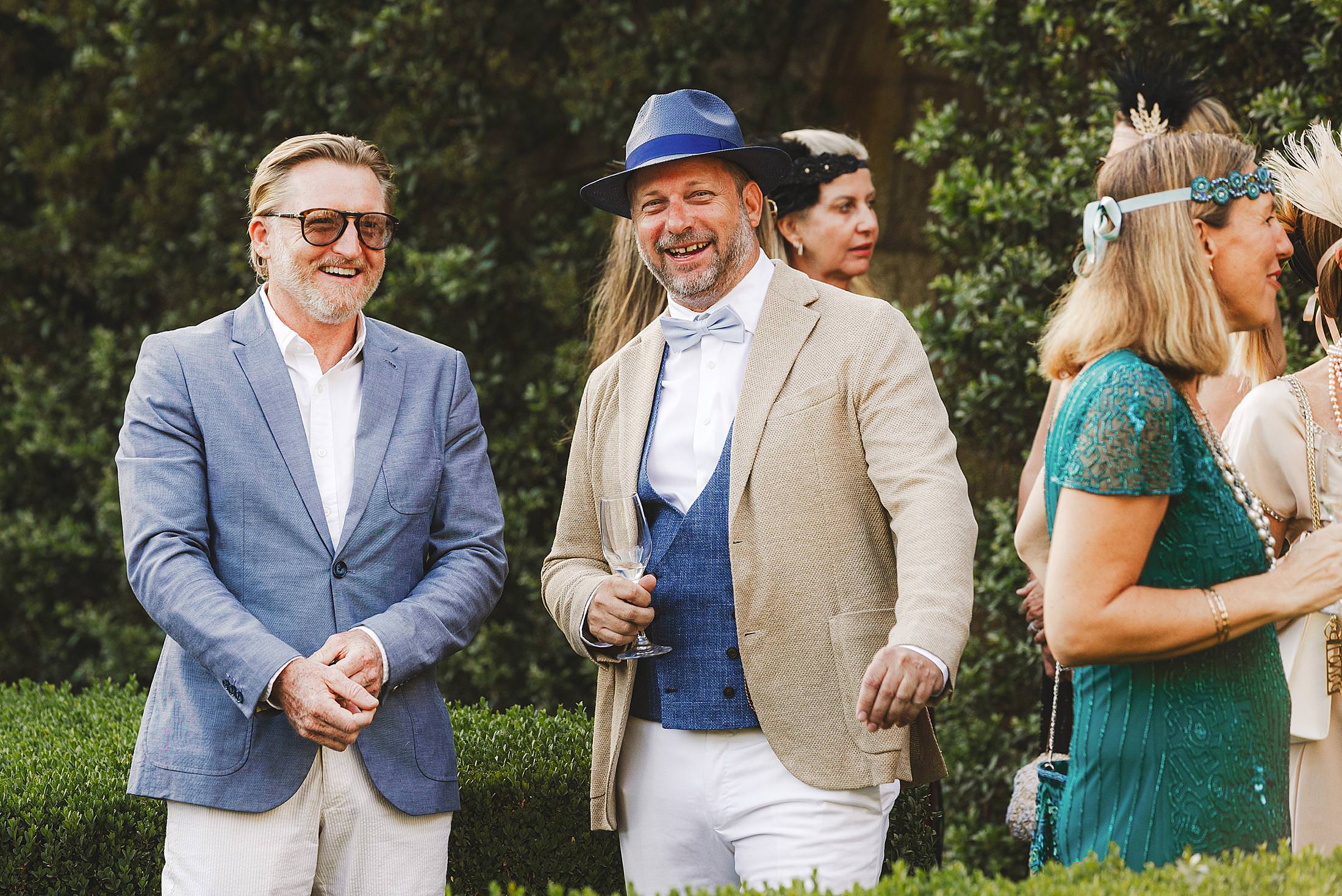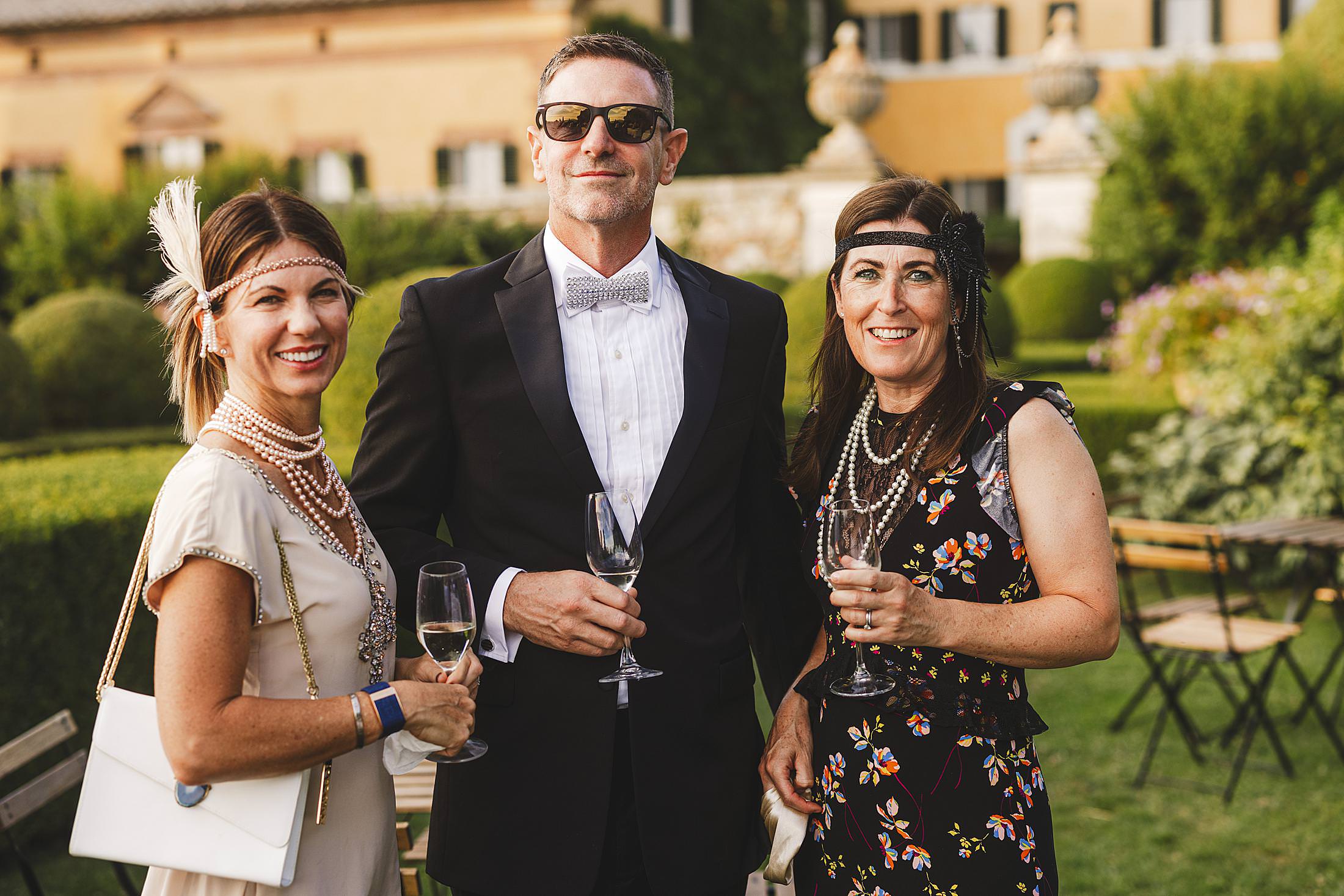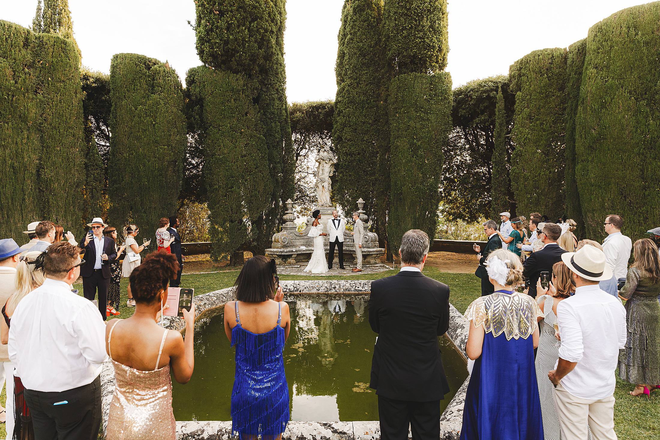 Wedding anniversary welcome cocktail in the gardens of La Foce. Photo by the Italian elegant wedding photographer in Tuscany based Florence Gabriele Fani