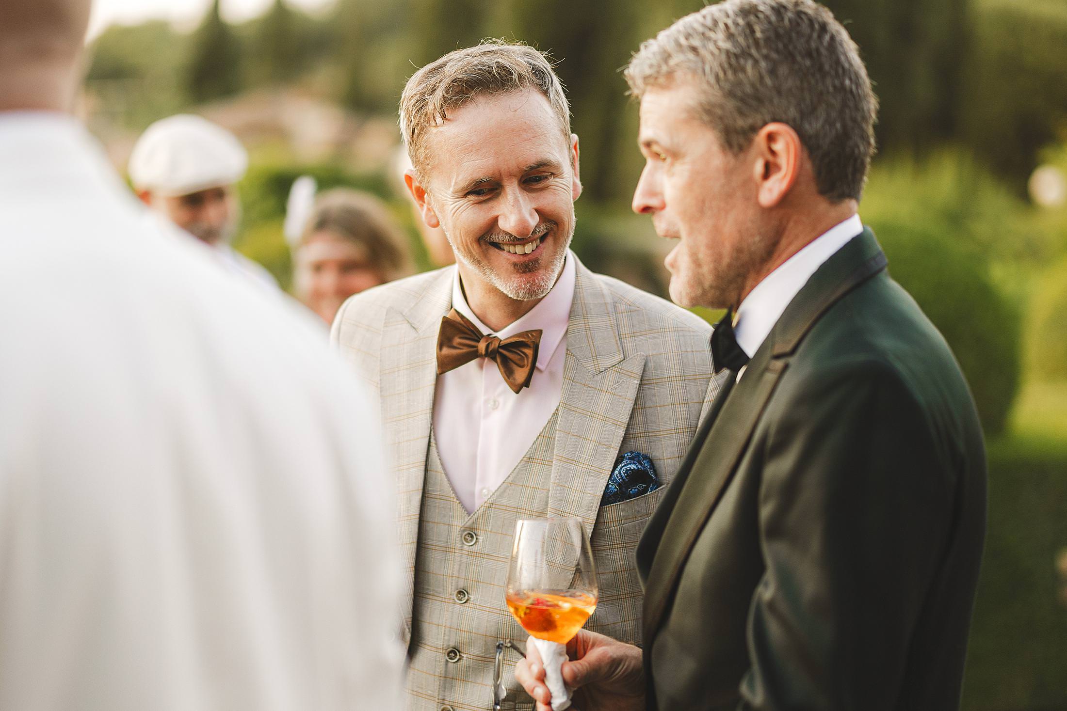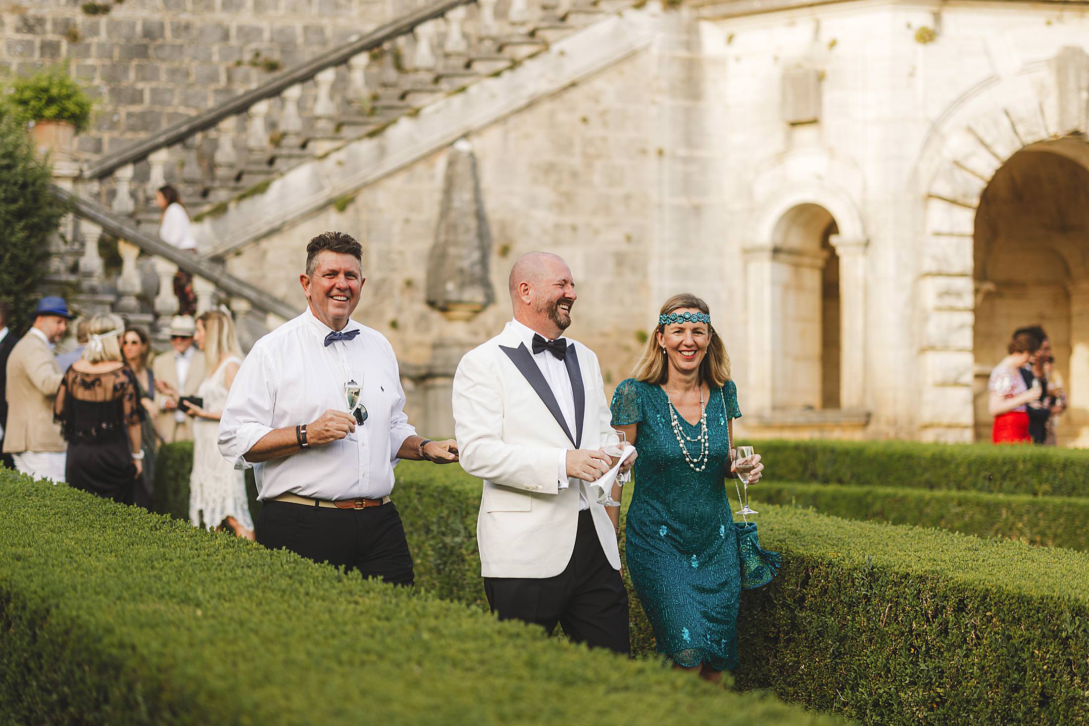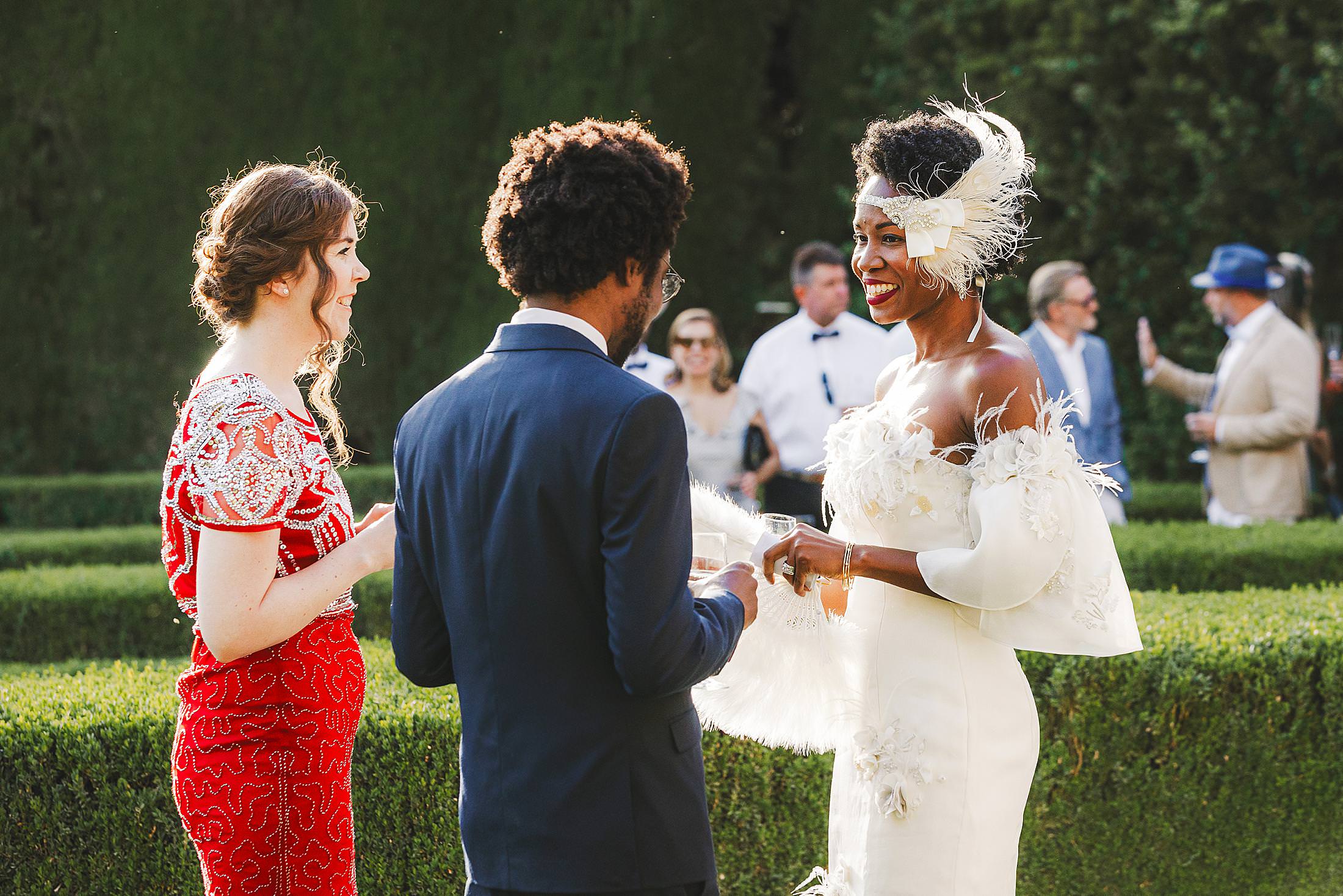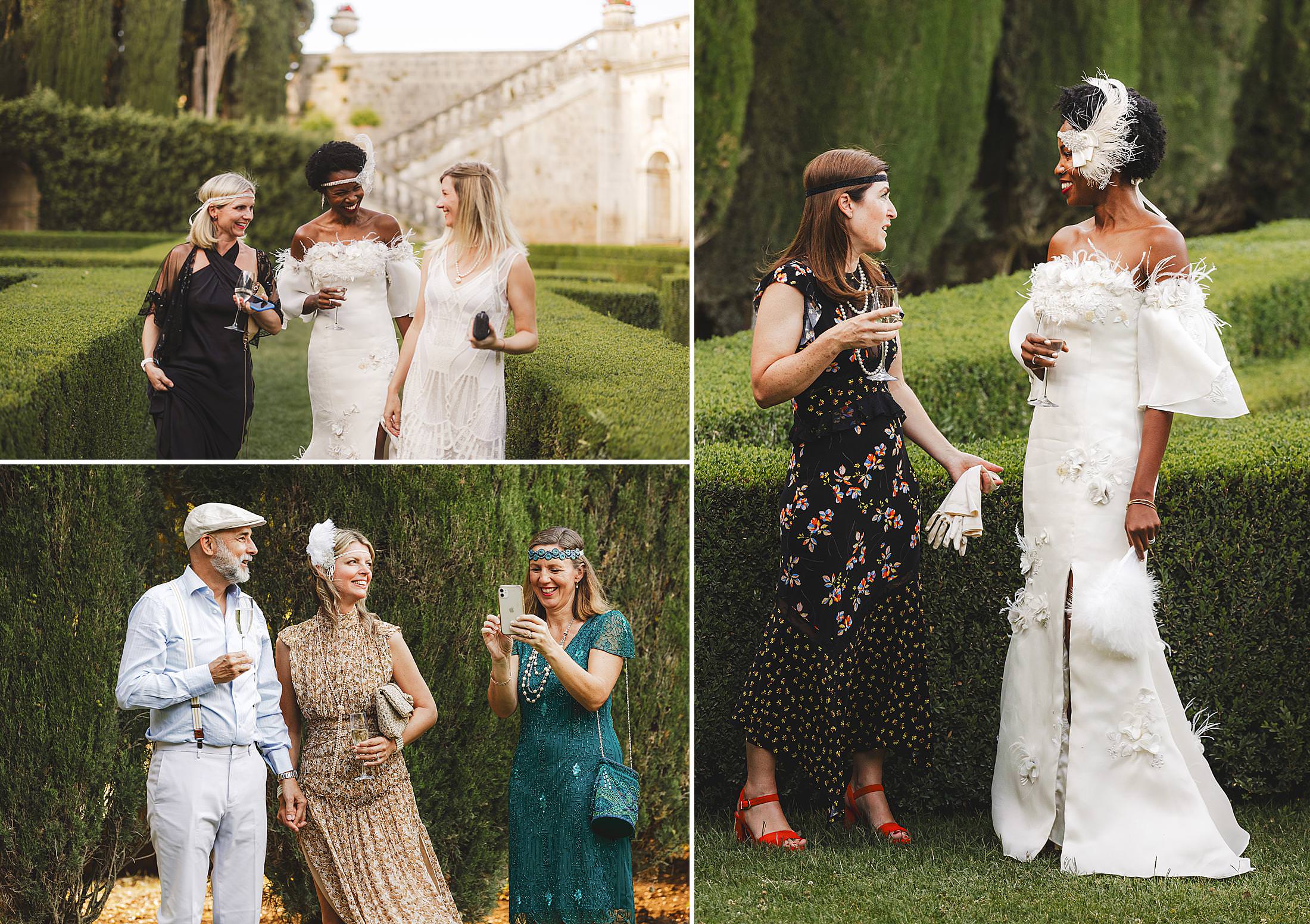 Wedding anniversary welcome cocktail in the gardens of La Foce. Photo by the Italian elegant wedding photographer in Tuscany based Florence Gabriele Fani