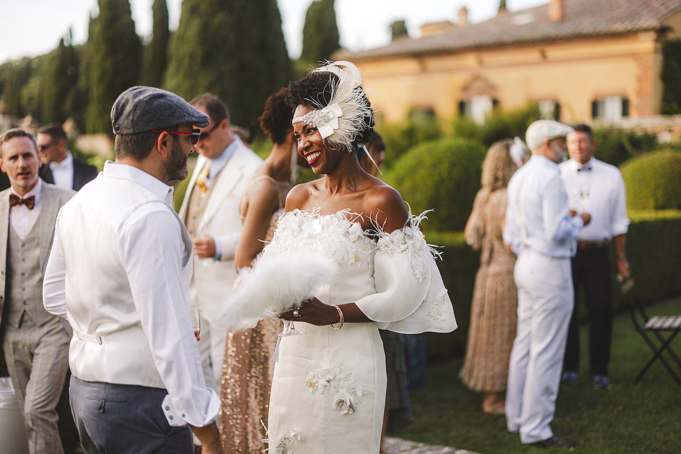 Elegant and glamour 1920s 1930s style photo of a real bride at La Foce for the 10th wedding anniversary event. Photo by the Italian elegant wedding photographer in Tuscany based Florence Gabriele Fani