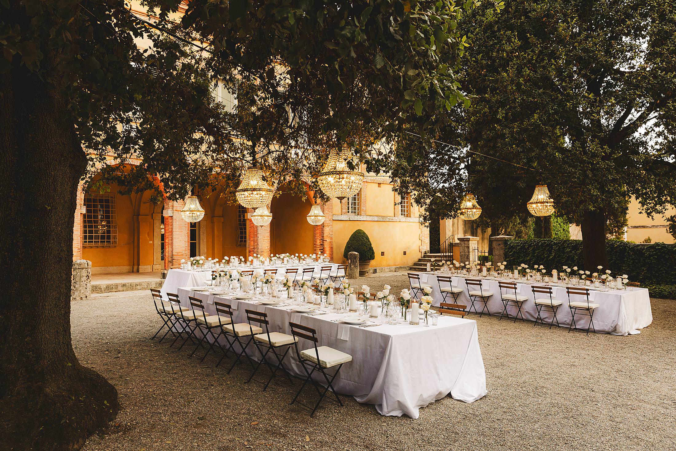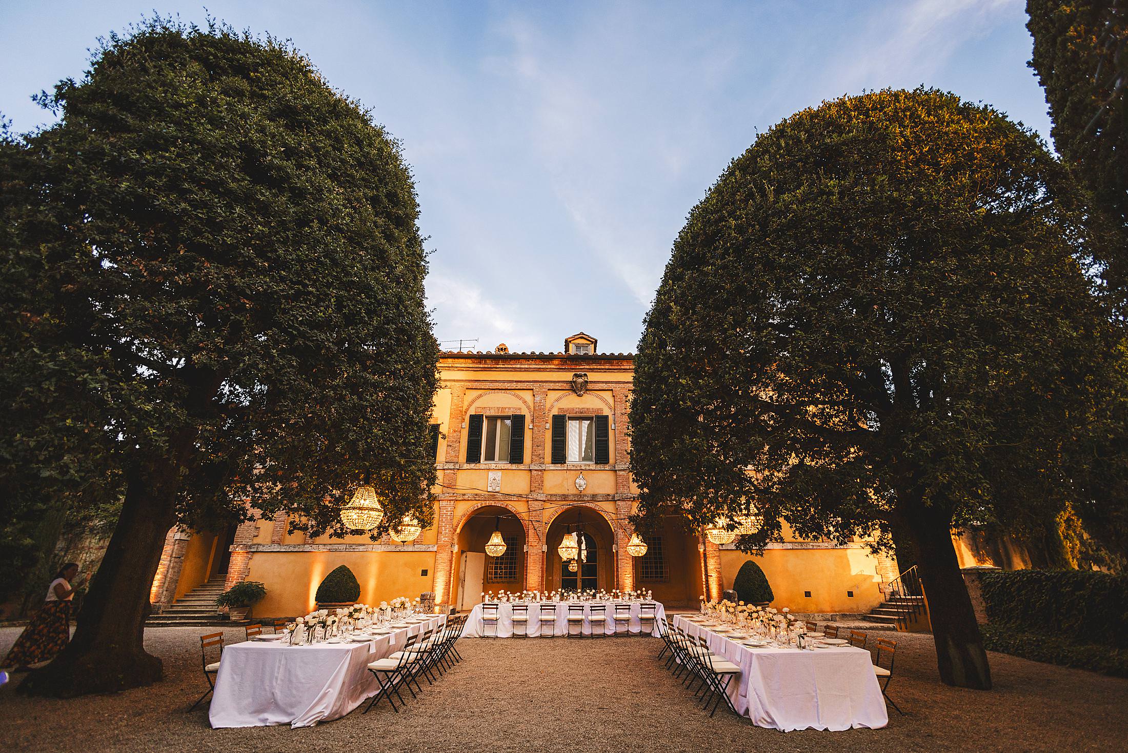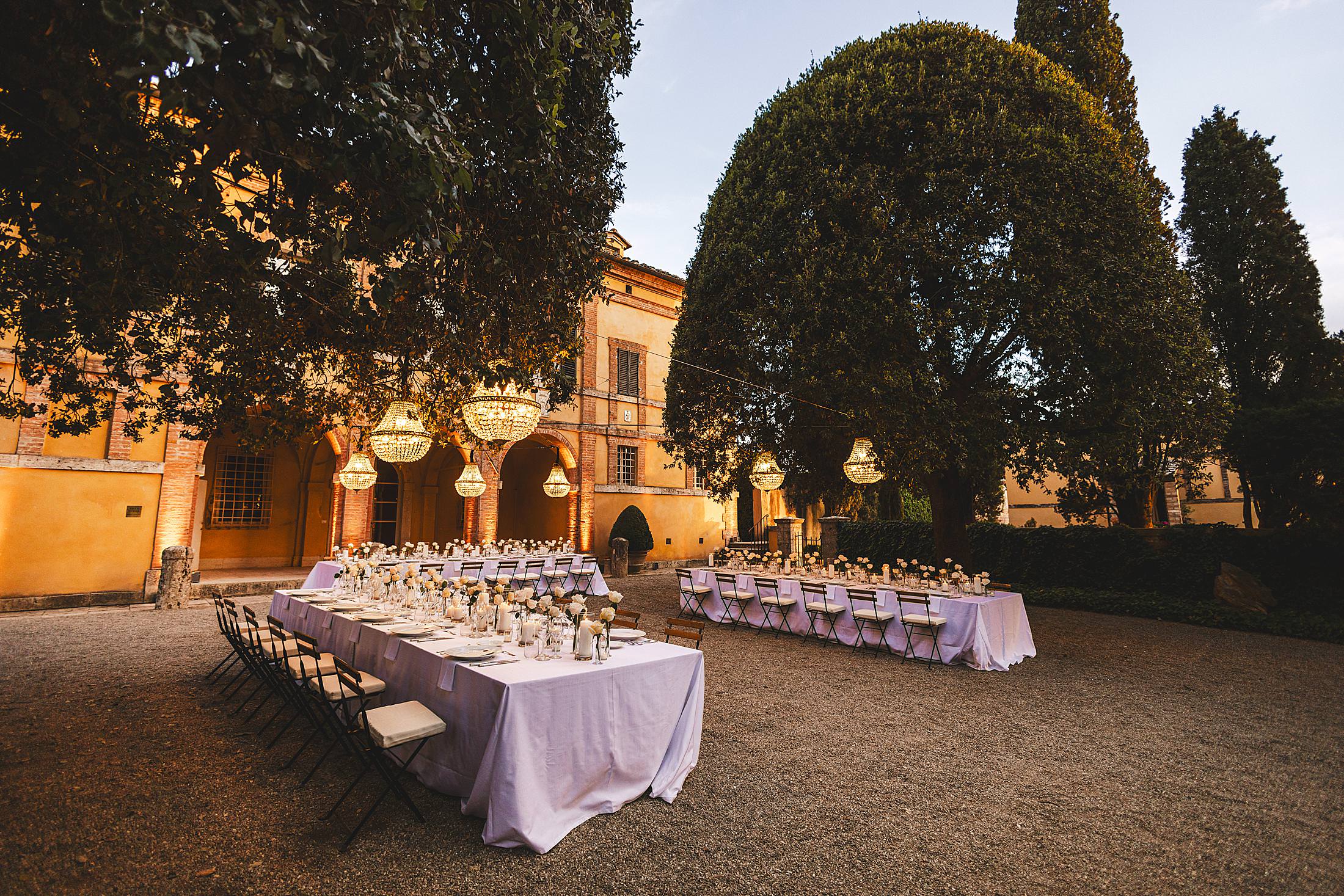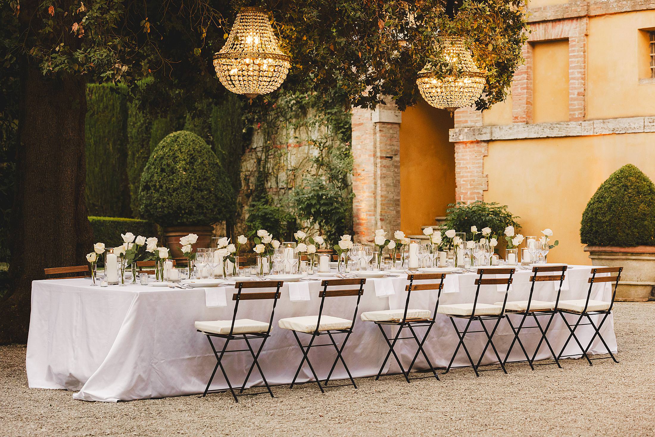 Elegant wedding dinner setup decor at La Foce breathtaking venue in the heart of Val d’Orcia. Photo by the Italian elegant wedding photographer in Tuscany based Florence Gabriele Fani