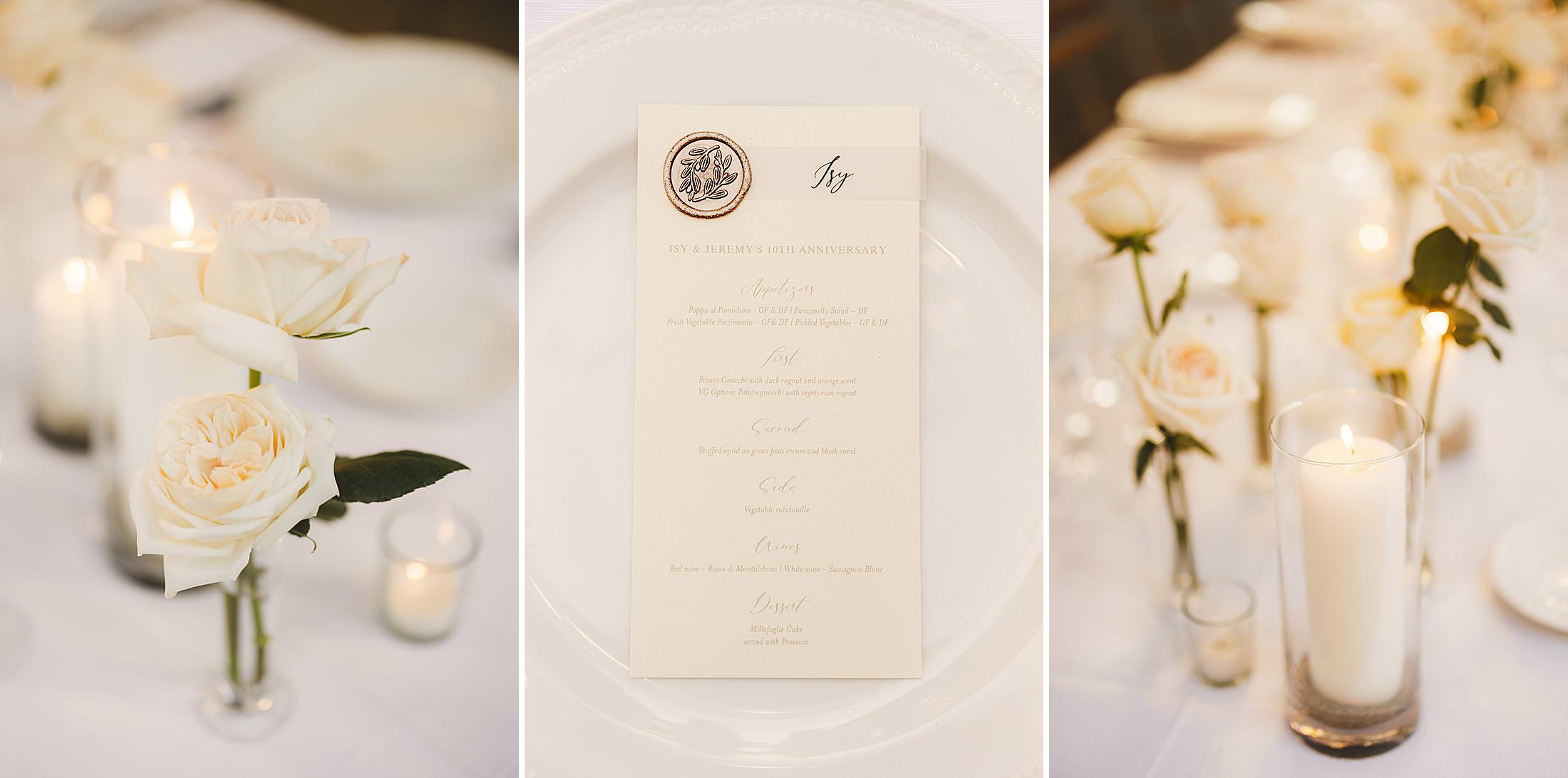 Following the ceremony, a refined dinner awaited, with floral arrangements and table settings reflecting the effortless sophistication of the era. Guests raised their glasses in heartfelt toasts, celebrating not only a decade of marriage but also a milestone birthday: another joyful reminder of the journey they had traveled together.