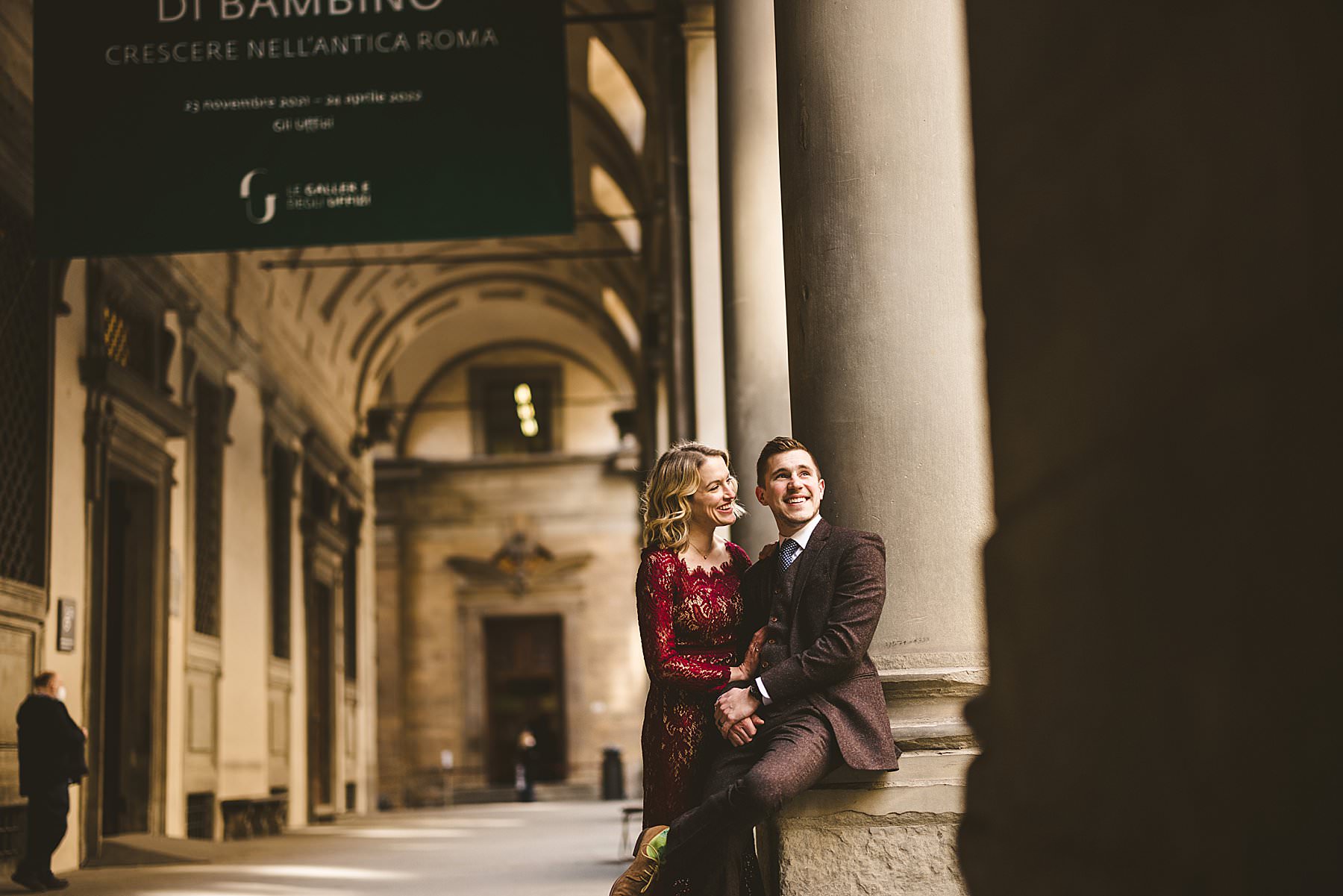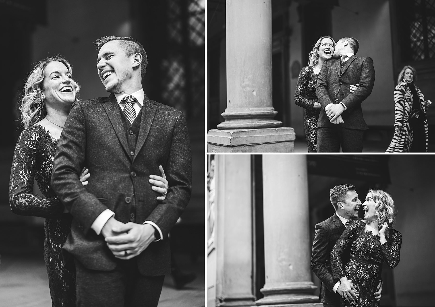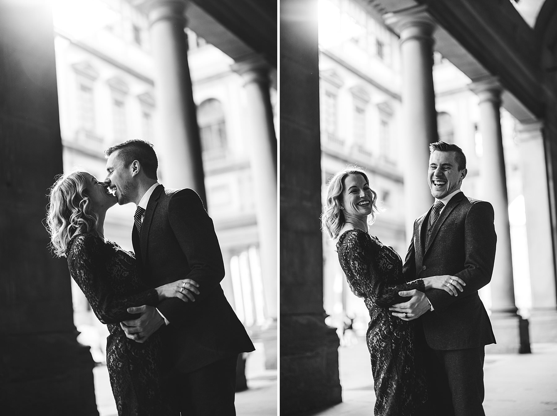 Exciting candid couple portrait wedding anniversary photo in the heart of Florence near Uffizi. Photo by the Italian elegant and creative couple portrait photographer in Tuscany based Florence Gabriele Fani