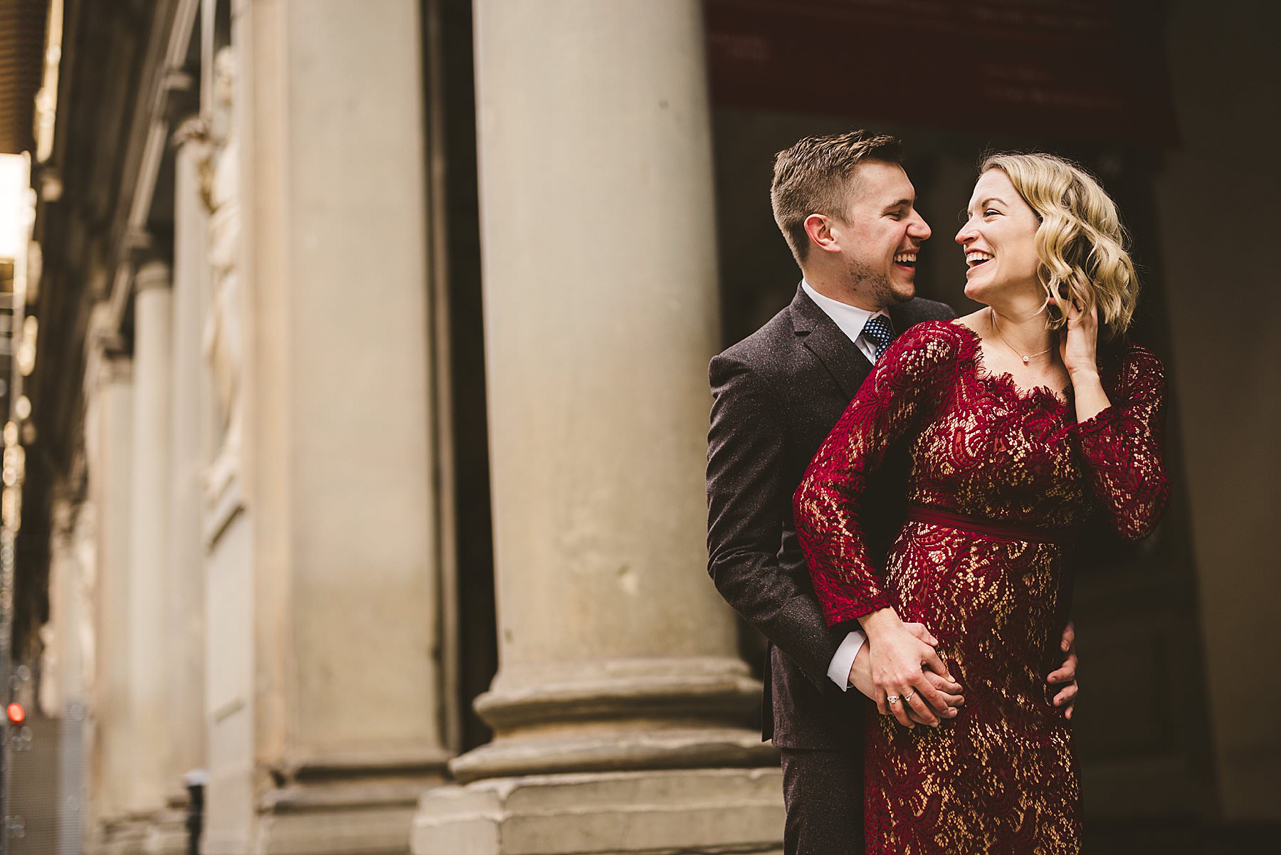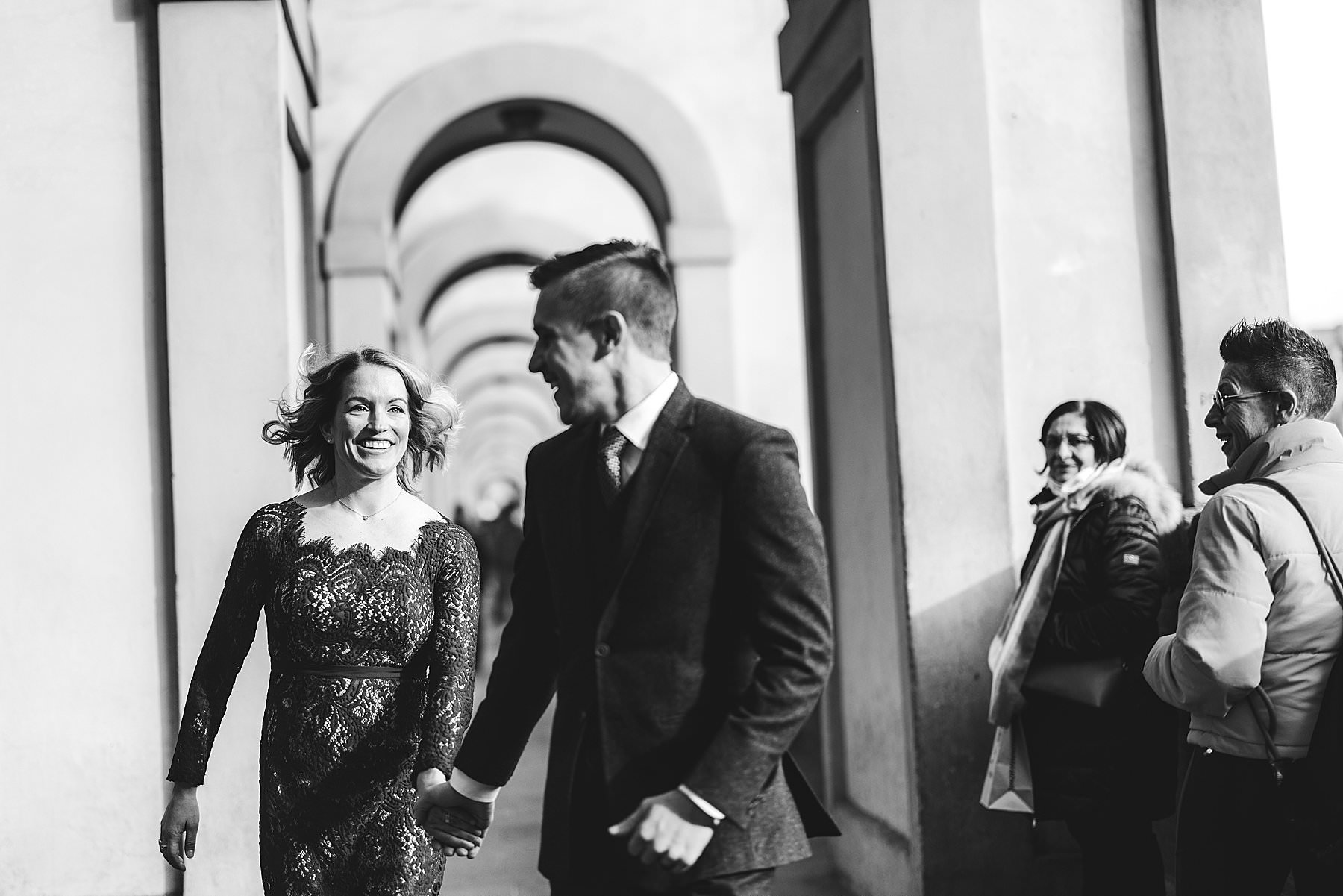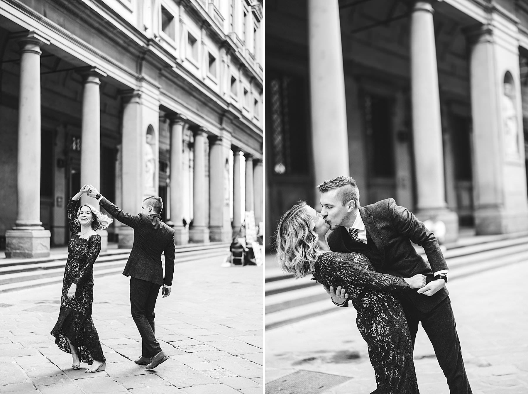 Exciting candid couple portrait wedding anniversary photo in the heart of Florence near Uffizi. Photo by the Italian elegant and creative couple portrait photographer in Tuscany based Florence Gabriele Fani