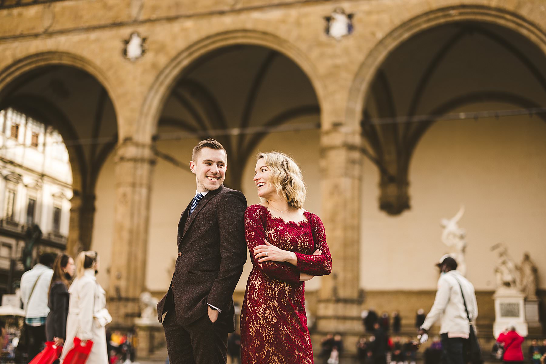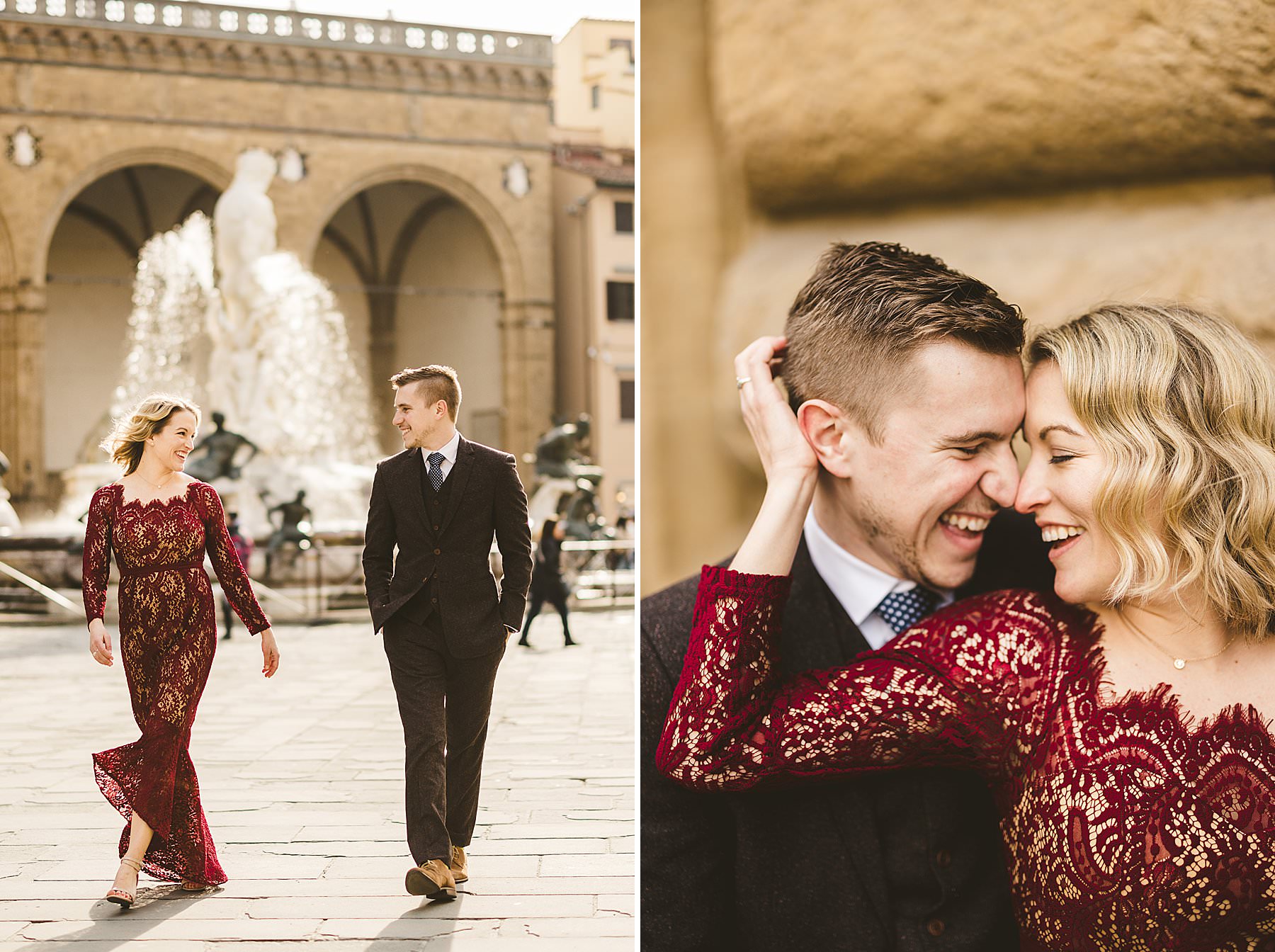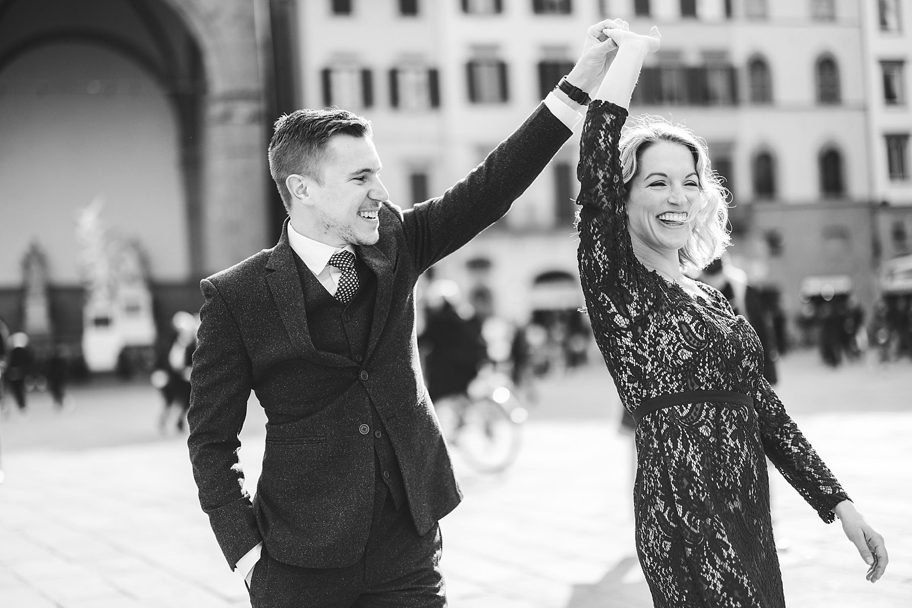 Joyful couple portrait wedding anniversary photos in the heart of Florence near Palazzo Vecchio. Photo by the Italian elegant and creative couple portrait photographer in Tuscany based Florence Gabriele Fani