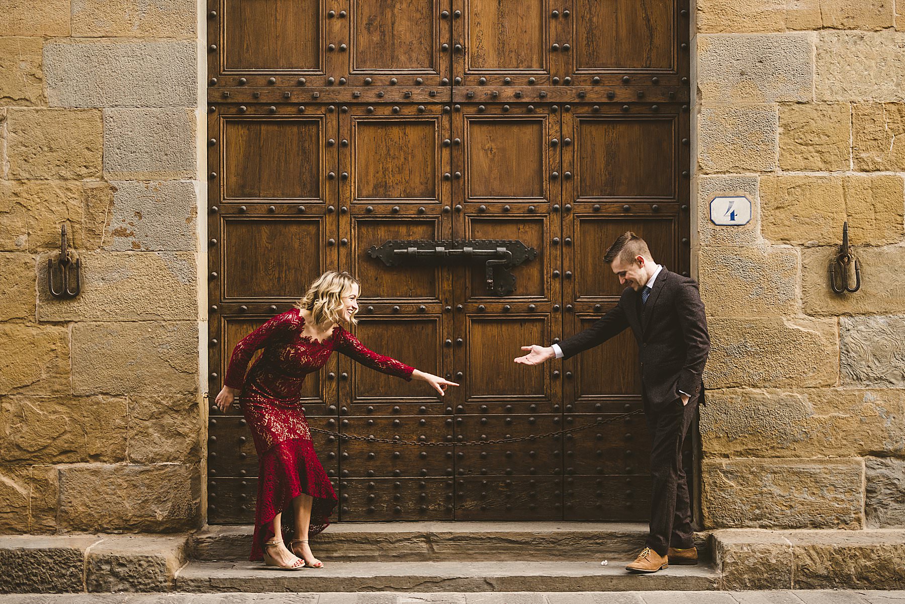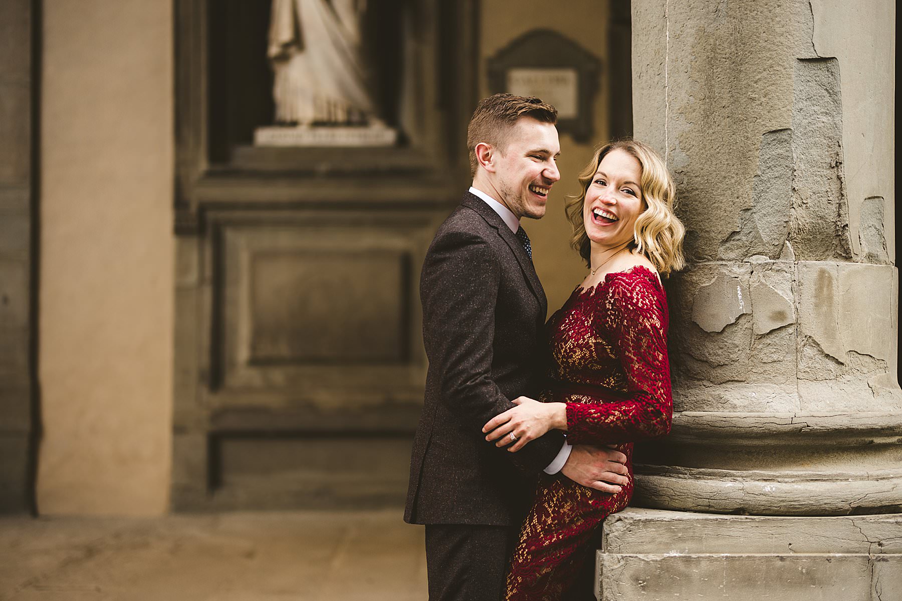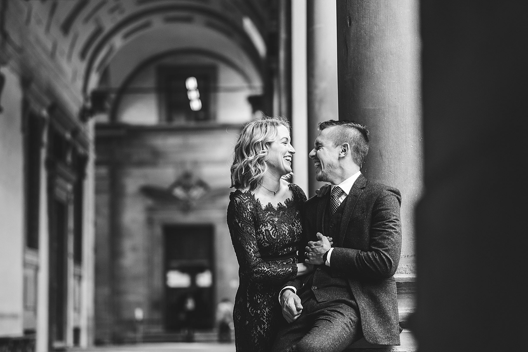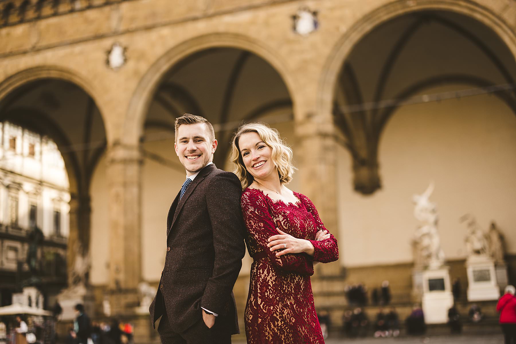Joyful couple portrait wedding anniversary photos in the heart of Florence near Palazzo Vecchio. Photo by the Italian elegant and creative couple portrait photographer in Tuscany based Florence Gabriele Fani