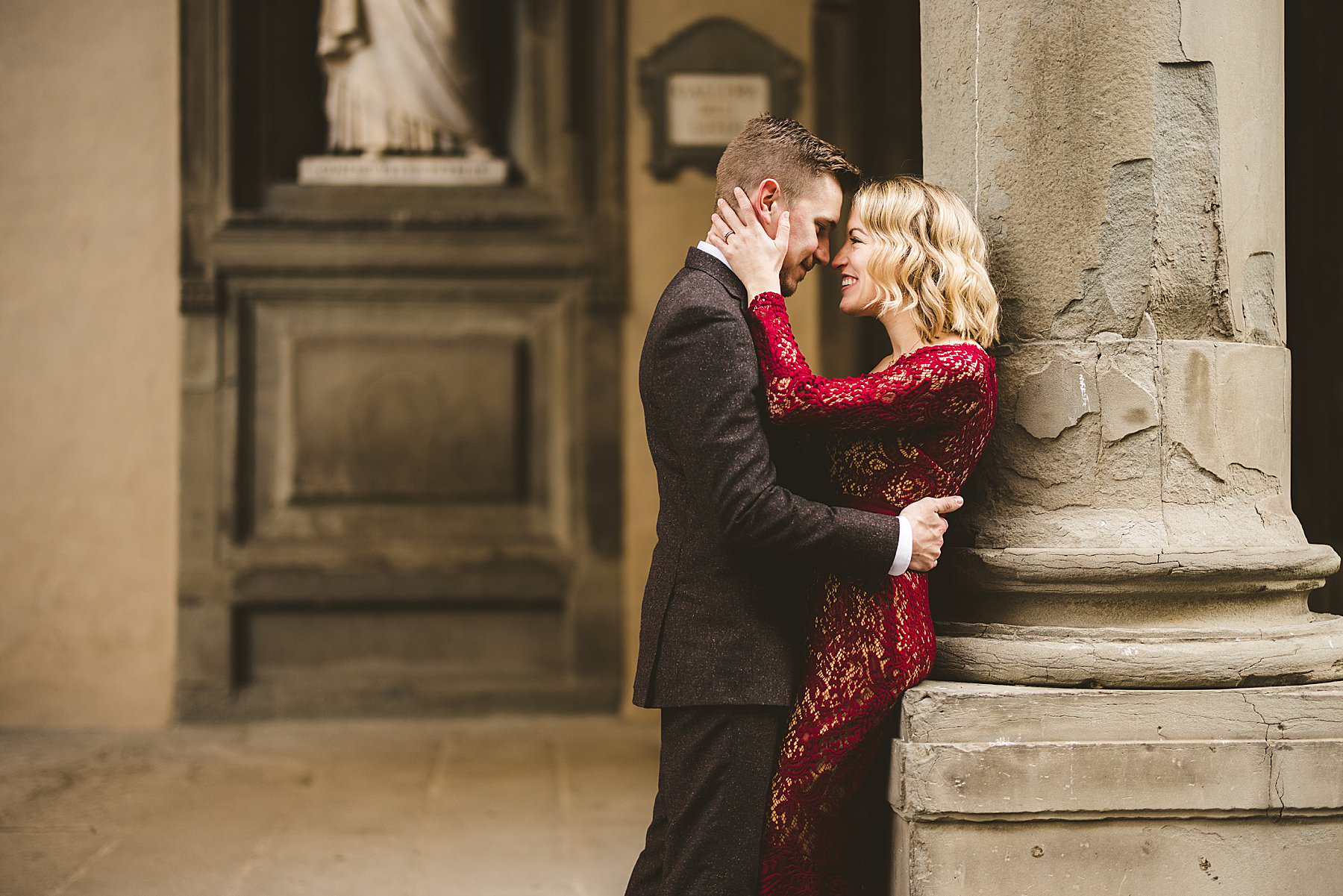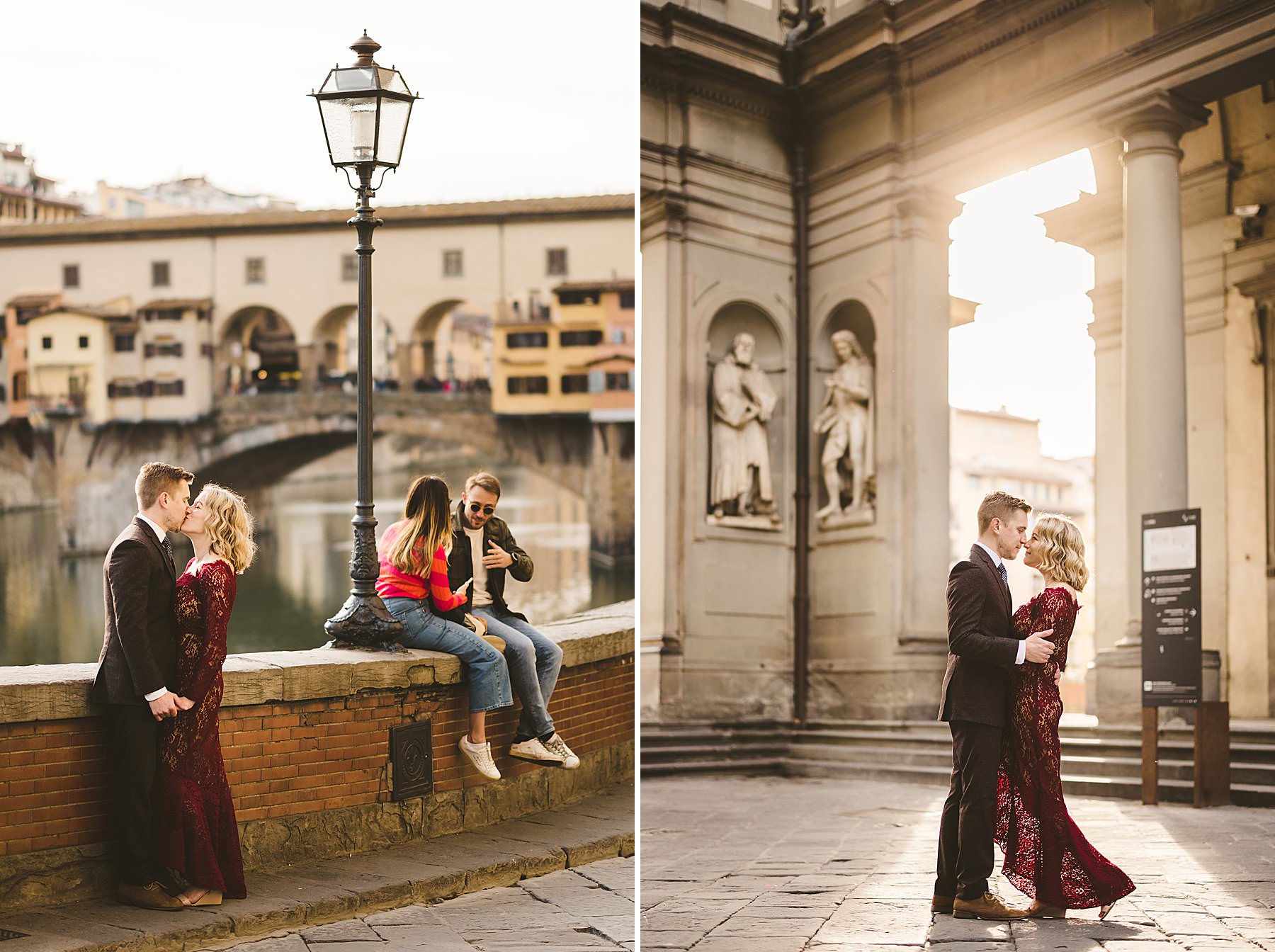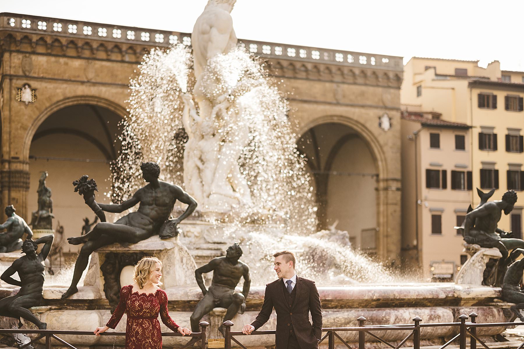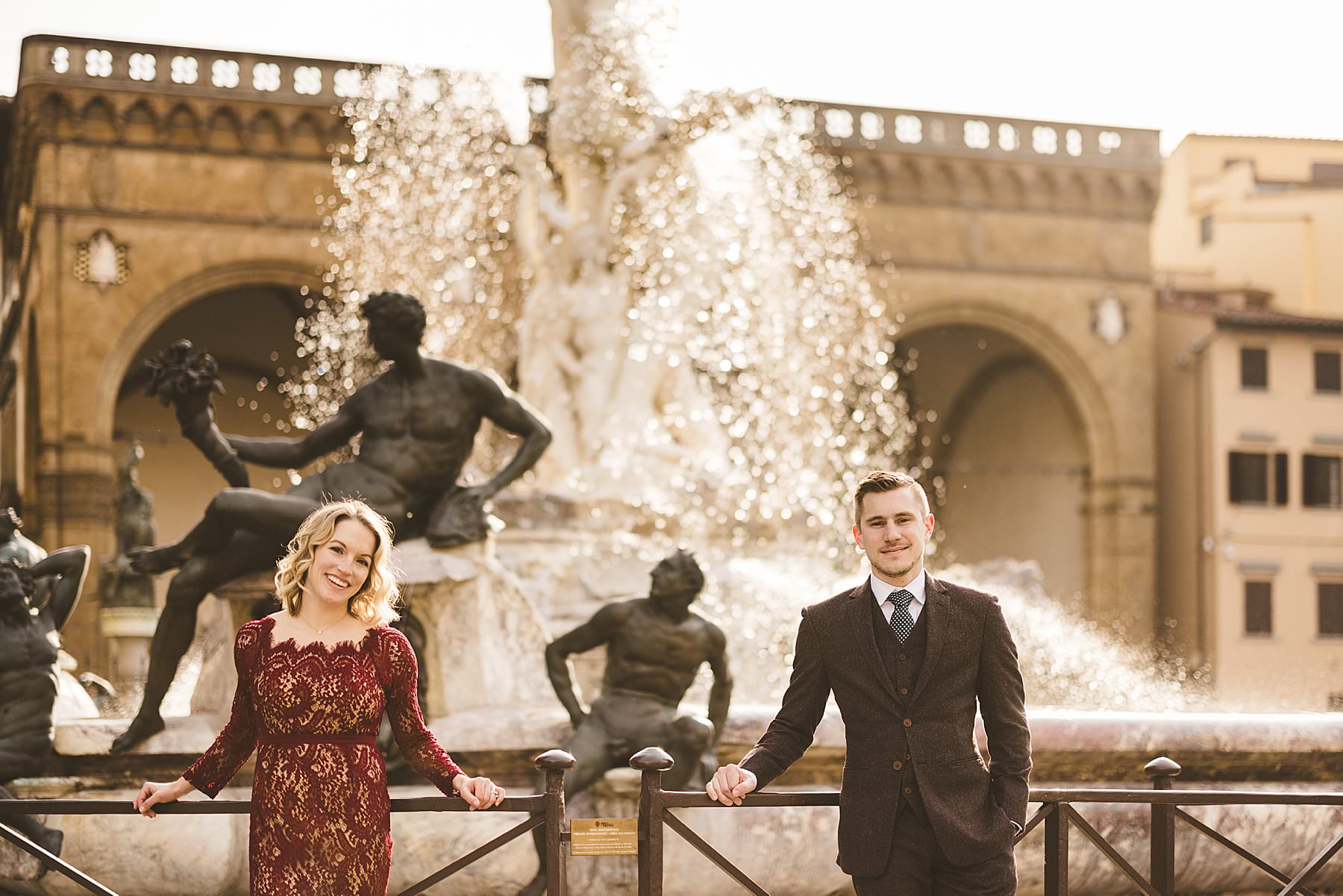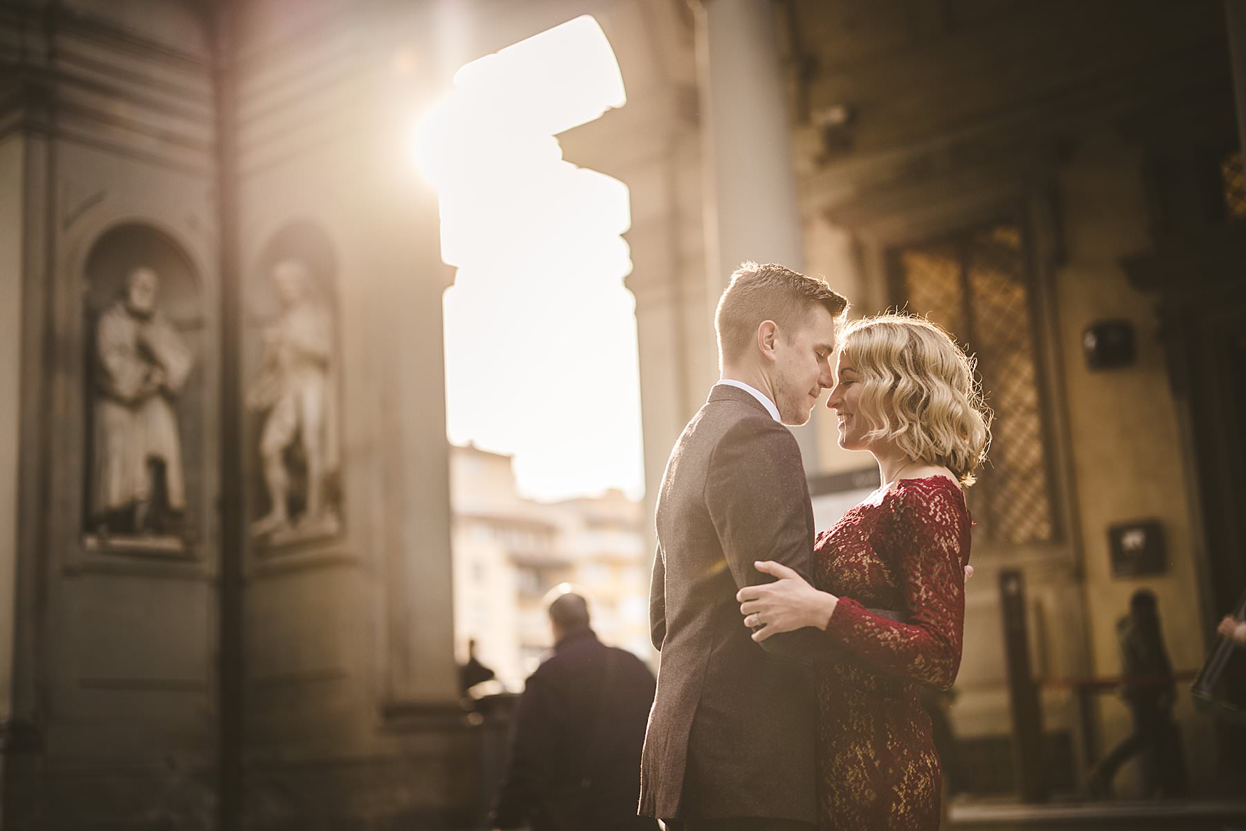 We took the first wedding anniversary photos in the historic heart of Florence, strolling around the streets near Ponte Vecchio, Piazza della Signoria and Piazza san Firenze. Amanda and Mark’s elegant outfits made an outstanding pair with the shapes and colors of that area.