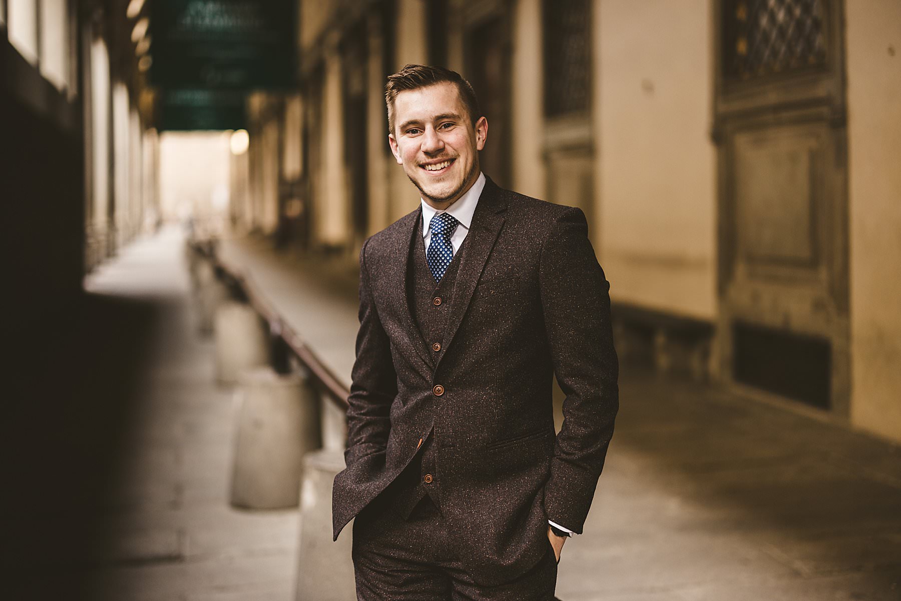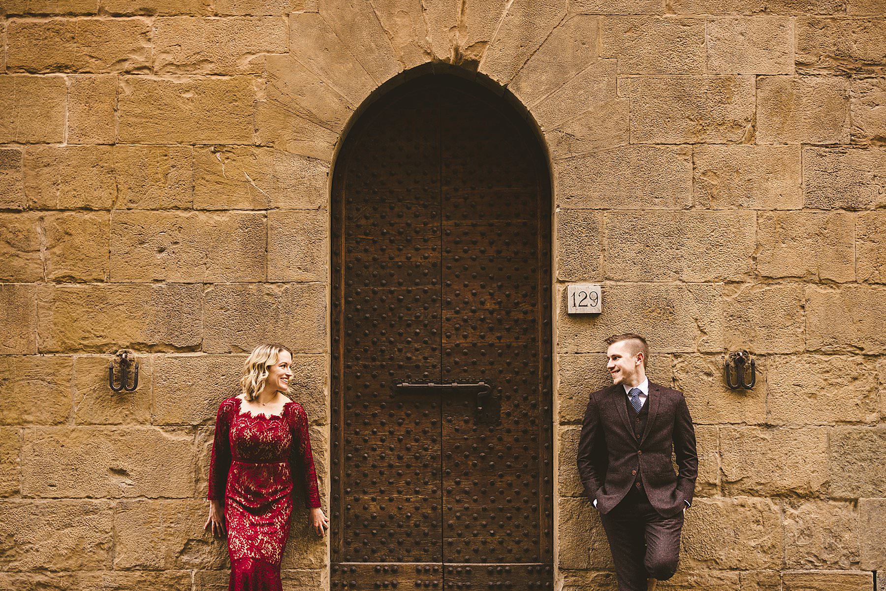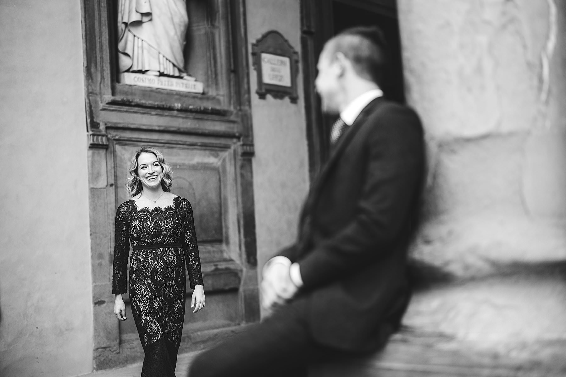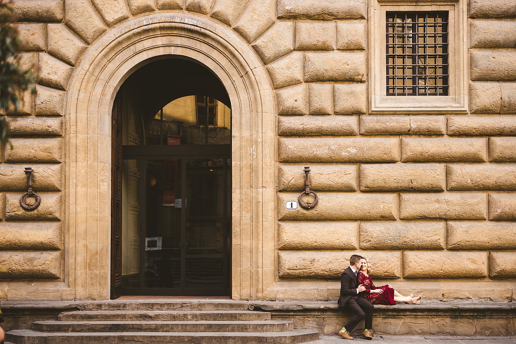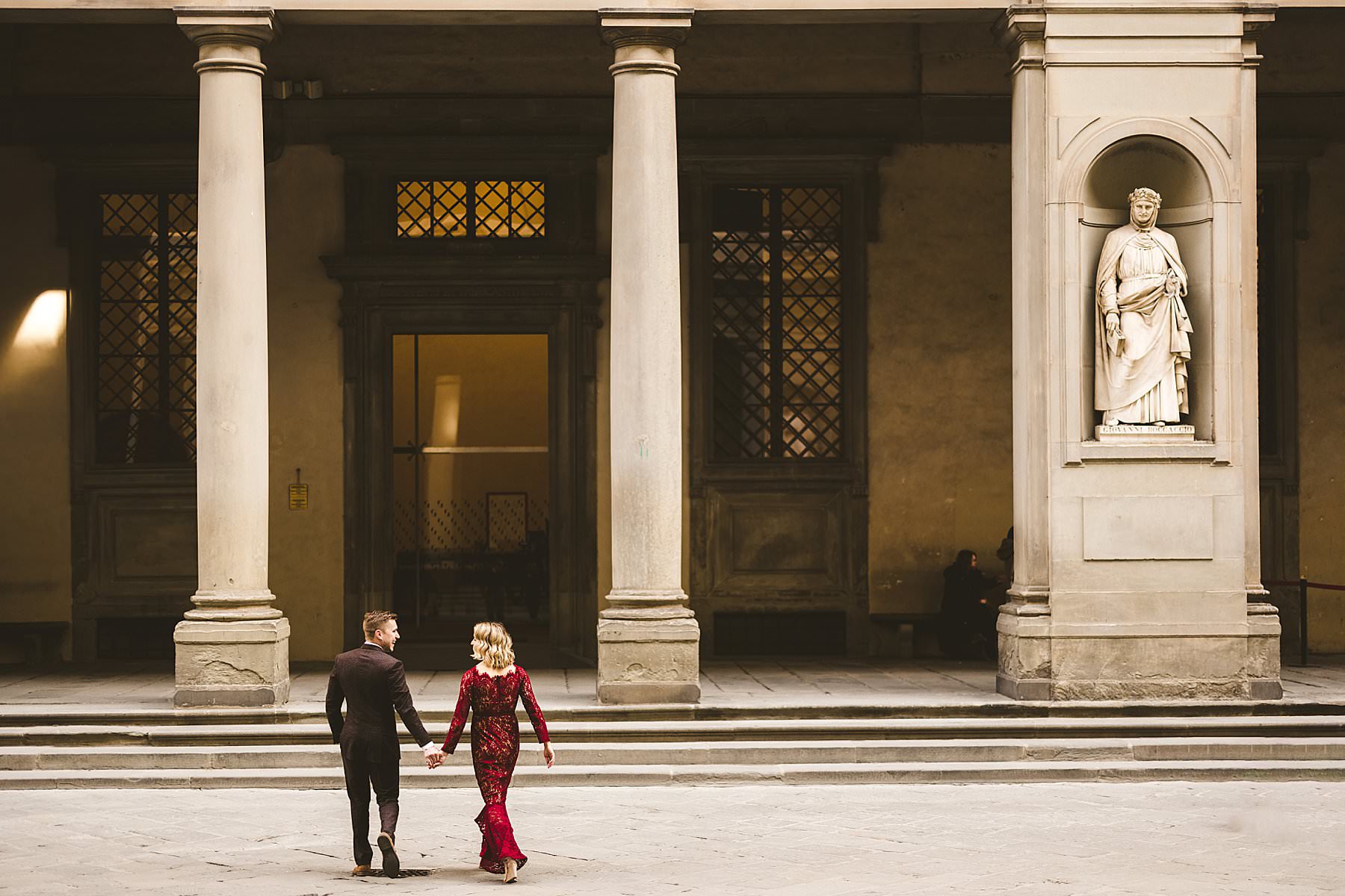 We took the first wedding anniversary photos in the historic heart of Florence, strolling around the streets near Ponte Vecchio, Piazza della Signoria and Piazza san Firenze. Amanda and Mark’s elegant outfits made an outstanding pair with the shapes and colors of that area.