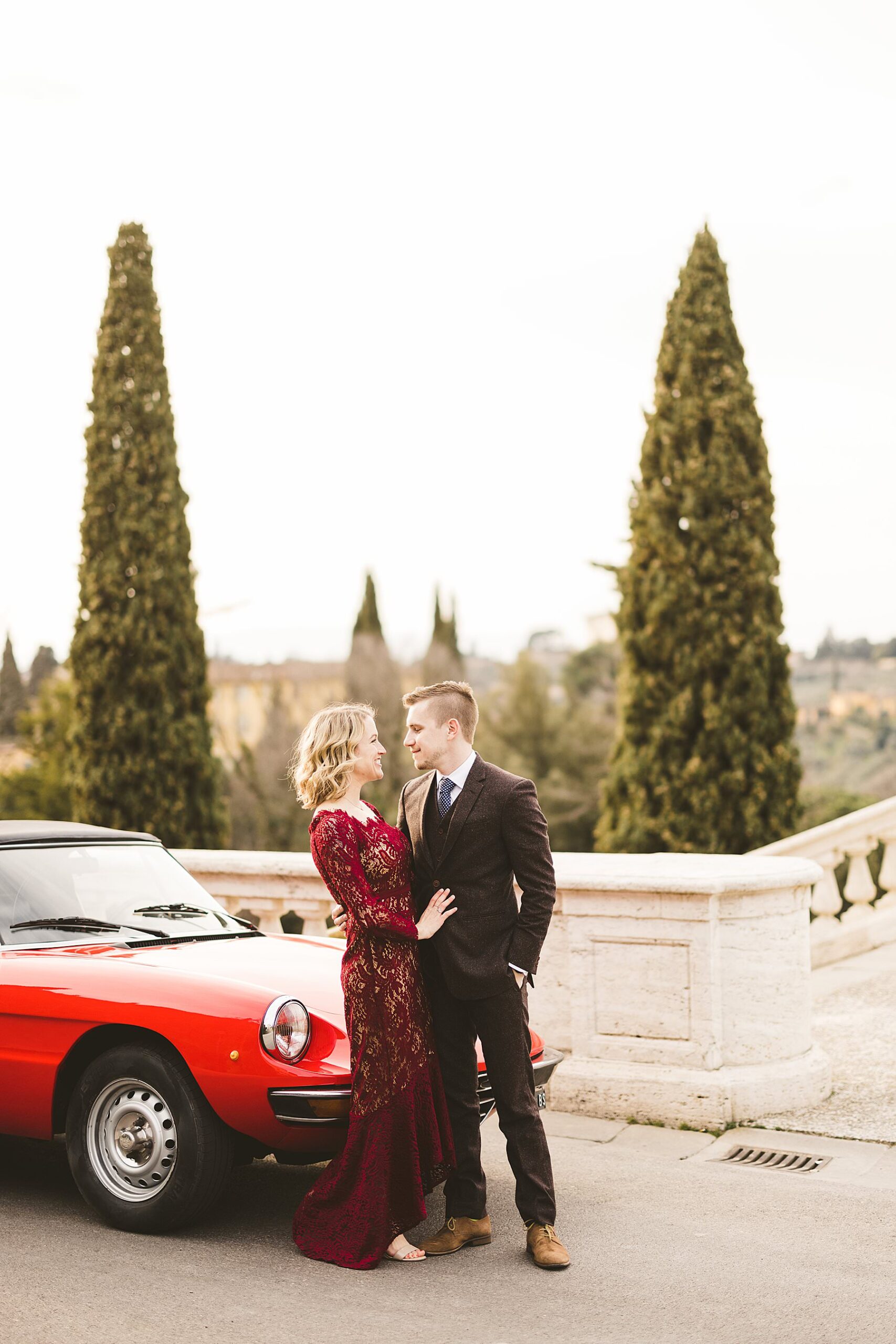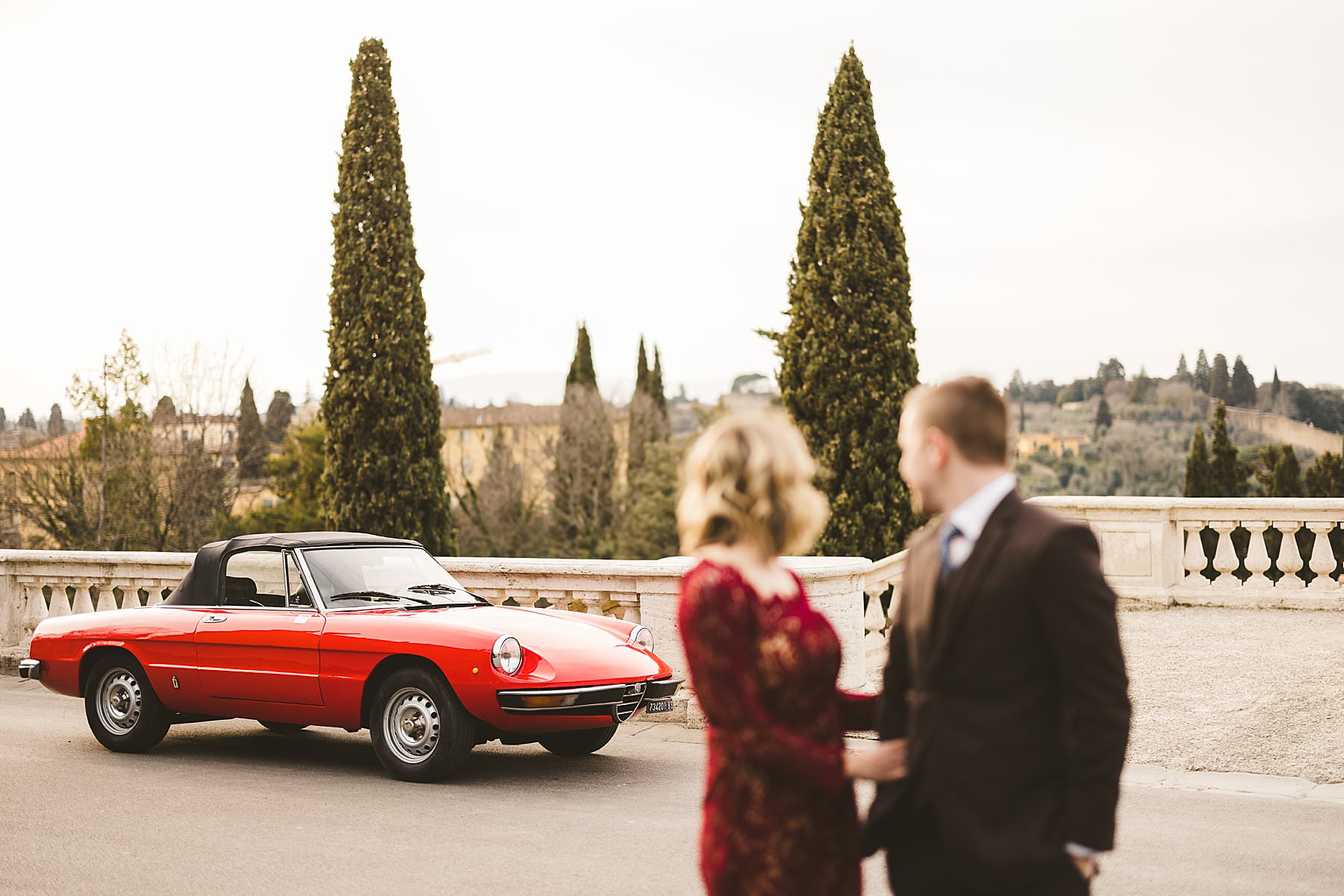 Wedding vow’s renewal anniversary photos in Florence with bright-red Alfa Romeo spider an unforgettable celebration. Photo by the Italian elegant and creative couple portrait photographer in Tuscany based Florence Gabriele Fani