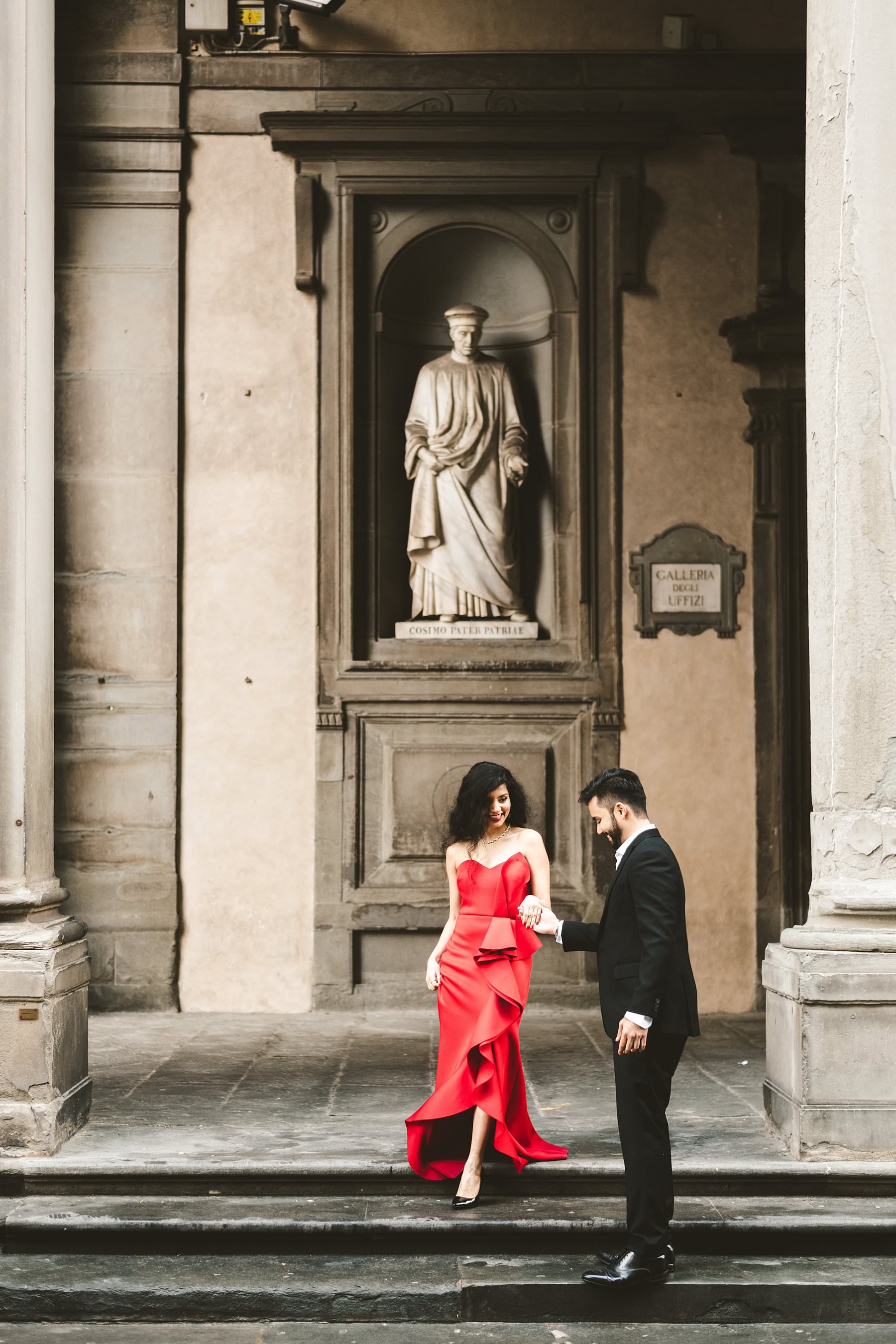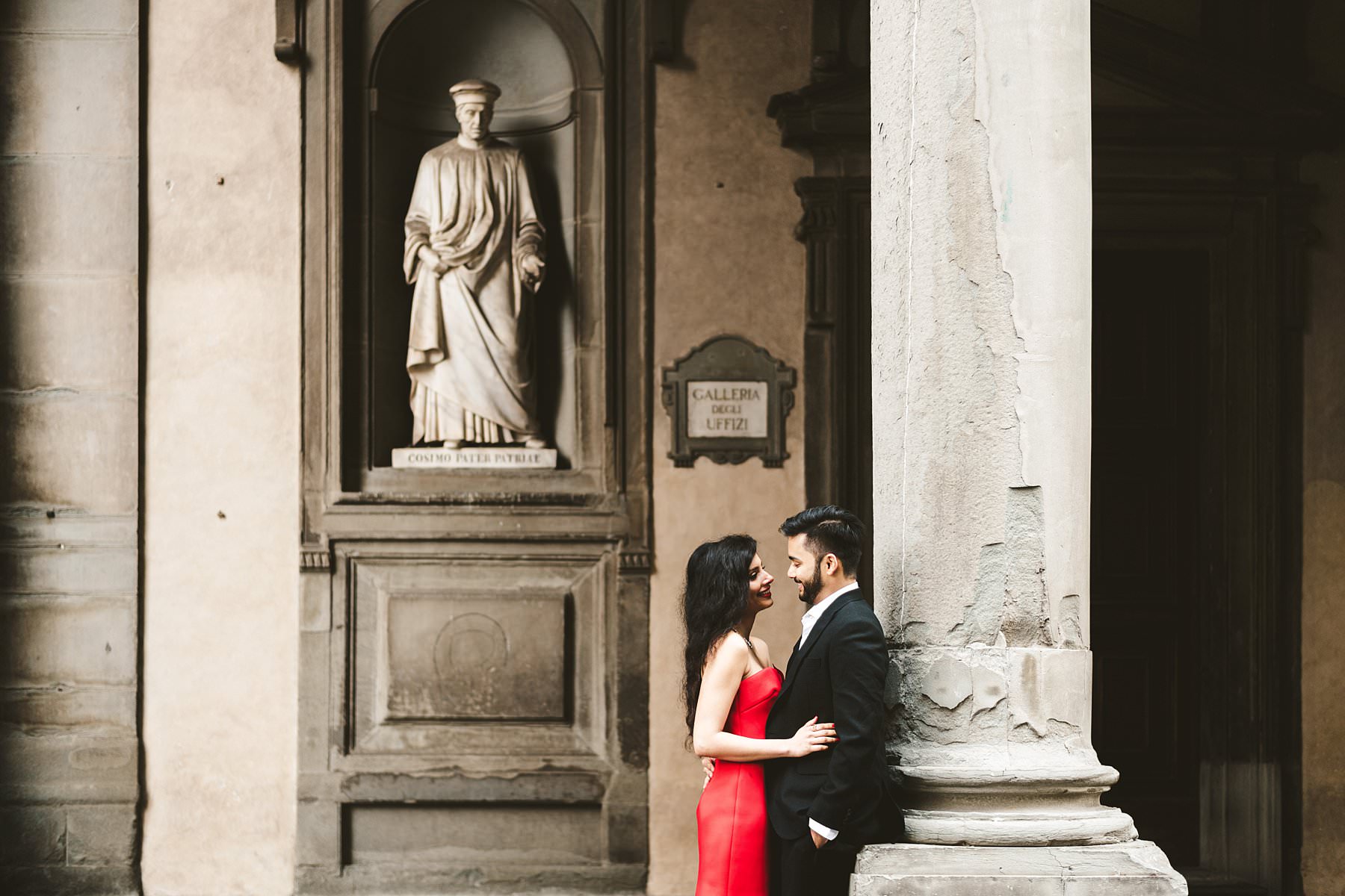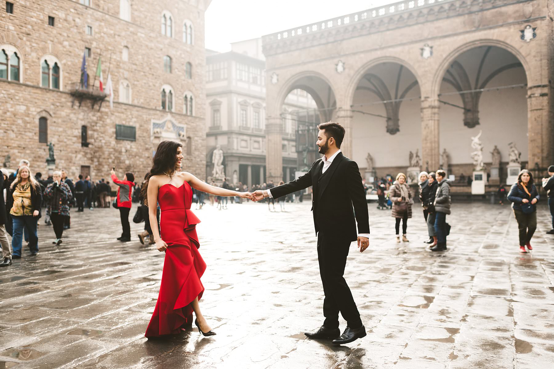 The magic of winter engagement photos. If Florence in winter wasn’t perfect itself as a destination engagement setting, Pryia definitely contributed to making it even more fascinating thanks to the stunning red dress she wore during the shooting. She lit up that foggy day and the eyes of every passer-by were on her. We started taking their destination engagement photos at the Duomo, with its white-and-green marble geometry as a background, then walked all over the heart of the city. Piazza della Signoria, Uffizi Gallery, Ponte Vecchio, Via de’ Tornabuoni: Pryia and Sid floated around, unconcerned by the cold temperature and focused only on their love. Photo by the elegant and modern engagement pre-wedding photographer in Tuscany based in Florence Gabriele Fani