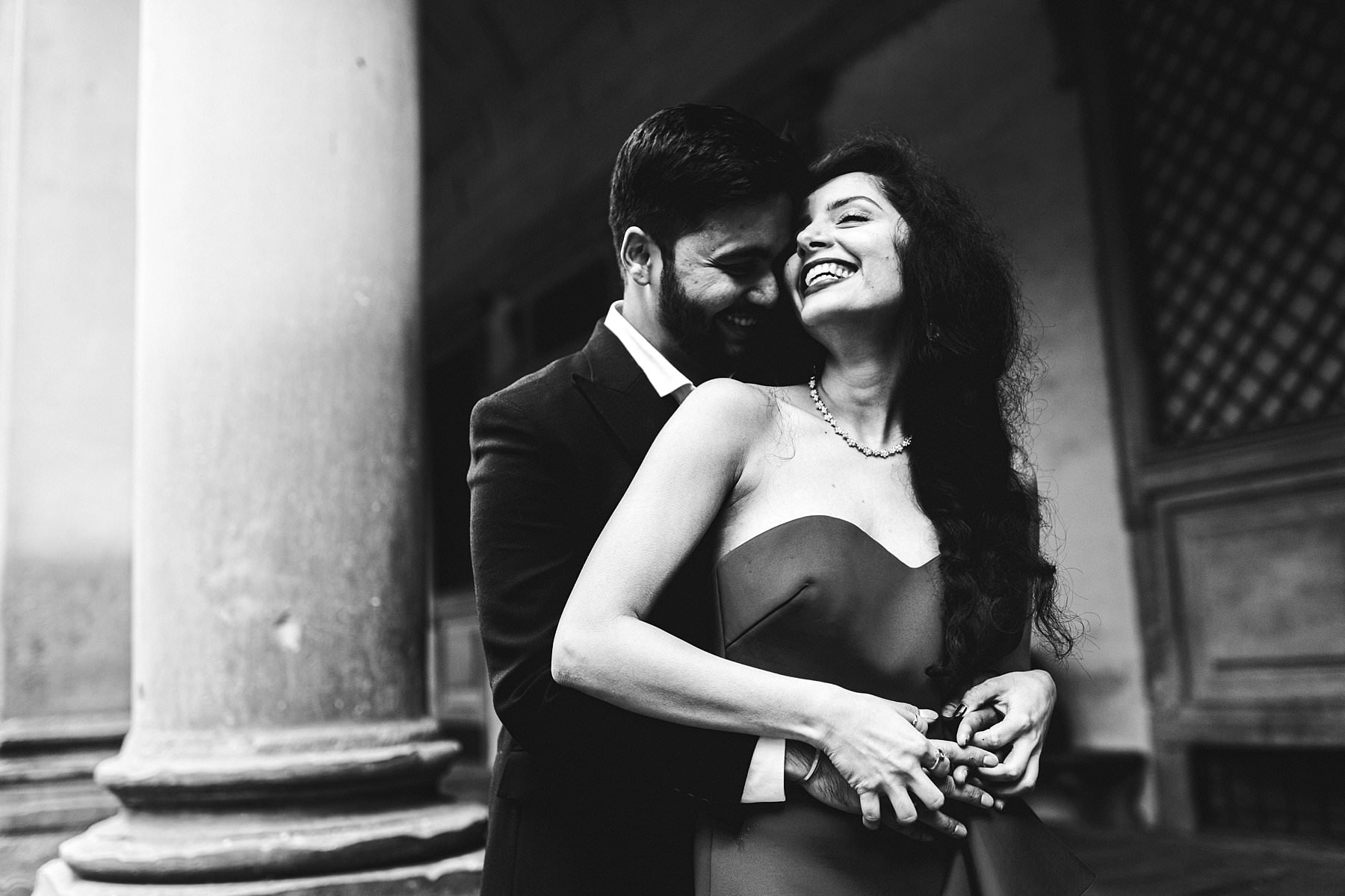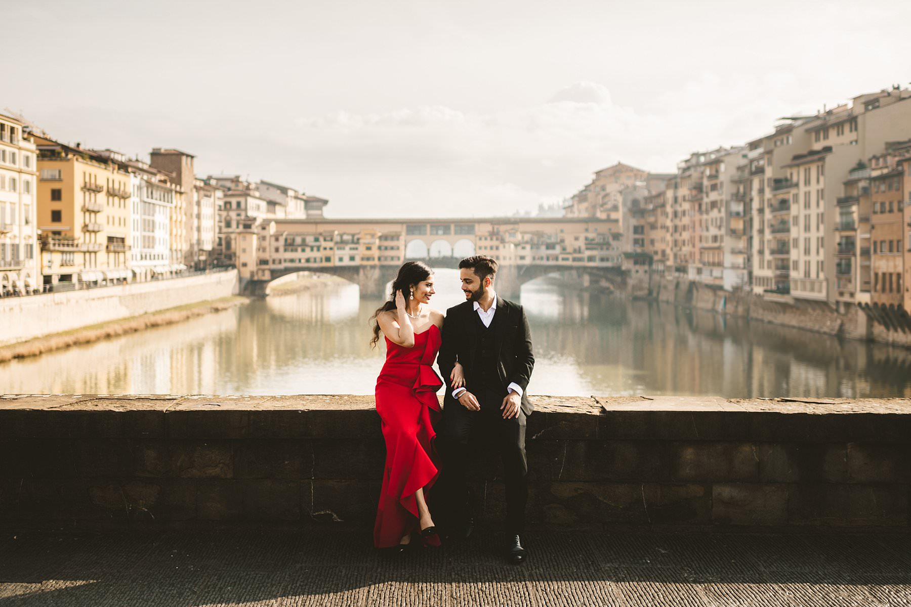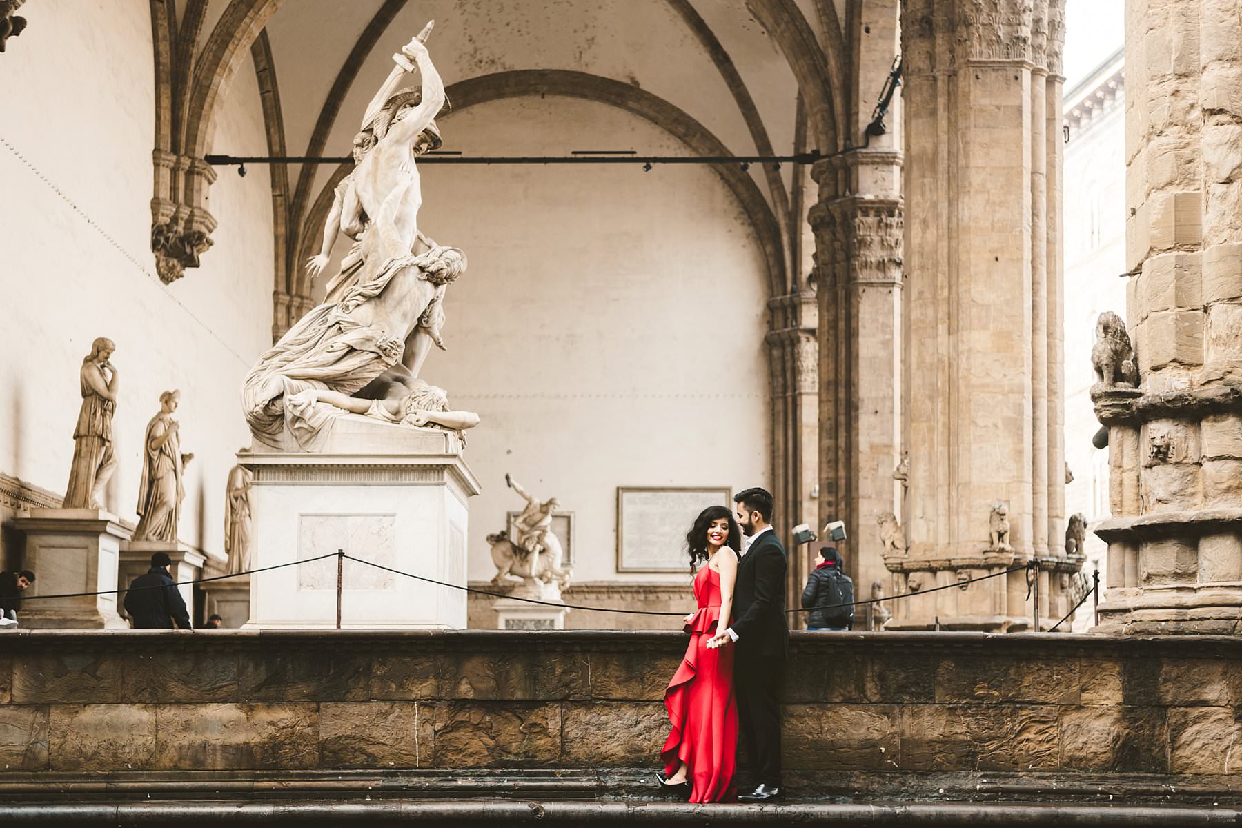 The magic of winter engagement photos. If Florence in winter wasn’t perfect itself as a destination engagement setting, Pryia definitely contributed to making it even more fascinating thanks to the stunning red dress she wore during the shooting. She lit up that foggy day and the eyes of every passer-by were on her. We started taking their destination engagement photos at the Duomo, with its white-and-green marble geometry as a background, then walked all over the heart of the city. Piazza della Signoria, Uffizi Gallery, Ponte Vecchio, Via de’ Tornabuoni: Pryia and Sid floated around, unconcerned by the cold temperature and focused only on their love. Photo by the elegant and modern engagement pre-wedding photographer in Tuscany based in Florence Gabriele Fani