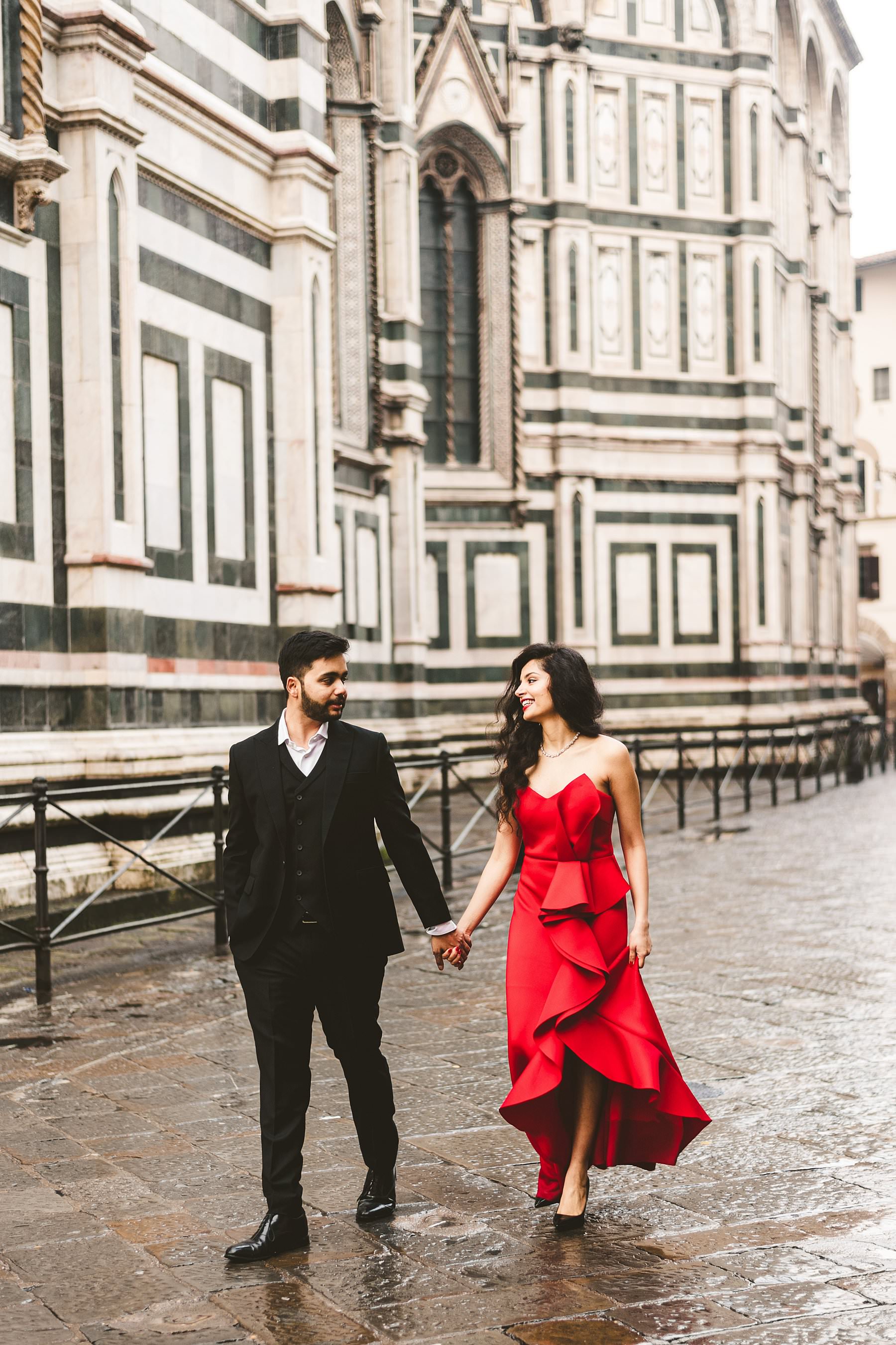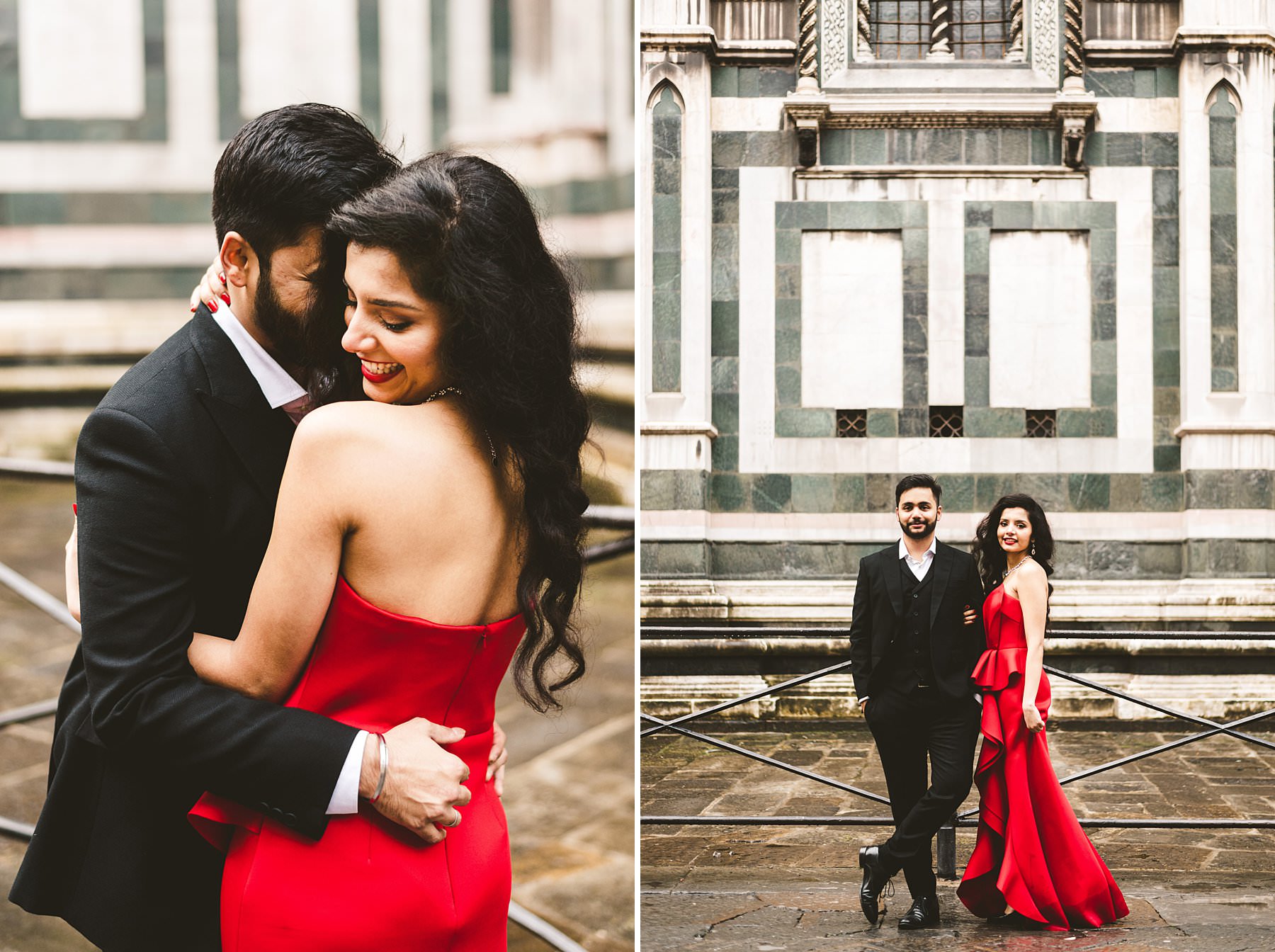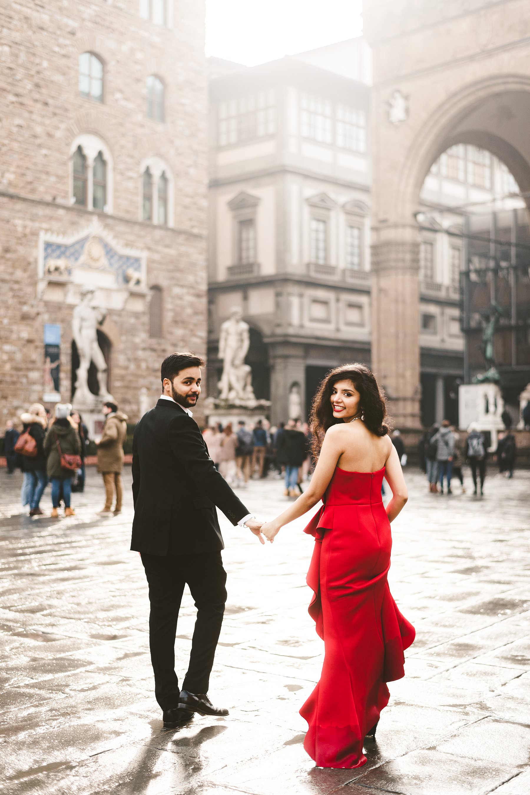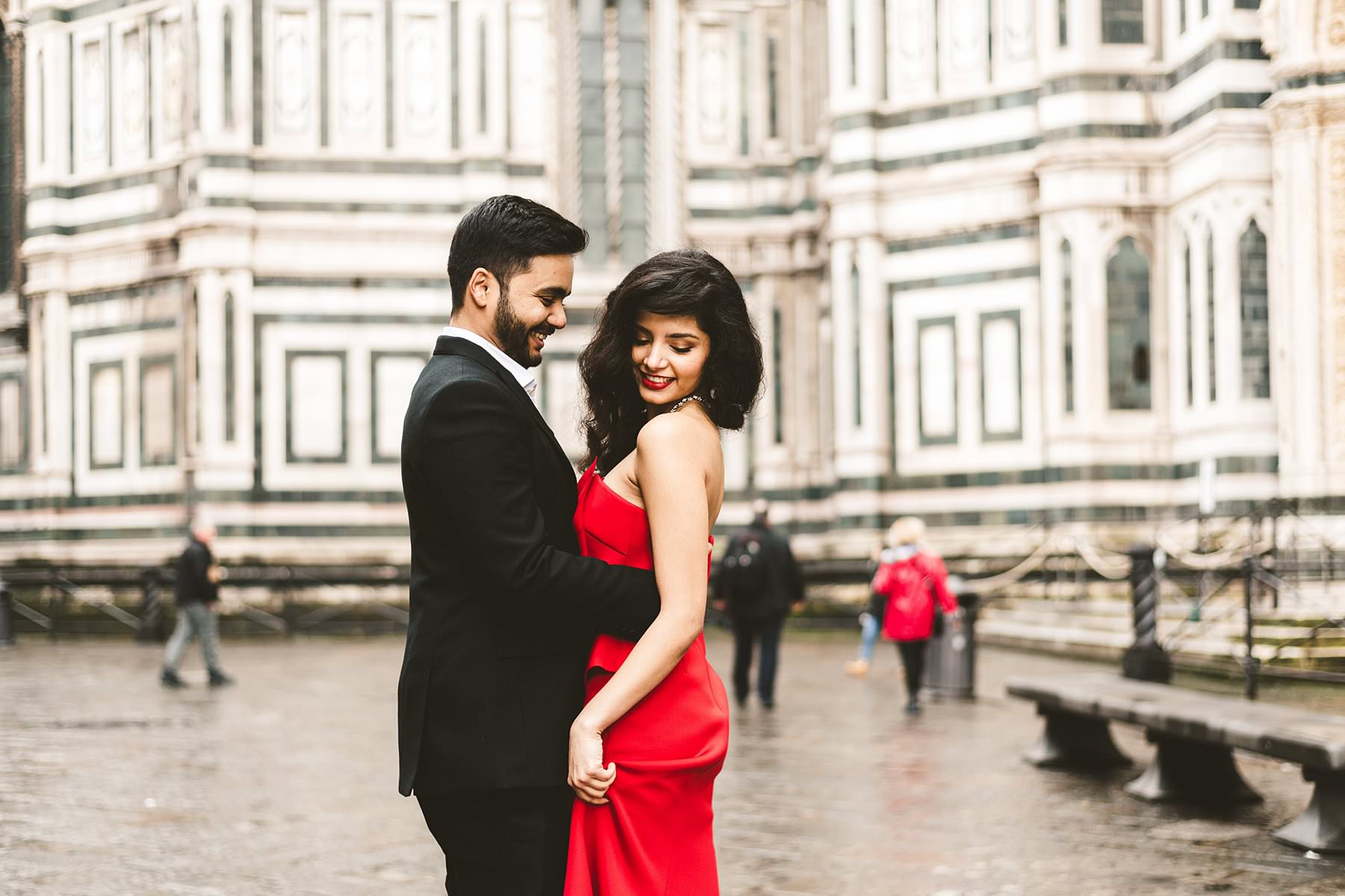 If Florence in winter wasn’t perfect itself as a destination engagement setting, Priya definitely contributed to making it even more fascinating thanks to the stunning red dress she wore during the shooting. She lit up that foggy day and the eyes of every passer-by were on her.