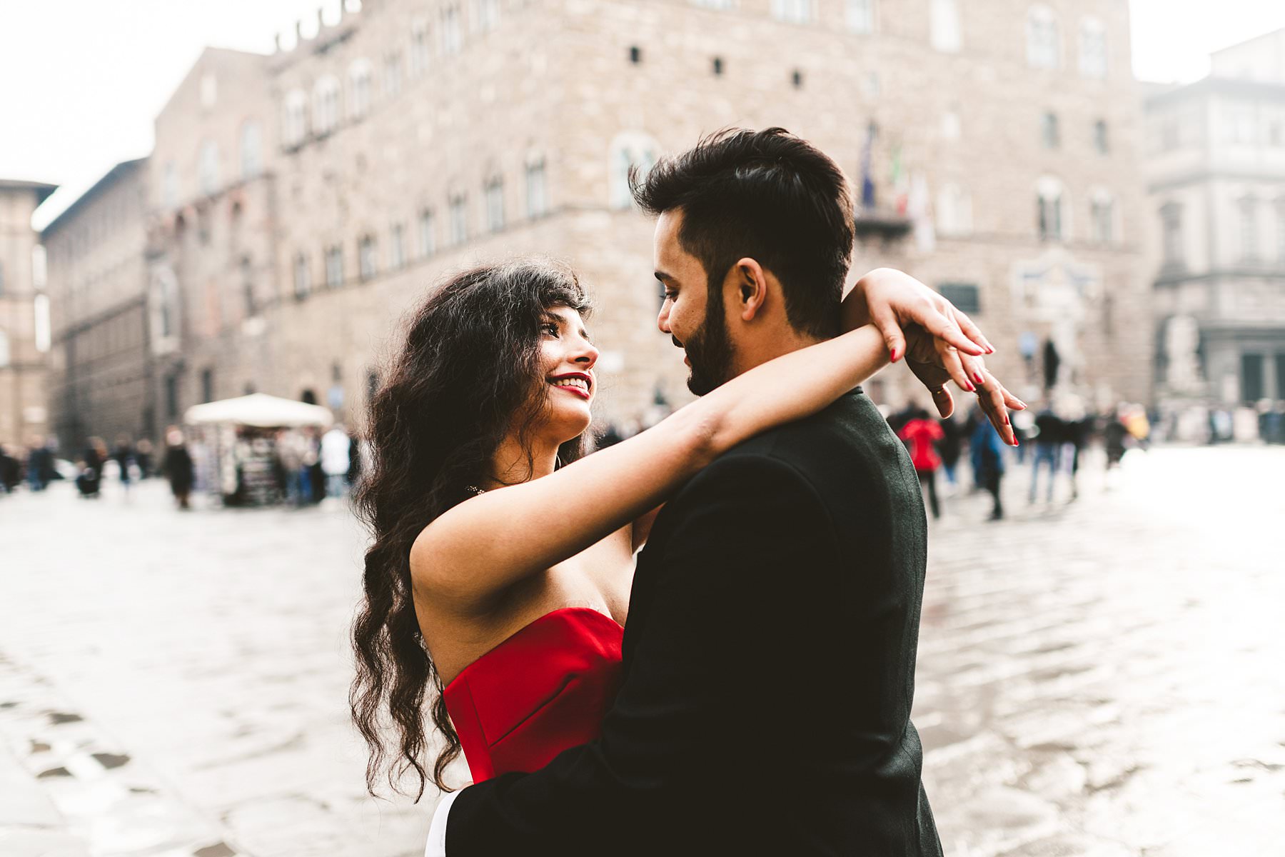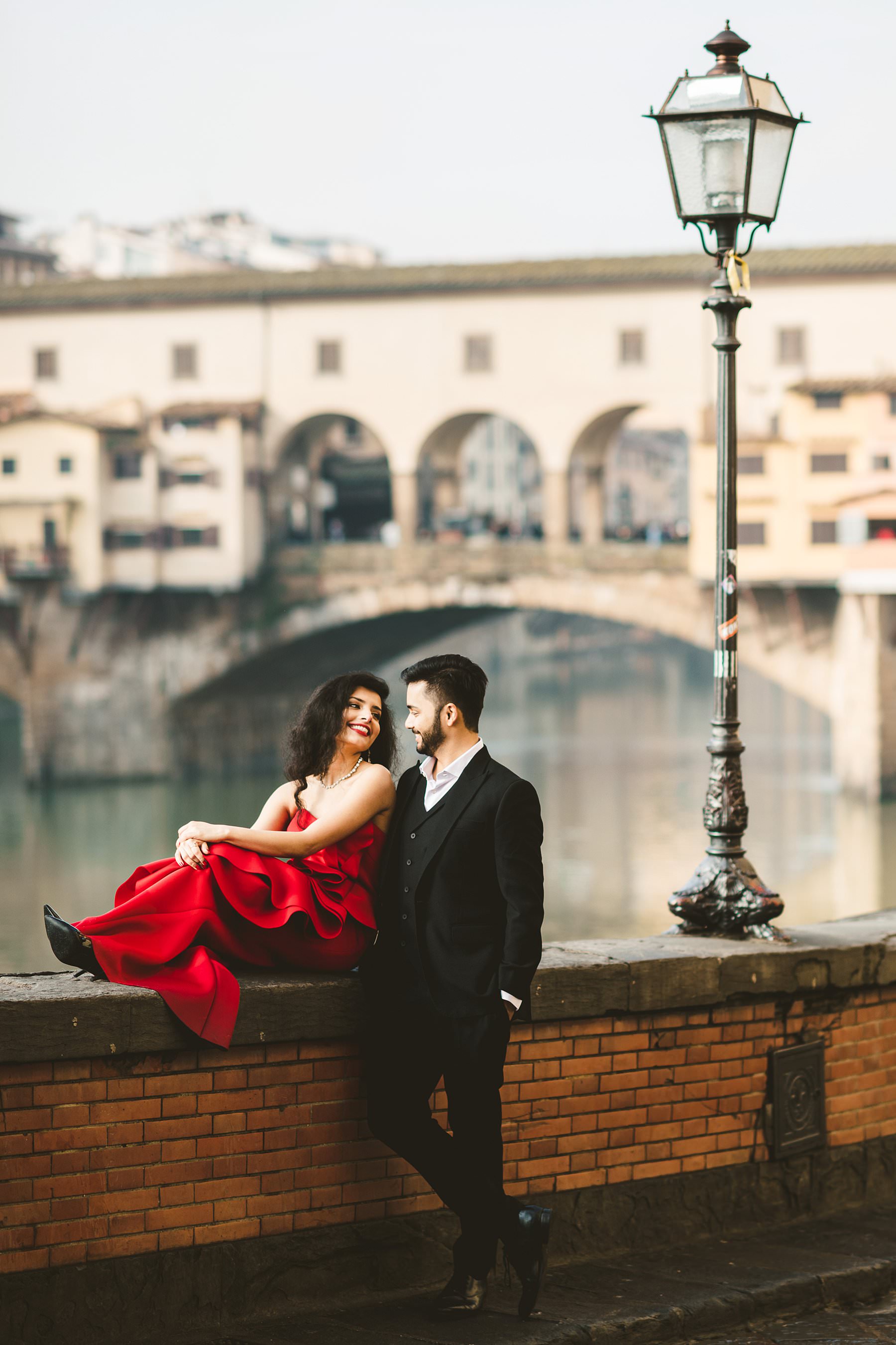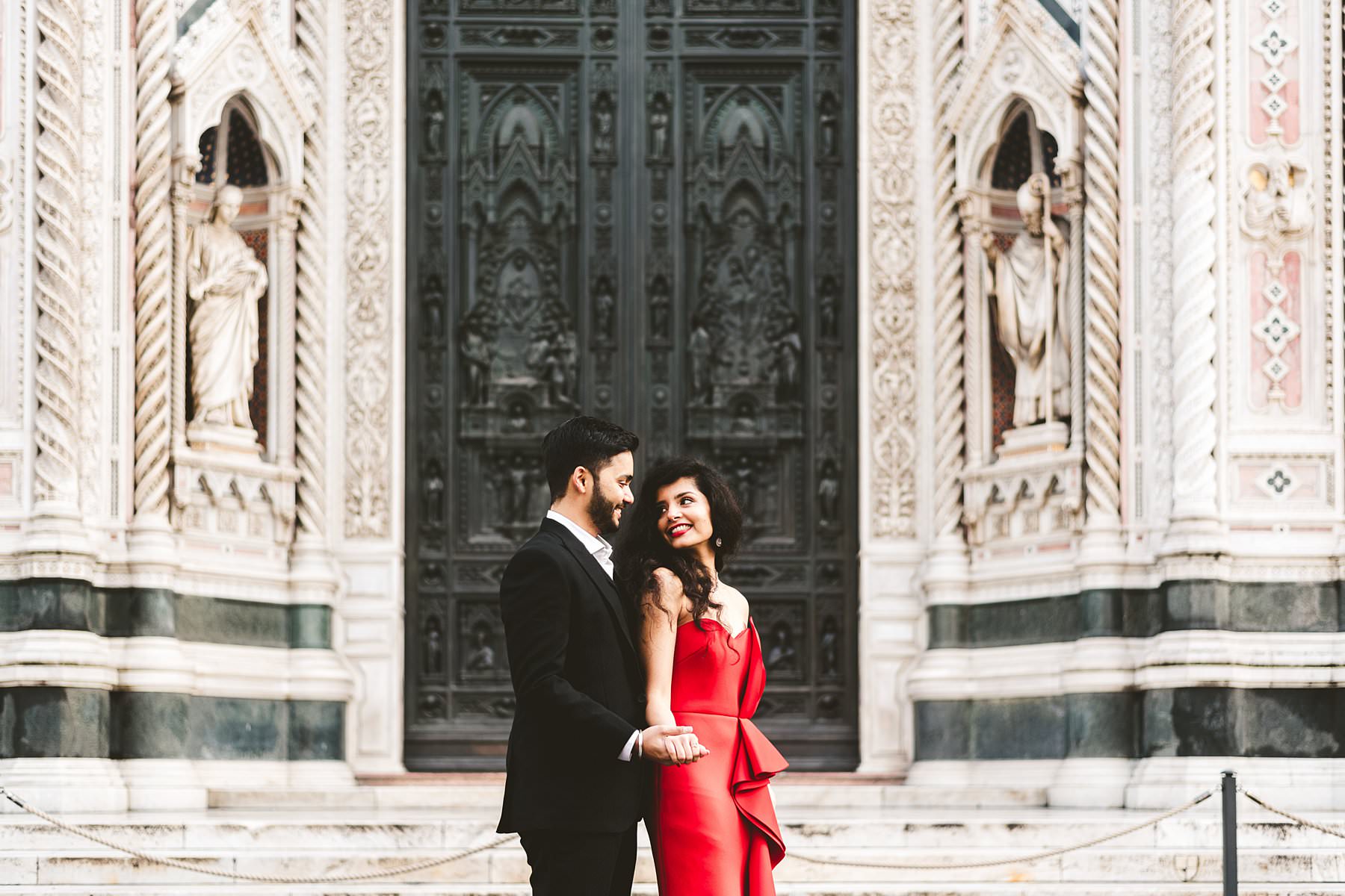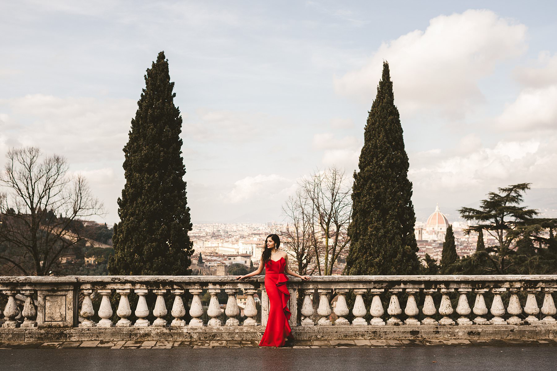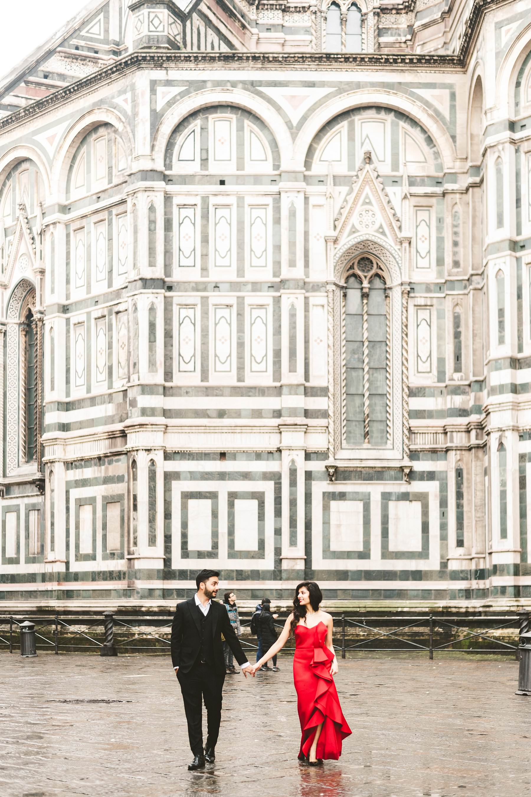 If Florence in winter wasn’t perfect itself as a destination engagement setting, Priya definitely contributed to making it even more fascinating thanks to the stunning red dress she wore during the shooting. She lit up that foggy day and the eyes of every passer-by were on her.