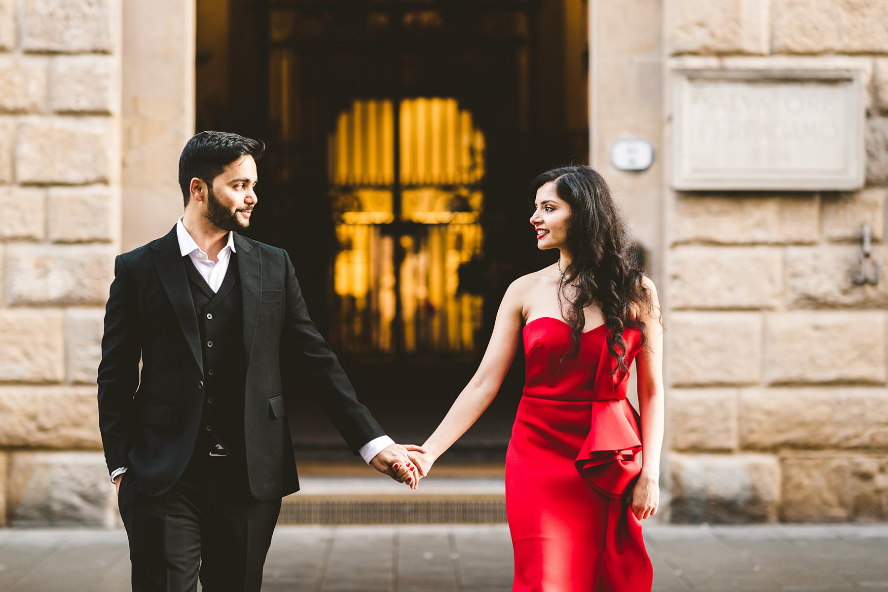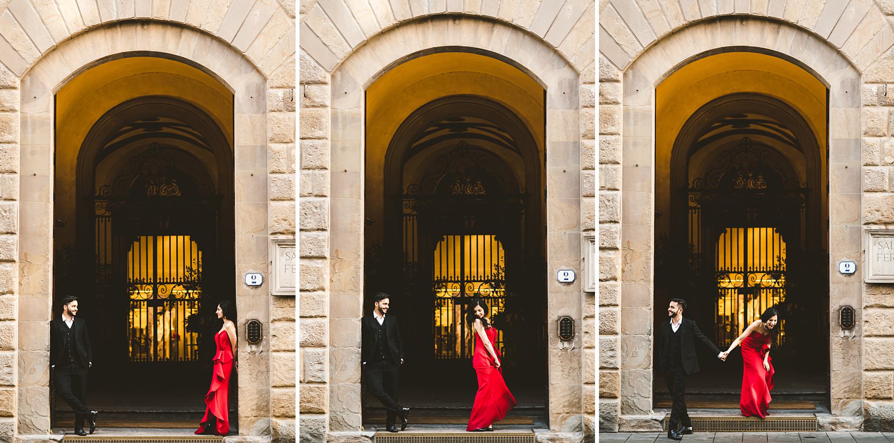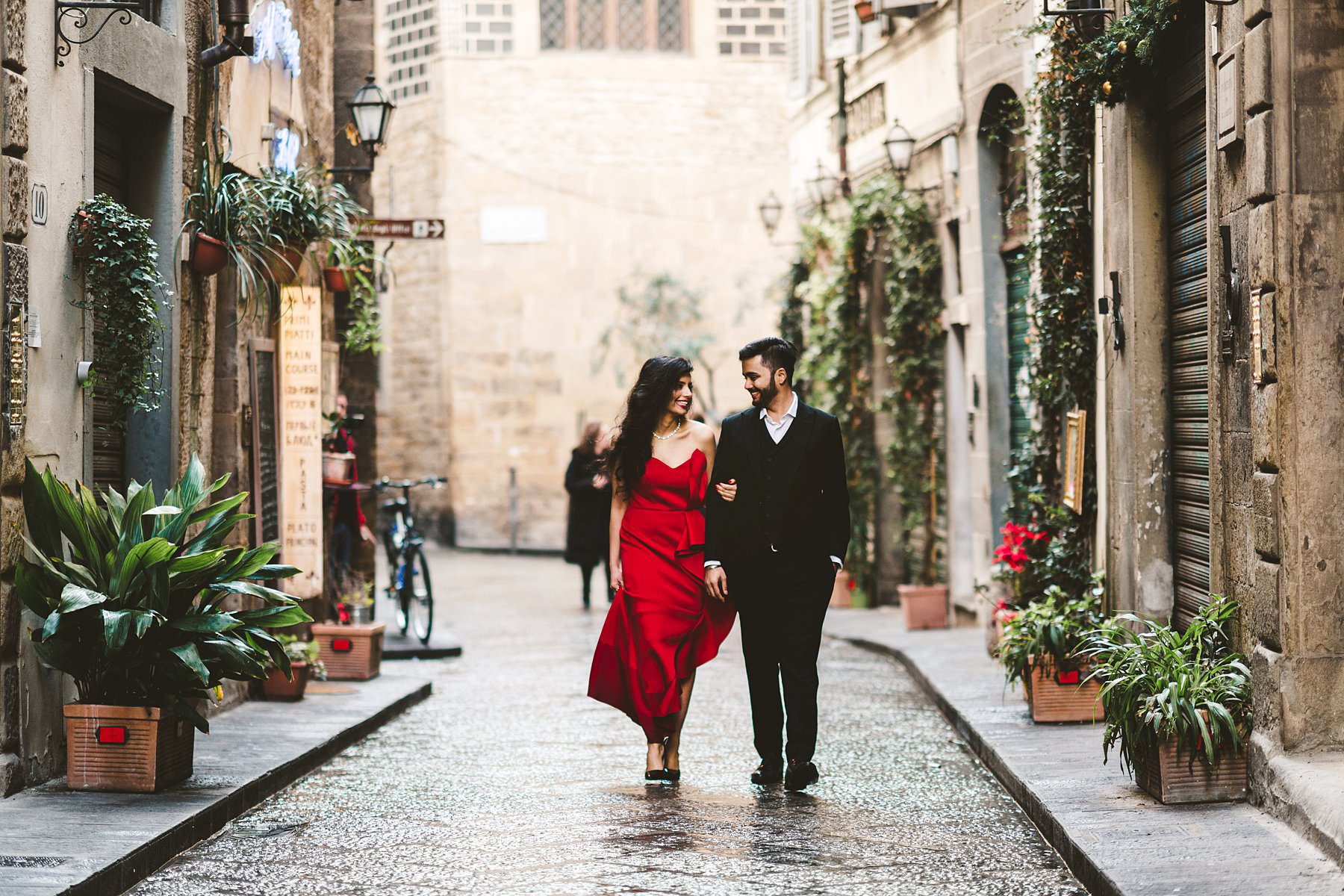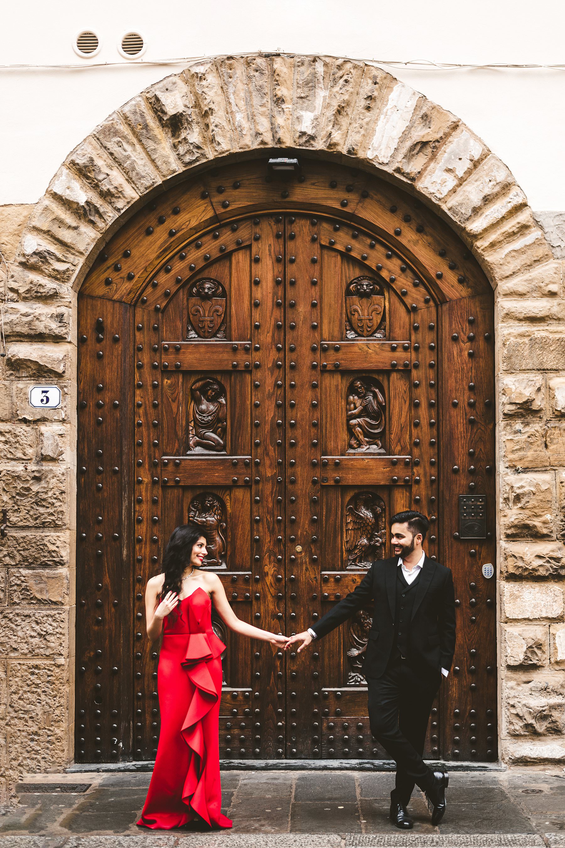If Florence in winter wasn’t perfect itself as a destination engagement setting, Priya definitely contributed to making it even more fascinating thanks to the stunning red dress she wore during the shooting. She lit up that foggy day and the eyes of every passer-by were on her.