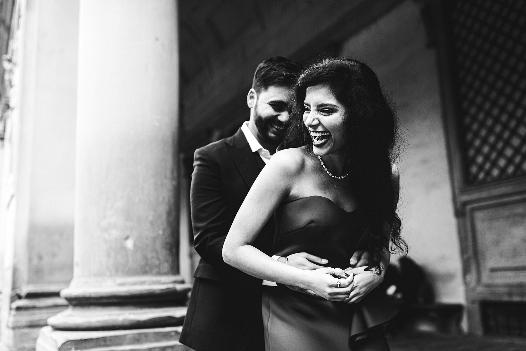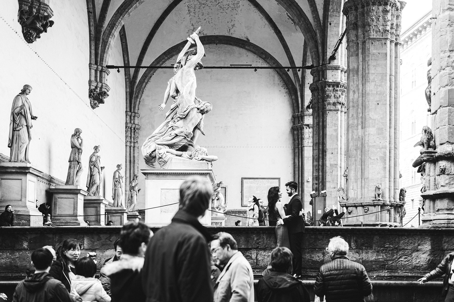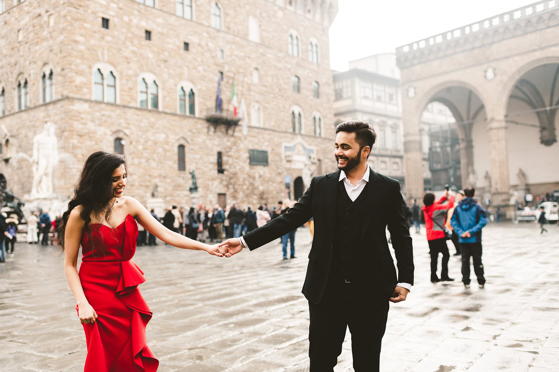 Exciting and fun walk tour photo shoot experience in the heart of Florence near Uffizi and Ponte Vecchio. Photo by the elegant and modern engagement pre-wedding photographer in Tuscany based in Florence Gabriele Fani