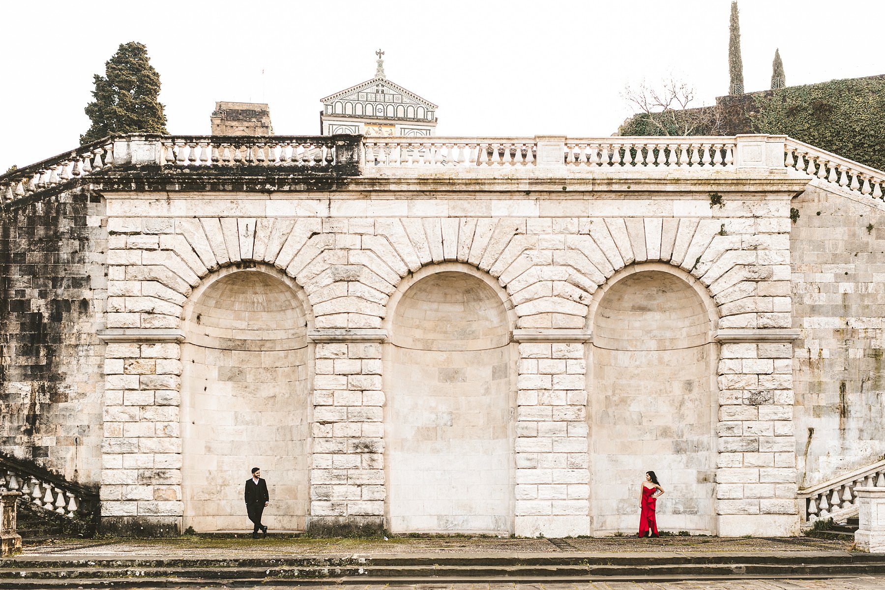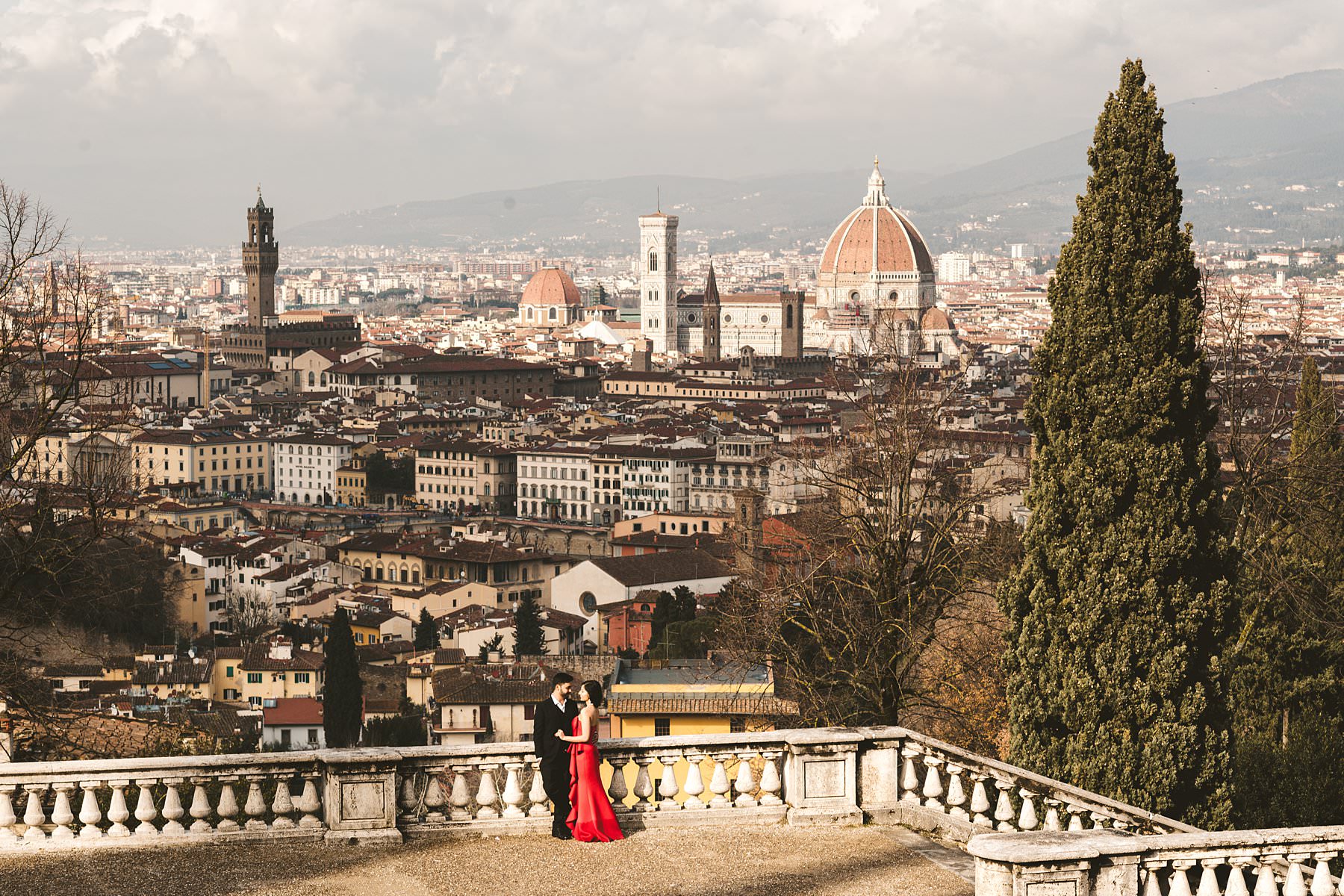 But first, they decided to gift themselves with a destination engagement: they chose Florence, and they reached it a few weeks before their Big Day. We were in the middle of winter and the days they spent in Tuscany were incredibly rainy. But the power of love worked: we were lucky enough to have half a day without rain. The fog tried to ruin our plans of taking engagement photos with a panoramic view, but I was able to change our schedule last minute and make the most out of the weather conditions. You can see it yourself!