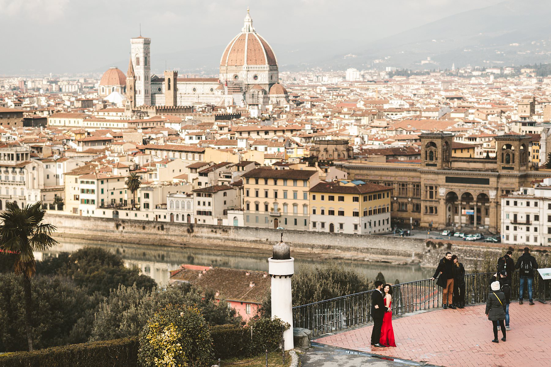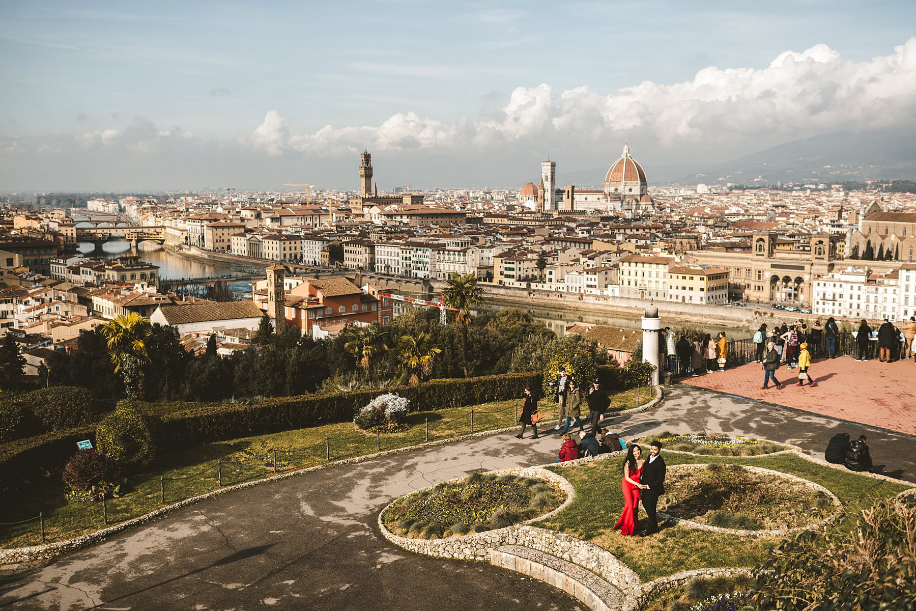 Elegant and lovely winter engagement photo shoot in the most iconic spot of Florence near Piazzale Michelangelo. Photo by the elegant and modern engagement pre-wedding photographer in Tuscany based in Florence Gabriele Fani